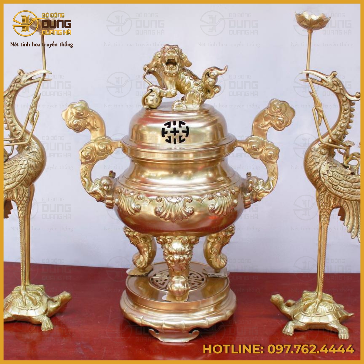 Bộ tam sự hạc bằng đồng là một trong những bộ đồ thờ mang đậm bản sắc văn hóa Việt, gồm ba vật phẩm linh thiêng: lư hương đặt ở trung tâm và đôi hạc đồng chầu hai bên. Lư hương có dáng tròn đầy đặn, thân đúc dày chắc khỏe, thể hiện sự vững vàng và bền bỉ theo năm tháng. Trên thân lư là những đường chạm tinh tế, mềm mại, nổi bật với đôi quai hình rồng uốn lượn biểu trưng cho quyền uy, sức mạnh và phúc khí của gia đạo. Phần nắp lư đặt tượng nghê chầu oai phong, mang ý nghĩa canh giữ, trấn trạch, xua đuổi điều dữ và bảo hộ sự linh thiêng cho không gian thờ tự.