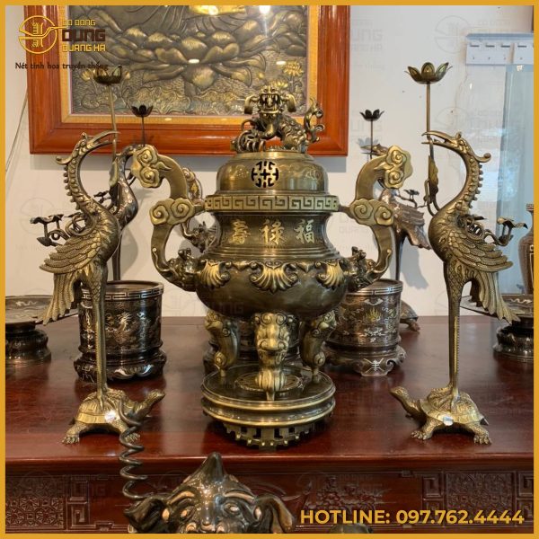 Ở giữa là lư hương bằng đồng có dáng tròn cân đối, thân lư được chạm khắc hoa văn tinh xảo, nổi bật với những chữ Hán mang ý nghĩa cát tường, tượng trưng cho phúc lộc và thọ khang. Trên nắp lư là tượng nghê chầu được tạo hình sống động, thể hiện quyền uy và sức mạnh bảo hộ, giúp trấn giữ linh khí, mang lại bình an cho gia chủ. Hai bên lư gắn quai hình rồng uốn lượn, biểu tượng cho quyền lực và thịnh vượng, đồng thời tạo cảm giác cân đối, mềm mại mà vẫn giữ nét sang trọng, cổ kính.
