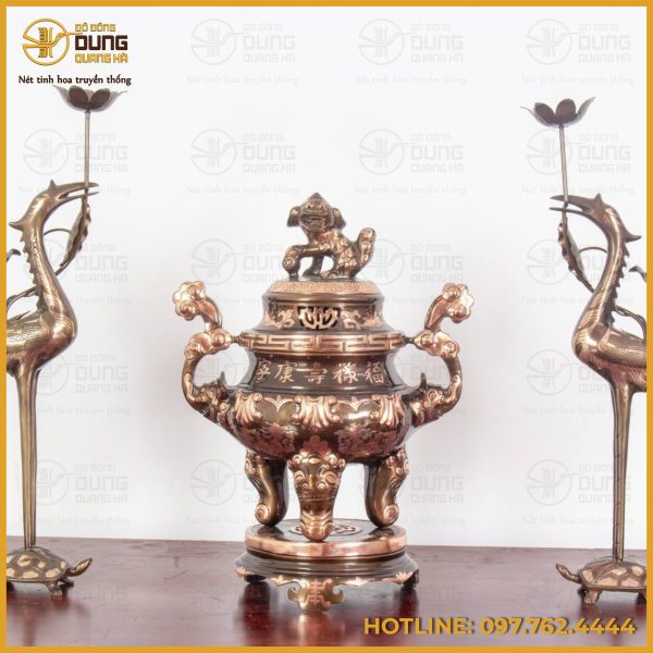 Đỉnh đồng là trung tâm của bàn thờ, nơi hương trầm quy tụ, khói bay lên biểu thị mối liên kết thiêng liêng giữa con cháu và tổ tiên, là sợi dây nối giữa cõi trần và cõi thiêng. Tượng nghê trên nắp tượng trưng cho sự trấn trạch, xua tà, giữ bình yên cho gia đạo. Ba chân thú thể hiện Tam Tài Thiên – Địa – Nhân, còn đôn tròn tượng trưng cho sự viên mãn, vẹn toàn. Đôi hạc chầu mang ý nghĩa thanh cao và trường tồn, hạc ngậm sen biểu trưng cho sự liêm khiết và đoàn viên. Rùa là biểu tượng của nền tảng vững bền và thọ mệnh lâu dài. Hạc đứng trên rùa – hình tượng “hạc quy” – thể hiện sự hòa hợp âm dương, nâng đỡ phúc khí, đem lại sự thịnh vượng, trường an cho gia đình qua nhiều thế hệ.
