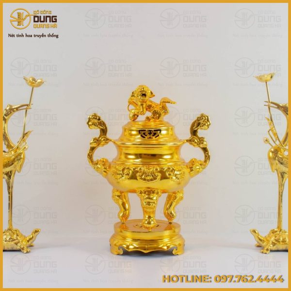 Bộ tam sự hạc bằng đồng là một trong những vật phẩm thờ cúng mang đậm bản sắc văn hóa Việt, gồm ba món linh thiêng: lư hương đặt ở vị trí trung tâm và đôi hạc đồng chầu hai bên. Lư hương có dáng tròn bệ vệ, thân lư khắc họa hoa văn uyển chuyển, mềm mại, thể hiện trình độ chế tác tinh tế của người thợ. Hai quai lư đúc hình rồng uốn lượn, biểu tượng cho quyền uy, sức mạnh và sự linh thiêng trong không gian thờ tự. Nắp lư nổi bật với tượng nghê chầu dáng oai phong, mang ý nghĩa bảo hộ, trấn trạch, giữ cho nơi thờ phụng luôn thanh tịnh và bình an.