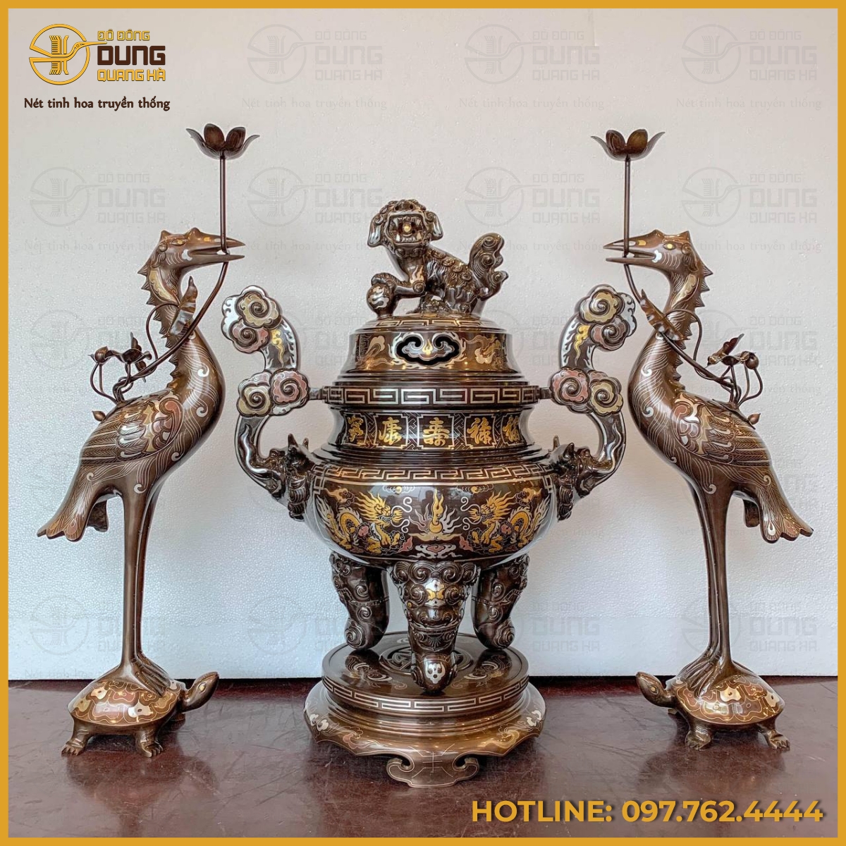 Toàn bộ sản phẩm mang sắc nâu trầm cổ kính của đồng đỏ, điểm xuyết bởi ánh vàng, bạc, đồng trắng từ kỹ thuật khảm tam khí thủ công truyền thống. Các mảng khảm được xử lý tỉ mỉ, tạo nên sự tương phản tinh tế, làm nổi bật hoa văn rồng – hạc – mây trời một cách sinh động. Gam màu ấm áp, sang trọng này khiến bộ tam sự vừa mang vẻ cổ điển uy nghi, vừa hòa hợp với nhiều không gian thờ tự hiện đại.