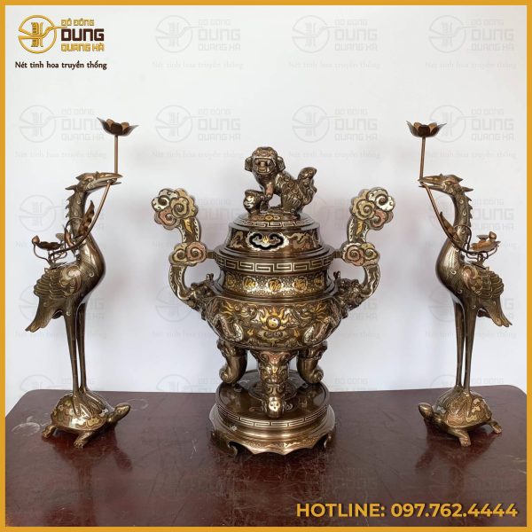 Bộ sản phẩm mang sắc đồng trầm ấm, đậm hơi thở thời gian và giàu tính cổ điển. Các chi tiết được khảm tam khí – kết hợp vàng, bạc và đồng – tạo nên những mảng màu tương phản tinh tế và lấp lánh. Từng đường khảm sáng rực trên nền đồng trầm tạo nên vẻ đẹp sang trọng, vừa cổ kính vừa hiện đại. Những điểm vàng dát mỏng phản chiếu ánh sáng, làm bộ sản phẩm thêm rực rỡ và đầy sức sống, phù hợp với không gian thờ tự trang nghiêm.