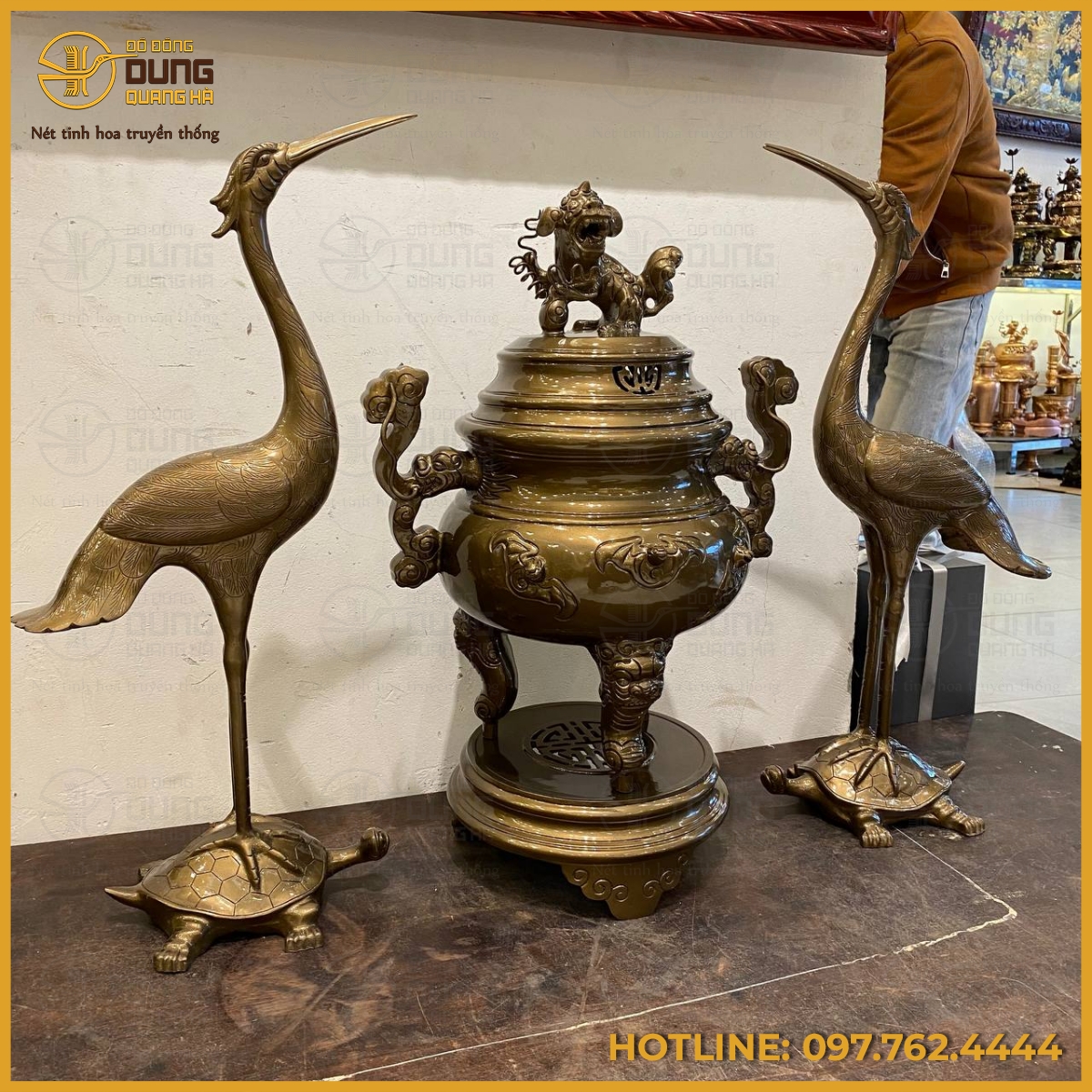 Bộ Tam Sự Hạc bằng đồng gồm ba vật phẩm chủ đạo: một lư hương đặt ở trung tâm và hai chân hạc đứng trên lưng rùa được bố trí cân đối hai bên. Tất cả đều được chế tác từ đồng nguyên chất, với từng đường nét chạm khắc tinh vi, thể hiện sự khéo léo của nghệ nhân và giá trị nghệ thuật truyền thống lâu đời.