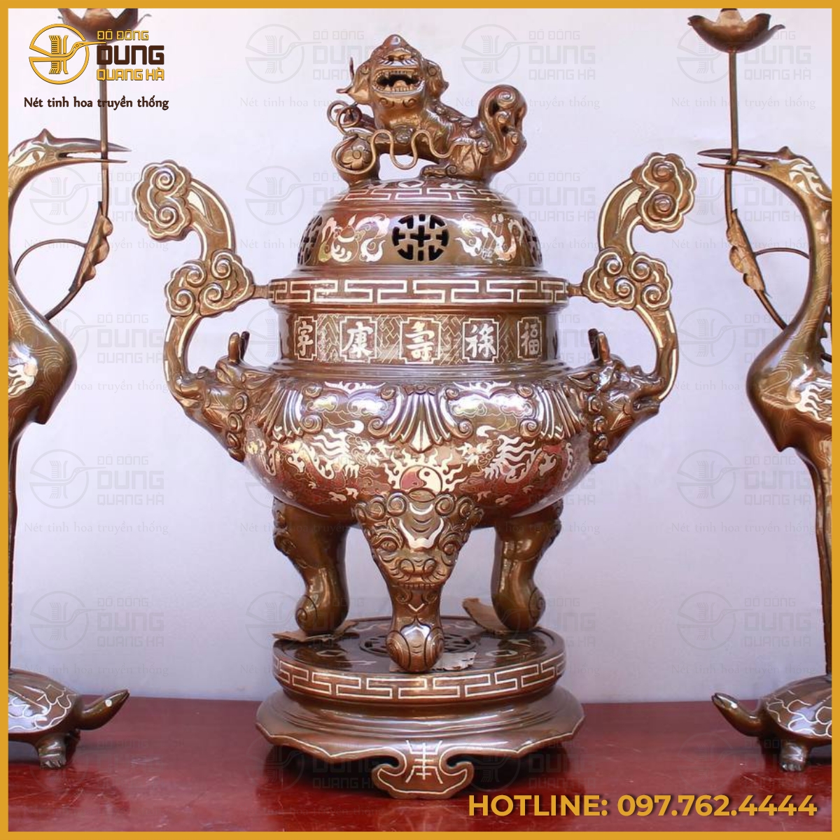 Tác phẩm được chế tác hoàn toàn thủ công từ đồng nguyên chất, qua nhiều công đoạn tỉ mỉ. Sau khi đúc, từng chi tiết được gọt nguội và đánh tỉa kỹ lưỡng để đường gờ, mép tai, móng thú hay bờm nghê trở nên sắc nét và sống động. Thân đỉnh nổi bật với dải hồi văn triện chạy liền mạch, xen giữa là hàng chữ Phúc – Lộc – Thọ bố trí theo thể chữ Hán, kết hợp cùng các họa tiết mây lửa, lá đề và cánh sen tạo nên bố cục cân bằng và nhịp điệu. Nắp đỉnh đục thoáng vừa phải giúp hương trầm lan đều, tượng nghê tách khối sâu, bờm và đuôi uốn lượn mang lại cảm giác chuyển động linh hoạt. Đôi hạc được chạm vảy nan đều tay, phần sống lưng và viền cánh được đánh nổi để phản quang, trong khi mai rùa khắc kênh bong, bốn chân bám đế tạo thế vững vàng. Toàn bộ hệ hoa văn tuân theo ngôn ngữ điêu khắc truyền thống Việt, nhìn gần thấy độ sâu lớp lớp, nhìn xa vẫn liền mạch chắc khối.