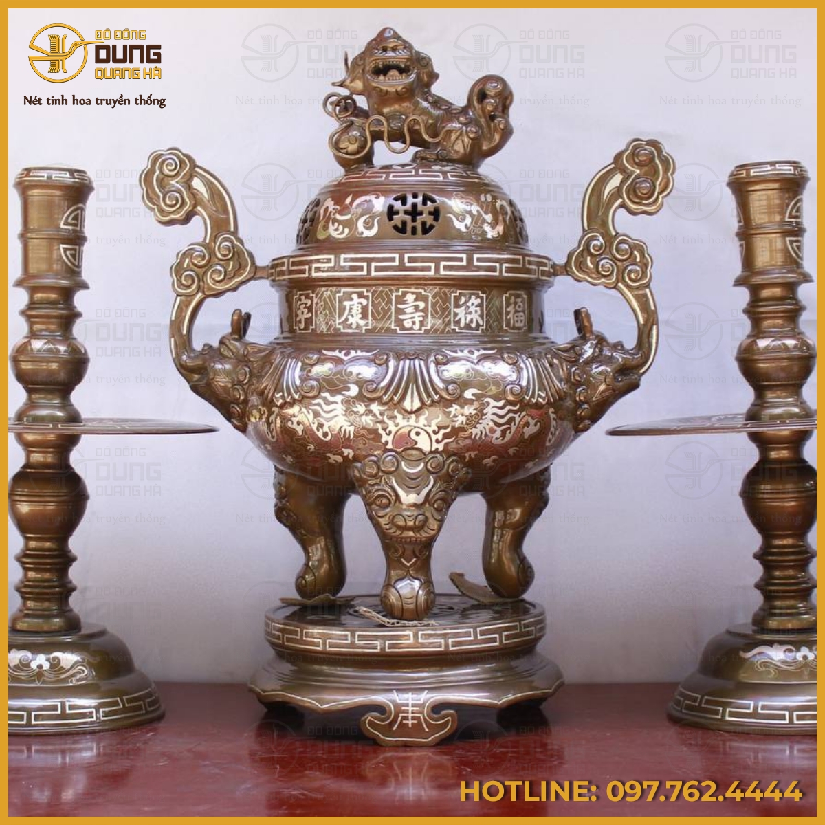 Bộ tam sự nến chạm hoa sòi khảm tam khí là đồ thờ trang nghiêm tinh xảo, giàu ý nghĩa truyền thống sâu sắc – Tác phẩm có tại đồ đồng Dung Quang Hà. Hãy đến ngay với chúng tôi để có thể sở hữu những tác phẩm đẹp với nhiều ưu đãi hấp dẫn!