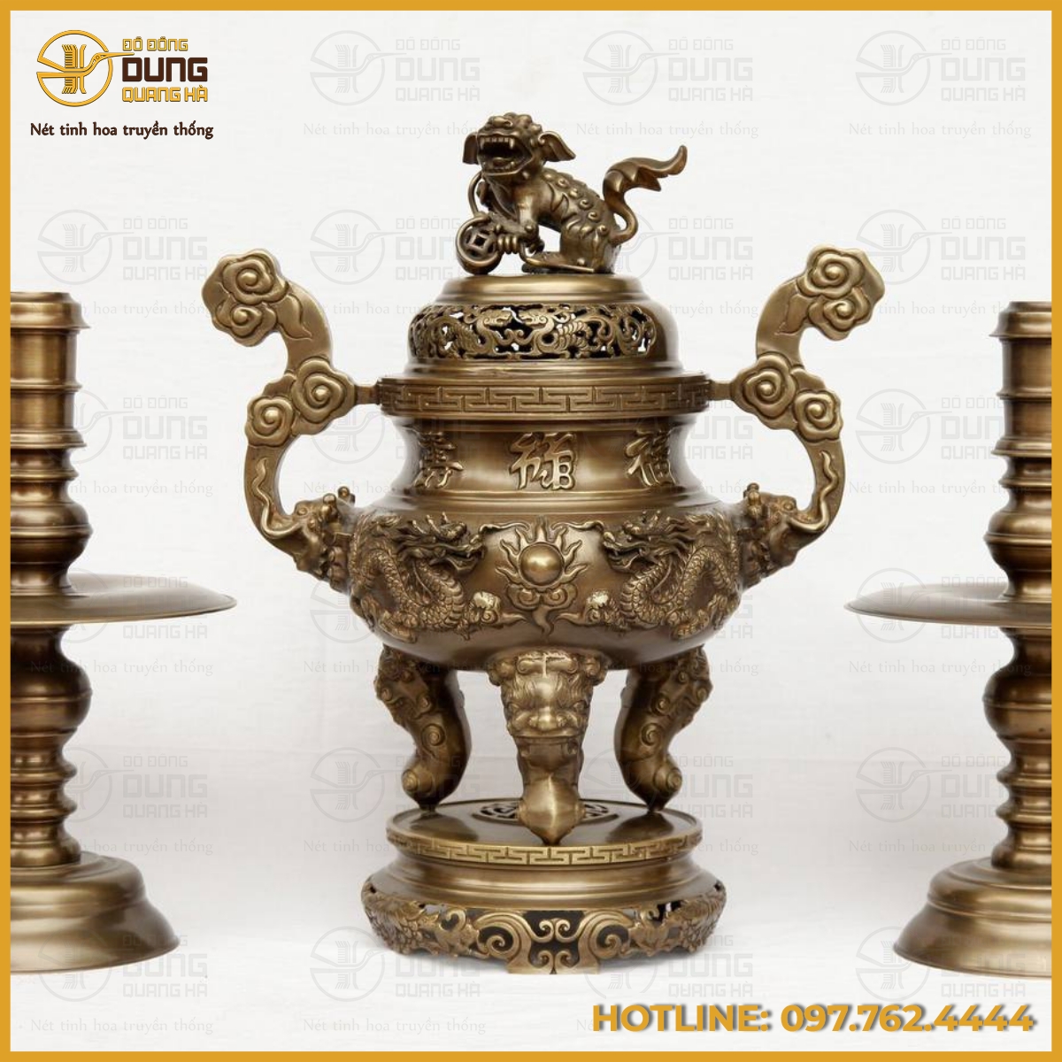 Bộ tam sự gồm một đỉnh đồng đặt ở trung tâm và hai cây nến đồng hai bên, cân đối và trang nghiêm. Đỉnh đồng có thân hình tròn bầu, đặt trên ba chân vững chãi khắc hình nghê quỳ, biểu tượng của sức mạnh và bảo hộ. Nắp đỉnh nổi bật với tượng nghê chầu ngậm ngọc, thể hiện uy quyền và sự trấn trạch linh thiêng. Hai quai đỉnh uốn cong mềm mại, tạo hình vân mây cuộn tinh xảo, tôn thêm vẻ uy nghi và thanh thoát.