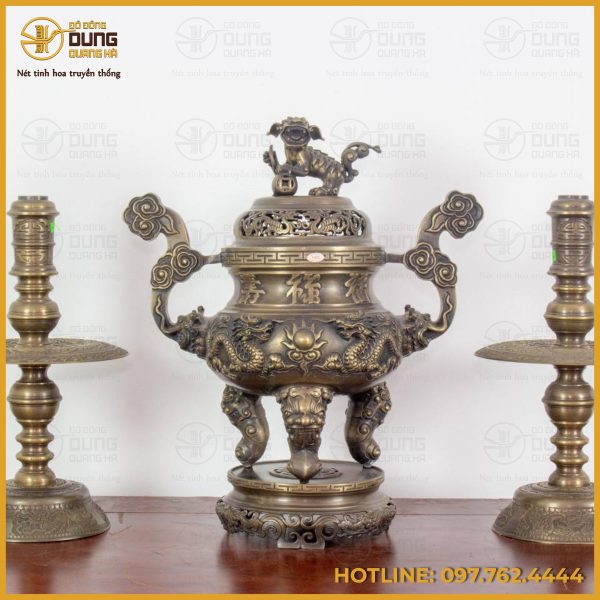 Bộ tam sự gồm một lư hương đặt ở giữa và hai chân nến đối xứng hai bên, tất cả đều được chế tác bằng đồng nguyên chất, tạo nên vẻ đẹp sang trọng và linh thiêng cho không gian thờ cúng. Lư hương có dáng bầu tròn, nắp chạm thủng tinh xảo để thoát khói hương, phía trên đặt tượng nghê chầu oai vệ, biểu tượng của sự bảo hộ và trấn giữ. Phần thân lư khắc nổi hoa văn song long chầu nguyệt – hình tượng hai con rồng uốn lượn mạnh mẽ, đầu chầu về viên ngọc tròn ở trung tâm, thể hiện sự uy quyền và viên mãn. Hai quai lư tạo dáng cong mềm mại, khắc họa họa tiết mây xoắn, vừa có tính thẩm mỹ vừa tạo cảm giác vững chãi. Chân lư thiết kế ba trụ vững chắc, tạo thế cân đối, nâng đỡ toàn bộ thân lư một cách uy nghiêm. Tại phần thắt được chạm chữ