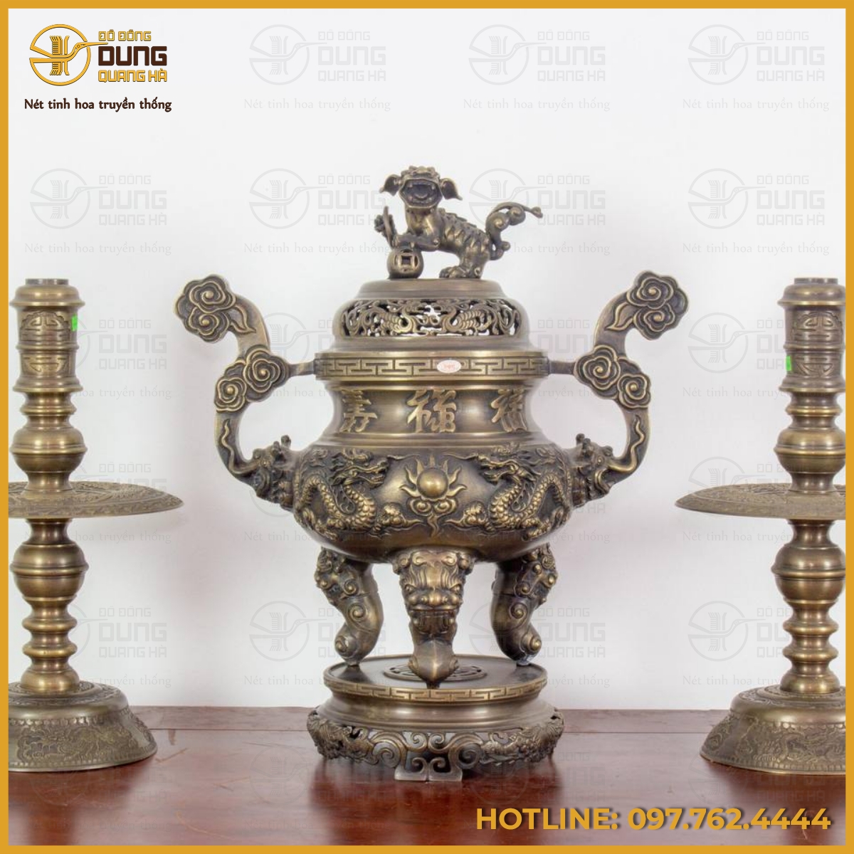 Bộ tam sự nến chạm song long chầu nguyệt là đồ thờ trang nghiêm tinh xảo, giàu ý nghĩa truyền thống sâu sắc – Tác phẩm có tại đồ đồng Dung Quang Hà. Hãy đến ngay với chúng tôi để có thể sở hữu những tác phẩm đẹp với nhiều ưu đãi hấp dẫn!