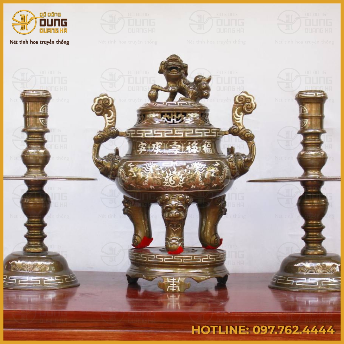 Bộ tam sự gồm một lư hương ở trung tâm và hai chân nến đối xứng hai bên, tất cả đều được chế tác thủ công bằng đồng nguyên chất, tạo nên sự uy nghi và trang trọng cho không gian thờ tự. Lư hương có dáng bầu tròn, nắp chạm thủng tinh xảo để thoát khói hương, phía trên đặt tượng nghê chầu oai vệ, biểu tượng của sự trấn giữ và bảo hộ linh thiêng. Phần thân lư nổi bật với họa tiết song long chầu nguyệt – hai con rồng uốn lượn đối xứng, đầu chầu về viên ngọc tròn sáng rực, biểu tượng cho sự viên mãn, sung túc và tinh hoa vũ trụ. Đặc biệt, xung quanh thân lư còn được chạm khắc rõ nét dòng chữ “Phúc – Lộc – Thọ – Khang – Ninh”, mang ý nghĩa cầu chúc hạnh phúc, tài lộc, trường thọ, sức khỏe dồi dào và bình an cho gia chủ. Hai quai lư cong mềm mại như mây cuộn, vừa tạo thế cân đối vừa tôn thêm vẻ đẹp thẩm mỹ. Ba chân lư tạo hình thú đứng vững chắc, nâng đỡ toàn bộ thân lư, đặt trên bệ đế khắc hoa văn cổ điển, toát lên sự bề thế và uy nghi.