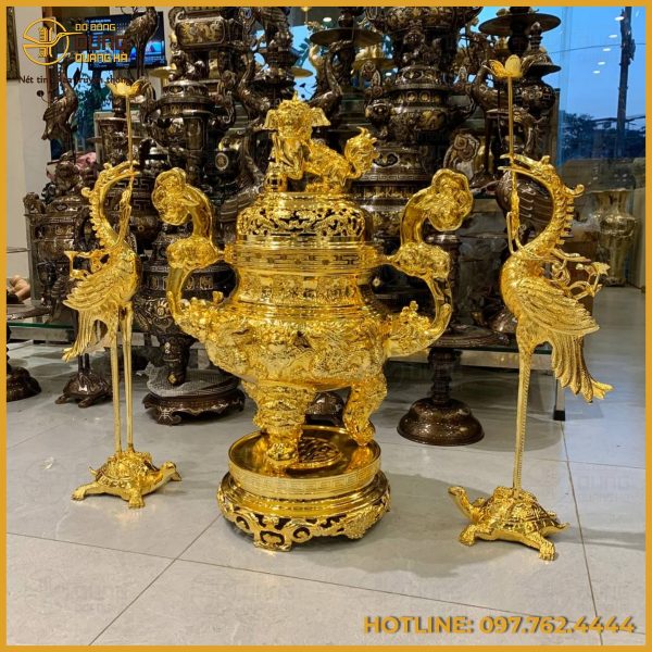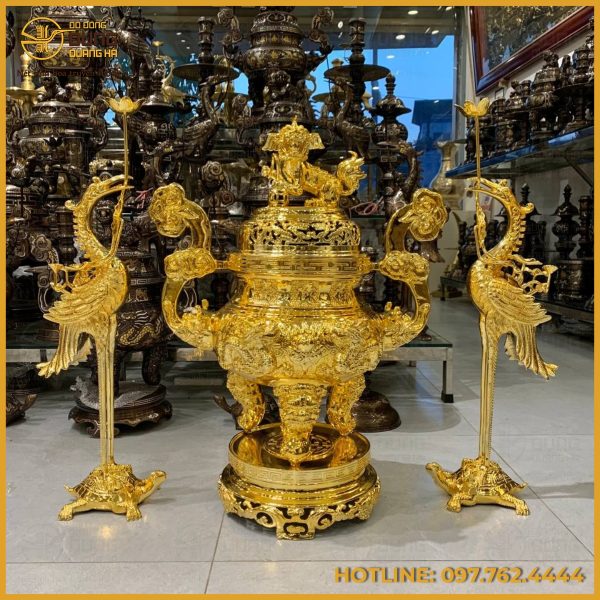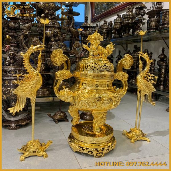 Bộ Tam Sự hạc bằng đồng vàng không chỉ góp phần tạo nên sự trang nghiêm và linh thiêng cho nơi thờ tự, mà còn mang giá trị phong thủy sâu sắc. Vật phẩm này được xem là biểu tượng của vượng khí, chiêu tài nạp phúc, trấn trạch và bảo vệ sự bình an cho gia đạo.