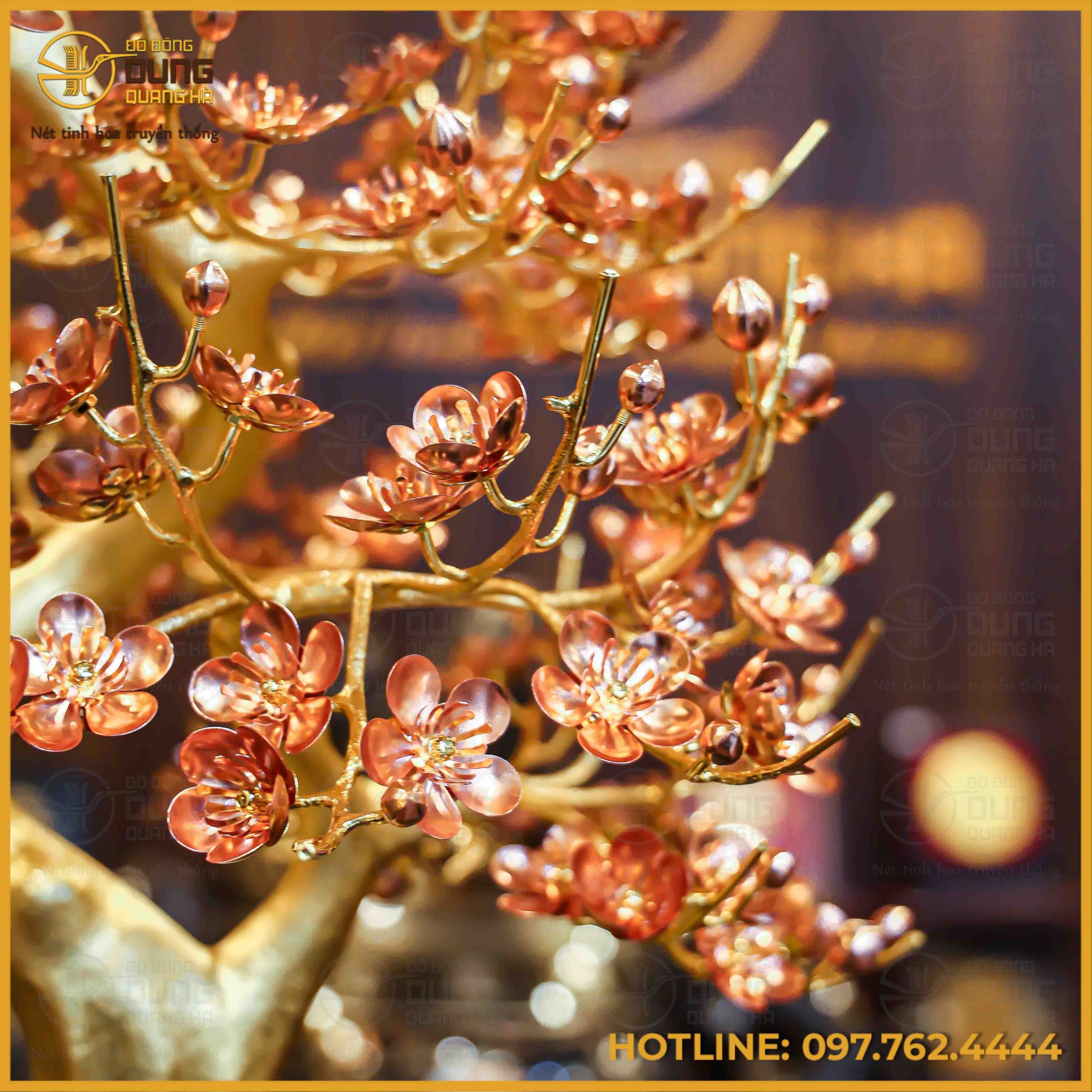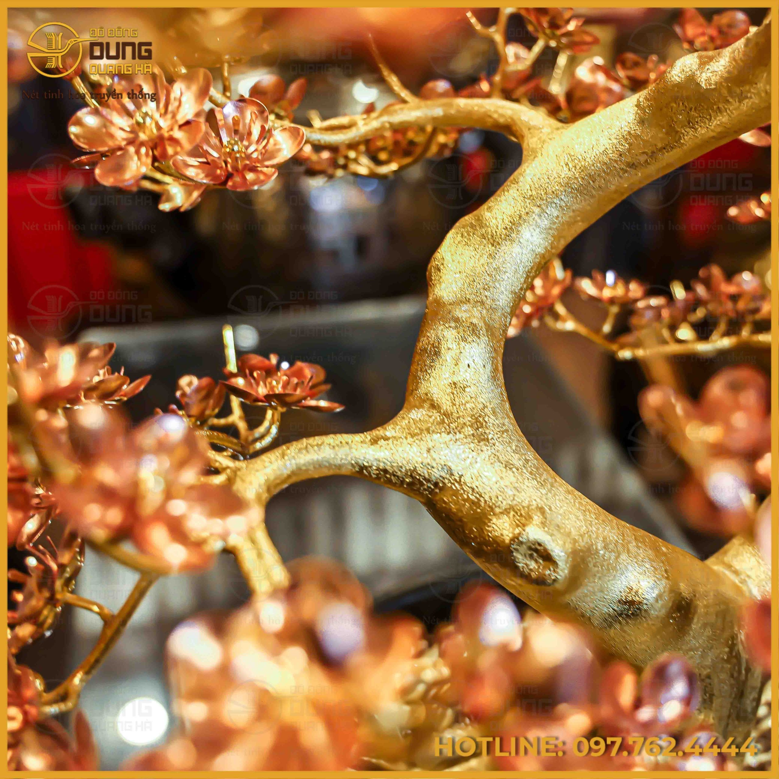 Sản phẩm là một tác phẩm nghệ thuật chế tác tinh xảo với thân cây được làm từ đồng vàng rực rỡ, mang đến vẻ đẹp sang trọng và quyền quý. Các cành và hoa đào được mạ vàng tinh xảo, tạo nên sự lấp lánh và thu hút mọi ánh nhìn. Với màu sắc vàng óng ả và thiết kế độc đáo, sản phẩm này chắc chắn sẽ là điểm nhấn tuyệt vời cho không gian sống của bạn.