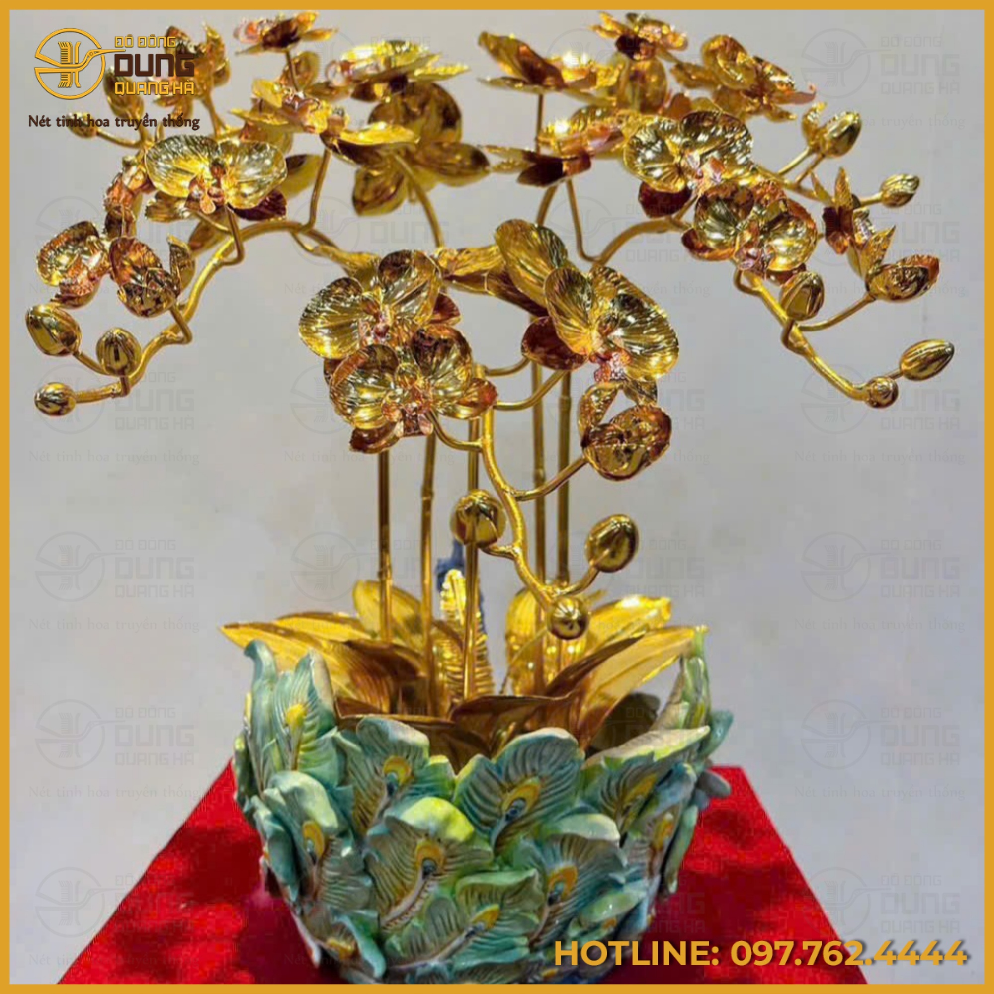 Quà tặng chậu lan hồ điệp bằng đồng mạ vàng là một kiệt tác nghệ thuật mang tính biểu tượng cao, nơi vẻ đẹp thanh cao của loài hoa “nữ hoàng” gặp gỡ sự vĩnh cửu của kim loại quý. Khác với những nhành lan tươi sớm nở tối tàn, hoa lan hồ điệp mạ vàng mang ý nghĩa về một tình cảm bền chặt và sự thịnh vượng trường tồn theo thời gian, tượng trưng cho ý chí kiên định và sự phát triển không ngừng nghỉ. Từng cánh hoa được chế tác thủ công tỉ mỉ không chỉ tái hiện nét mềm mại, quý phái mà còn toát lên luồng khí sang trọng, giúp nâng tầm đẳng cấp không gian và khẳng định vị thế của người sở hữu.