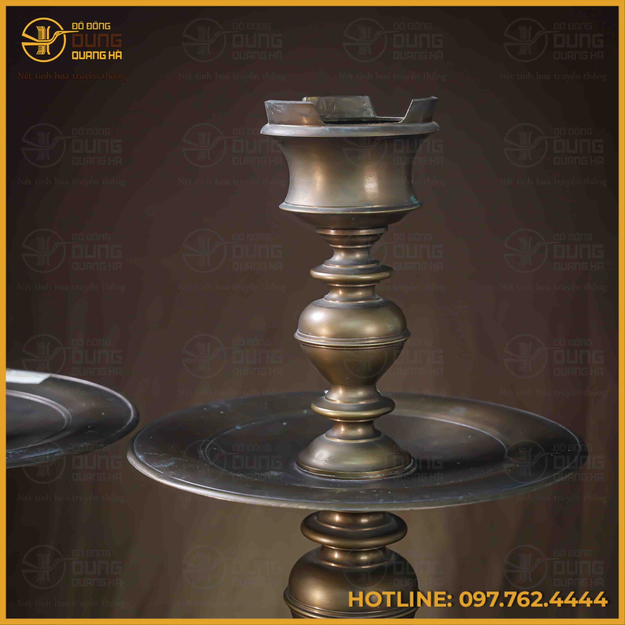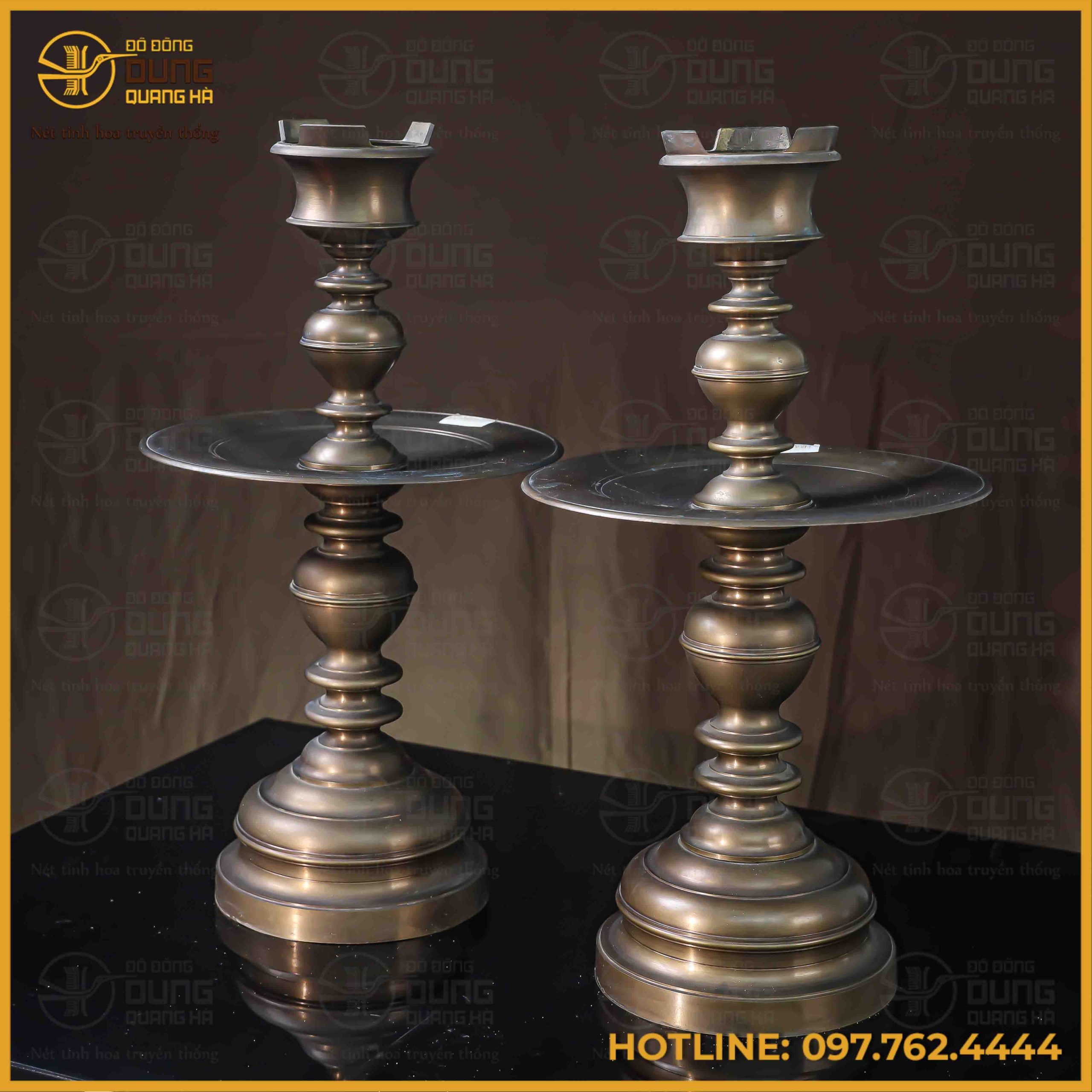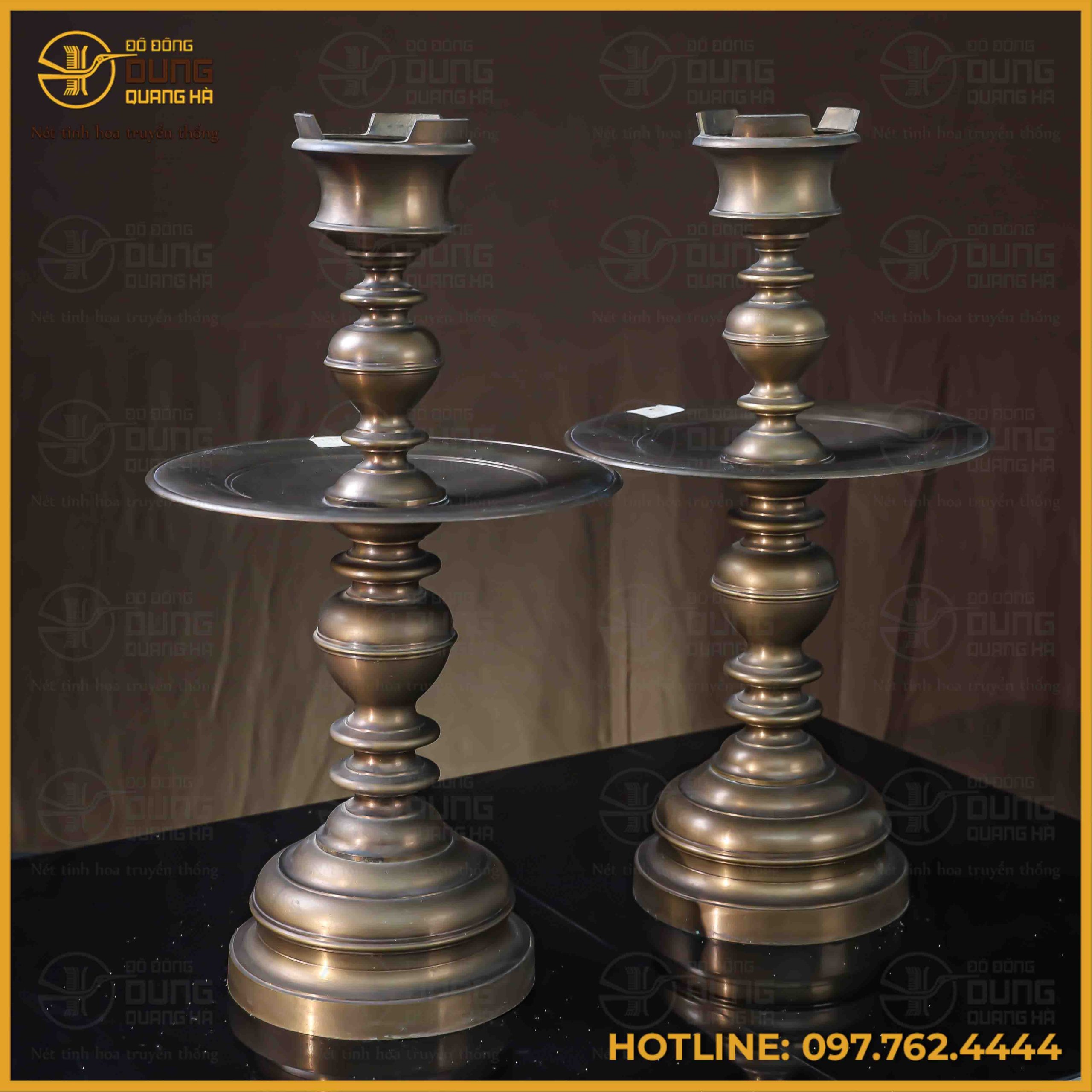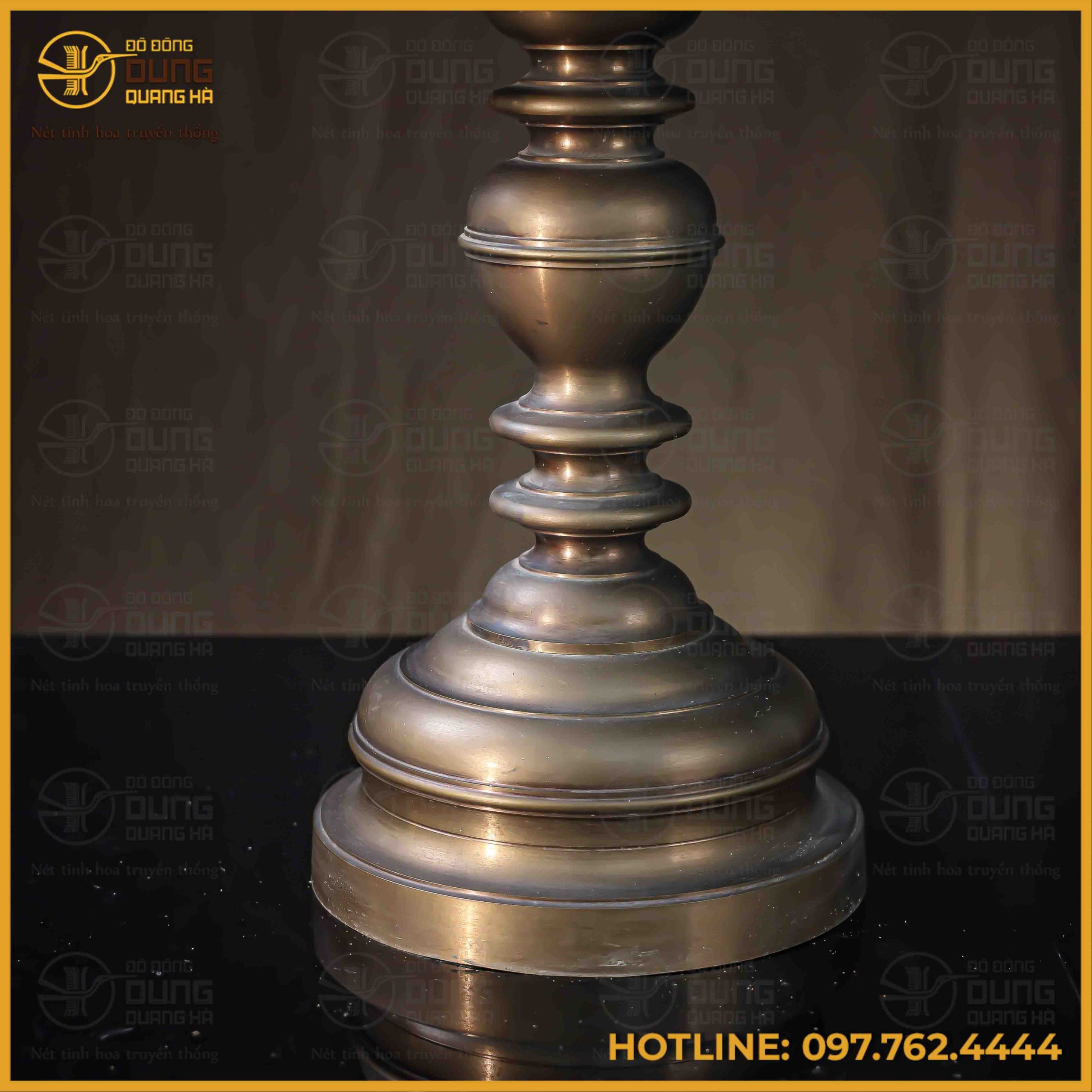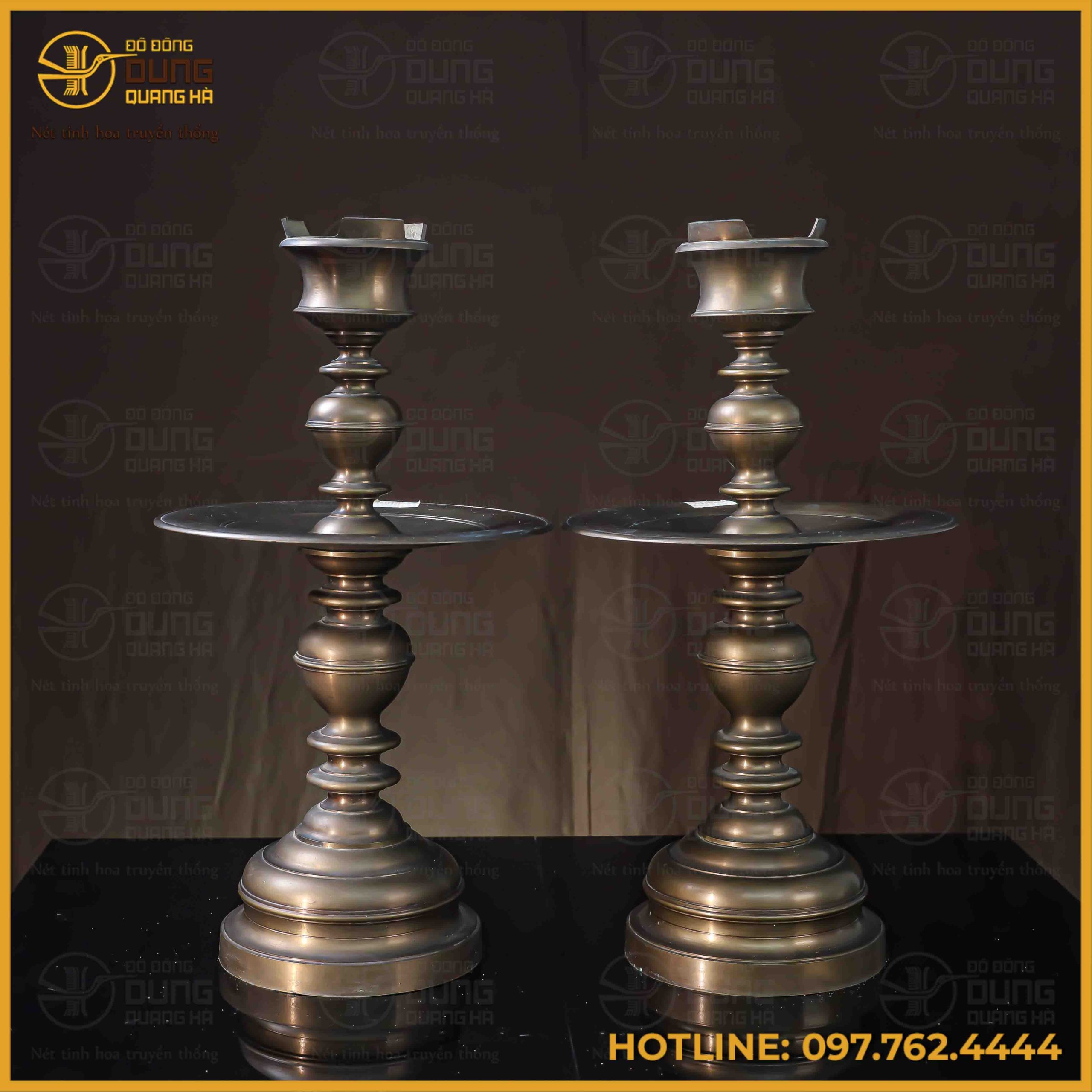 Đôi chân nến bằng đồng vàng mang sắc màu vàng hun cổ kính, trầm mặc, toát lên vẻ trang nghiêm và huyền bí cho không gian thờ tự. Gam màu này không chỉ tạo điểm nhấn sang trọng mà còn thể hiện sự tinh tế và tâm linh sâu sắc, phù hợp với nhiều phong cách trang trí nội thất khác nhau. Sự kết hợp hài hòa giữa màu vàng hun truyền thống và thiết kế cổ điển tạo nên một tác phẩm nghệ thuật độc đáo, mang đến sự bình an và may mắn cho gia chủ.
