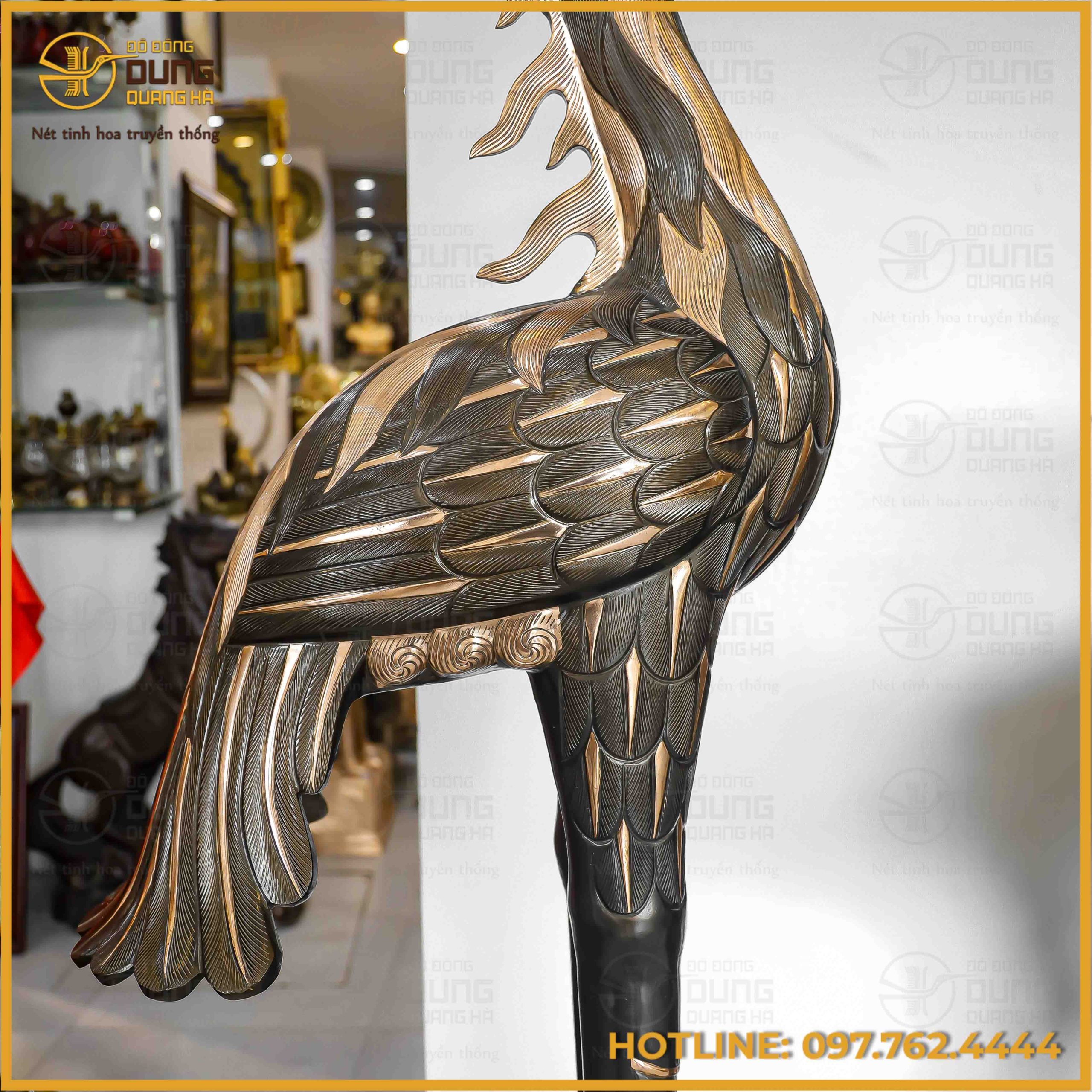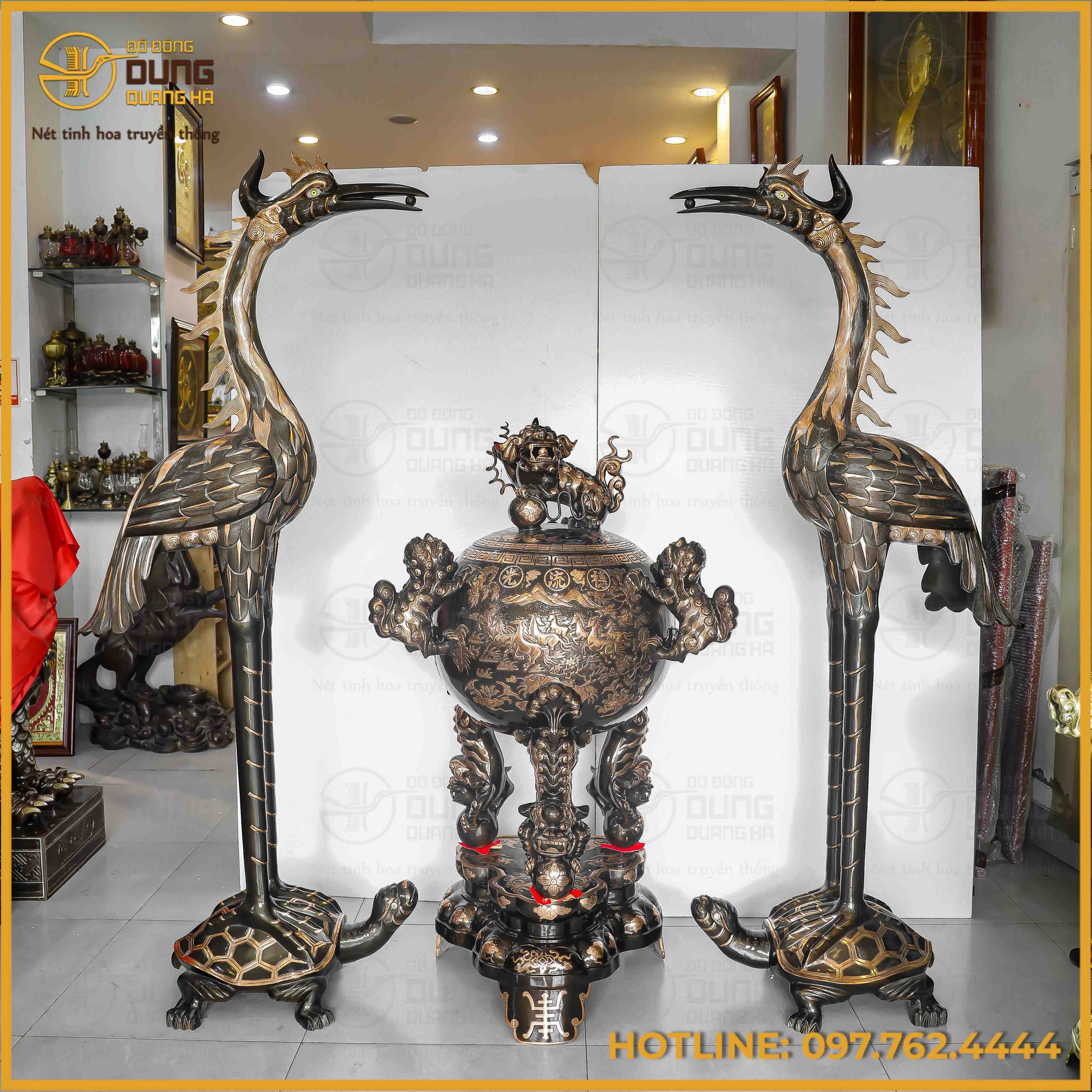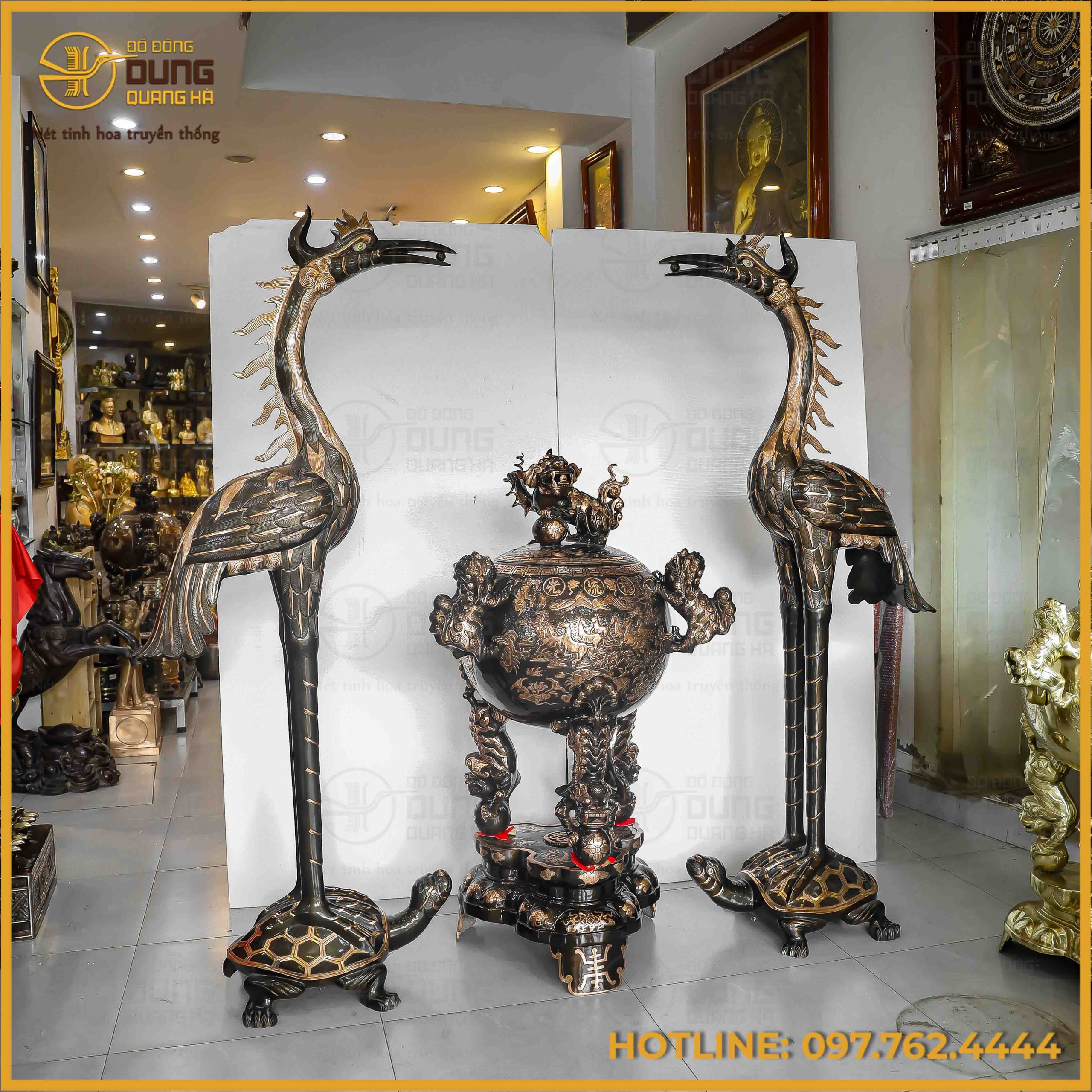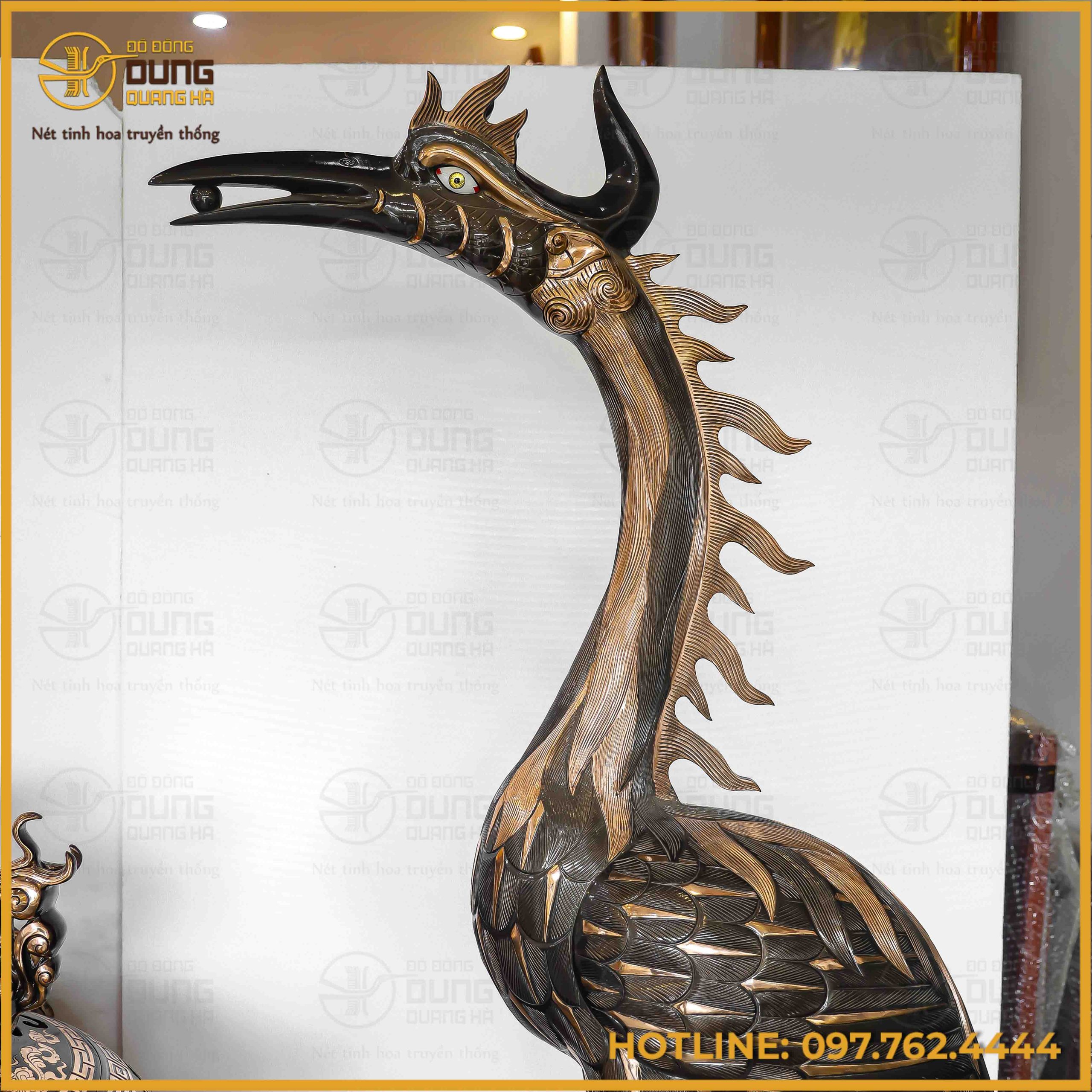 Sự kết hợp giữa đôi hạc cao 1m92 thanh thoát và đỉnh cầu 1m34 vững chãi tạo nên một chỉnh thể đầy uy quyền, là biểu tượng của sự trường thọ và quyền quý. Chạm khắc trên nền đồng đỏ cạo màu tinh xảo, bộ sản phẩm không chỉ là vật phẩm thờ tự mà còn là một kiệt tác nghệ thuật nâng tầm không gian tâm linh.