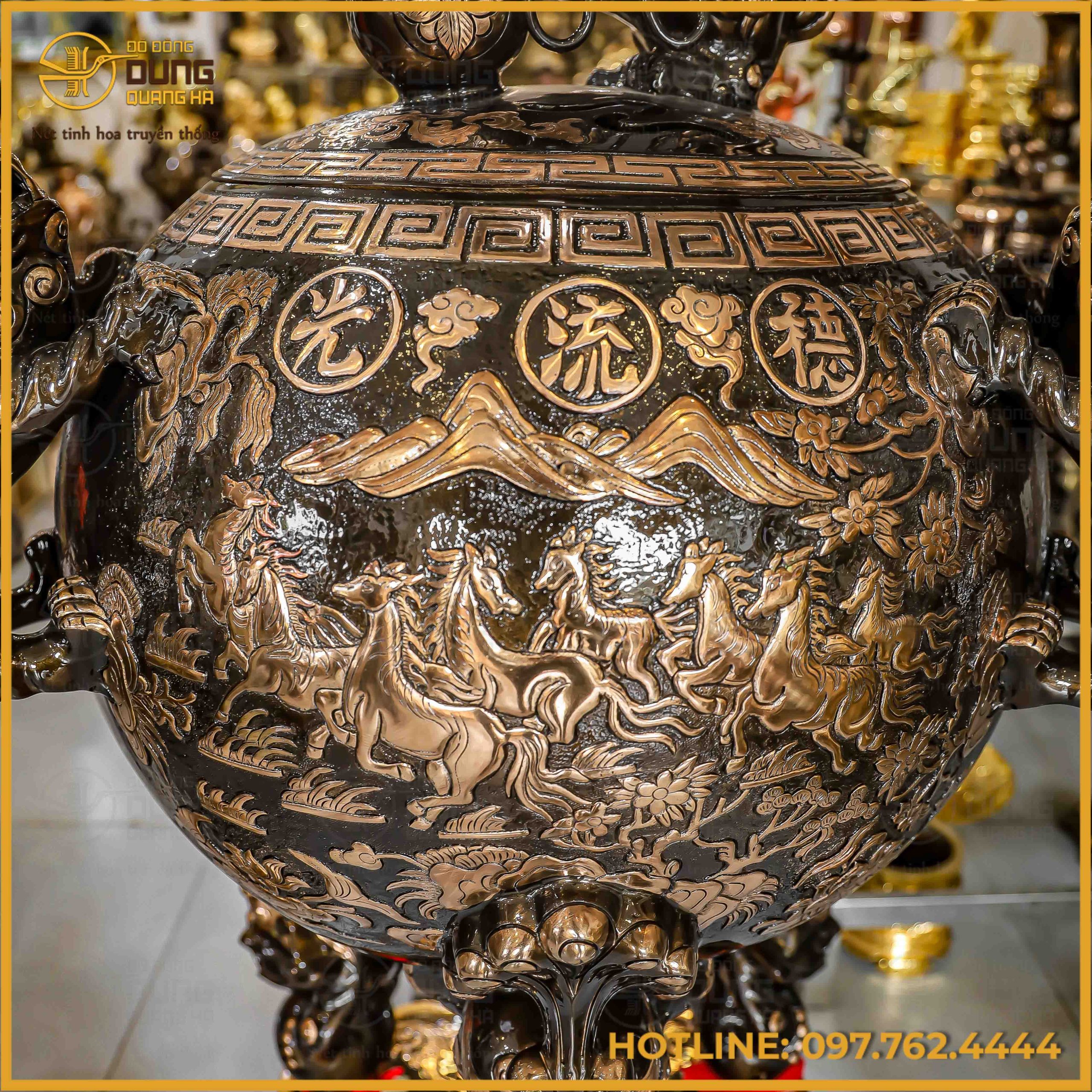 Nằm chính giữa bộ sản phẩm là chiếc đỉnh cầu có thân hình tròn trịa, được đặt trên ba chân đứng đầu lân cách điệu mạnh mẽ. Nắp đỉnh cầu được nhấn bằng hình tượng một con Nghê vờn cầu tinh xảo, chân ôm lấy viên ngọc, đuôi và bờm uốn lượn bay bổng. Bao quanh cổ đỉnh là dãy hoa văn hình học và triện vuông chạy vòng quanh một cách kỷ hà. Điểm nhấn trung tâm trên thân đỉnh là bức phù điêu “Bát mã truy phong” với hình ảnh tám con ngựa đang phi nước đại, bờm và đuôi tung bay trong gió, đè lên nền sóng nước và hoa lá sinh động. Phía trên đàn ngựa là ba chữ Hán được đúc nổi nằm gọn trong các vòng tròn đồng tâm, xen kẽ với những áng mây uốn lượn. Hai bên thân đỉnh là đôi quai rồng uốn cong, các chi tiết vảy và vây rồng được chạm trổ sắc nét, tạo nên vẻ đẹp uy nghiêm và bề thế cho tổng thể sản phẩm.