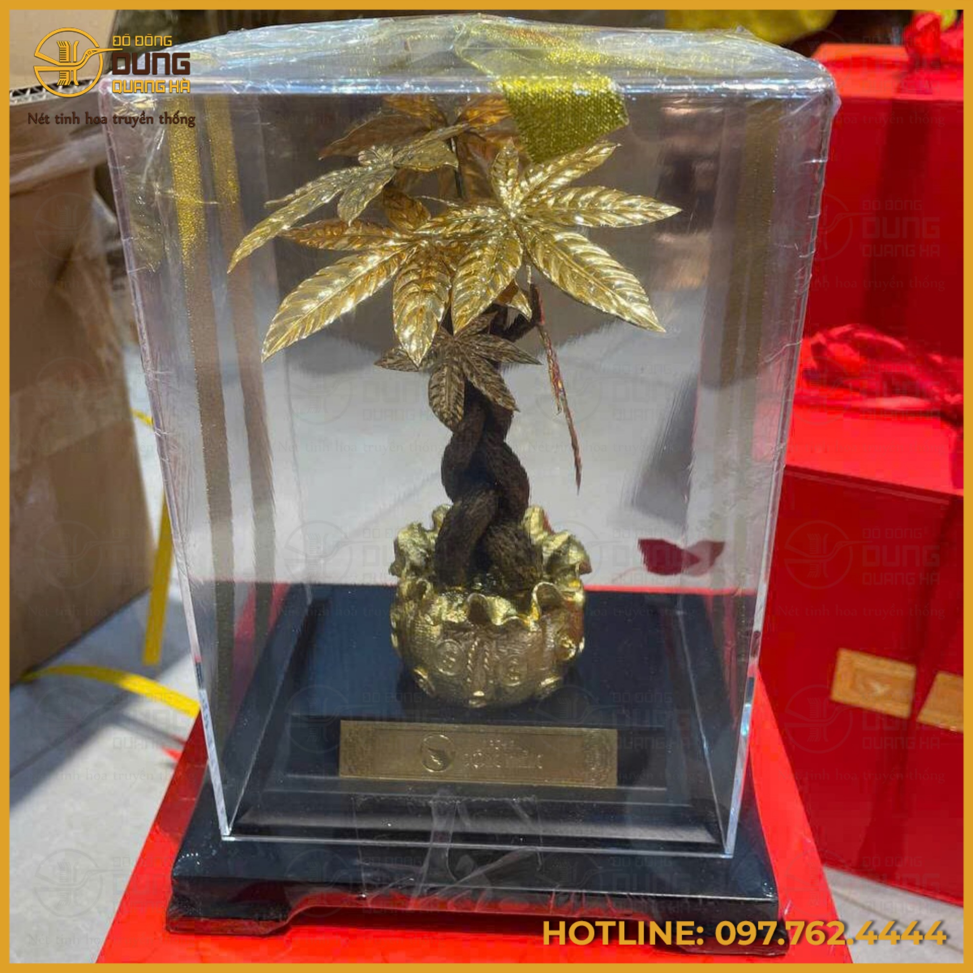 Phần chậu đựng cây được tạo hình như một chiếc túi tiền đầy ắp, bề mặt chạm nổi hoa văn đồng xu cổ, vừa mang tính trang trí cao vừa gợi nhắc đến hình ảnh chiêu tài, tụ lộc trong văn hóa Á Đông. Chậu cây được đặt trên bệ gỗ cao cấp màu trầm, giúp tổng thể thêm vững chãi và tôn lên vẻ đẹp lộng lẫy của tác phẩm. Lớp hộp kính bao bọc bên ngoài không chỉ bảo vệ sản phẩm mà còn góp phần tăng thêm sự thanh lịch, tinh tế và đẳng cấp.