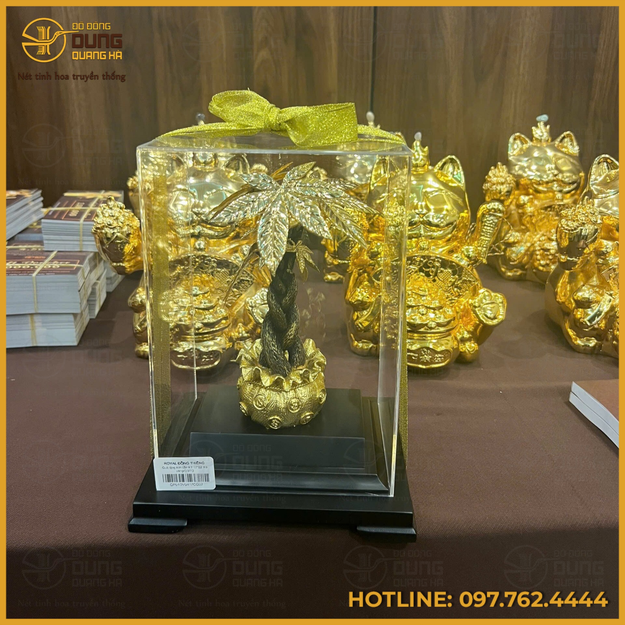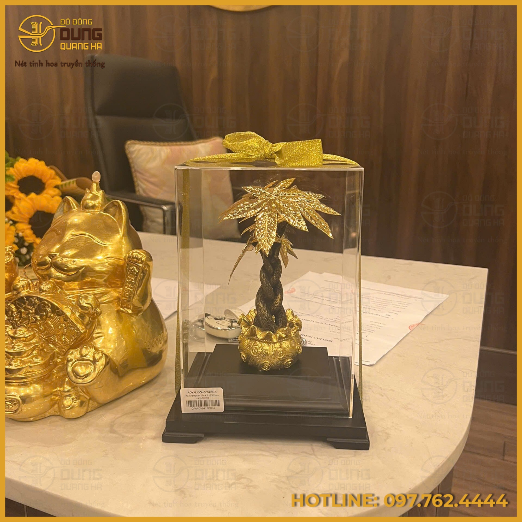 Cây kim tiền mạ vàng được chế tác công phu và tinh xảo, đặt trang trọng trong hộp kính trong suốt cao cấp, tạo nên tổng thể hài hòa và đậm chất nghệ thuật. Thân cây được tạo hình xoắn uốn mềm mại nhưng dứt khoát, gợi liên tưởng đến dáng dấp của một thân cây cổ thụ lâu năm, biểu trưng cho sức sống bền bỉ và sự phát triển không ngừng.