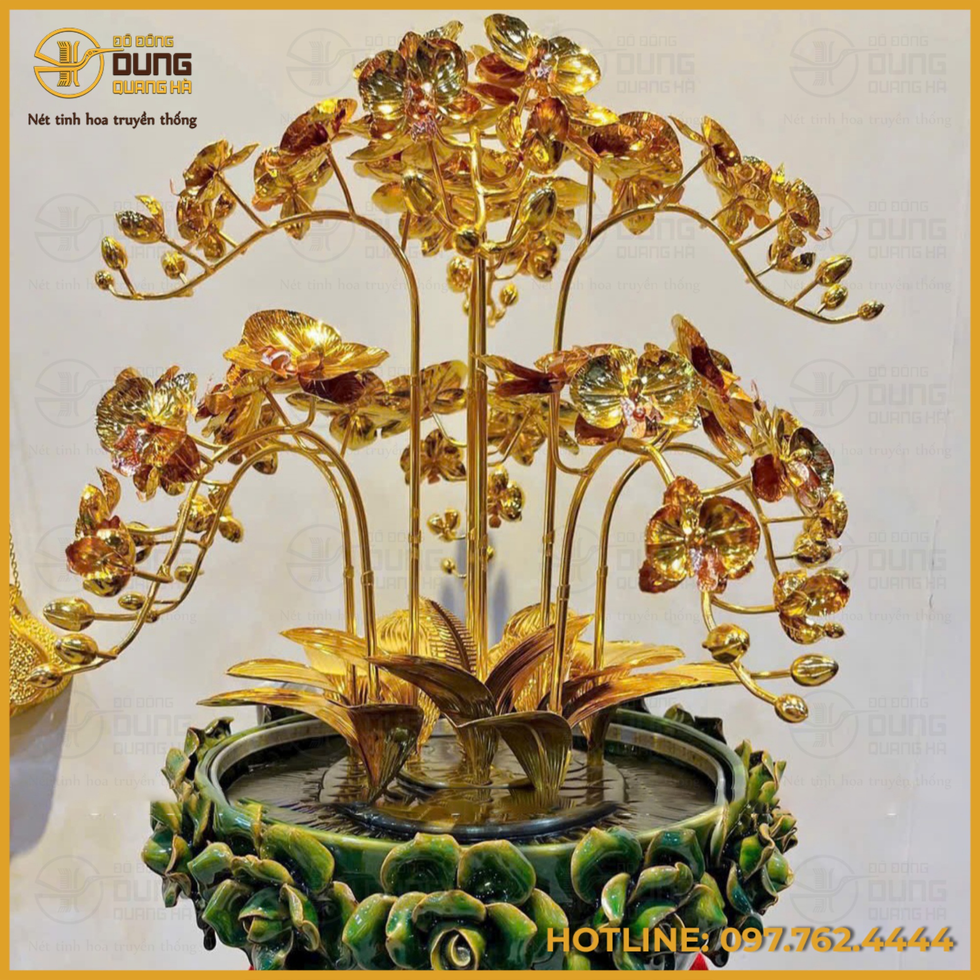 Sản phẩm tỏa sáng rực rỡ với những cánh hoa lan được mạ vàng 24K tinh xảo, tạo hiệu ứng phản chiếu ánh sáng lộng lẫy và sang trọng. Sắc vàng kim quý tộc bao phủ trọn vẹn từ nụ hoa đến cuống cành, mang lại vẻ đẹp vĩnh cửu và vinh hoa phú quý. Sự kết hợp giữa sắc vàng óng ả và phần chậu gốm xanh ngọc lục bảo tạo nên một tổng thể màu sắc hài hòa, đẳng cấp và đậm chất nghệ thuật.