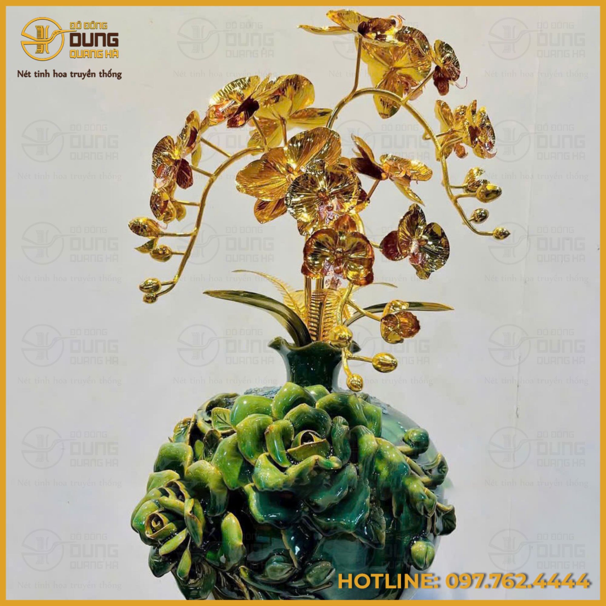 Sản phẩm toát lên vẻ đẹp vương giả với những cánh lan hồ điệp được mạ vàng 24K rực rỡ, mang lại hiệu ứng ánh kim lộng lẫy và bền bỉ theo thời gian. Sắc vàng quý tộc bao phủ trọn vẹn từ nhành hoa đến nụ nhỏ, tạo nên sự tương phản hoàn hảo với phần chậu xanh lục bảo được chạm nổi hoa văn tinh xảo. Tổng thể món quà là sự giao thoa hài hòa giữa tông vàng kim thịnh vượng và sắc xanh ngọc bích, tôn vinh nét sang trọng và đẳng cấp cho không gian trưng bày.