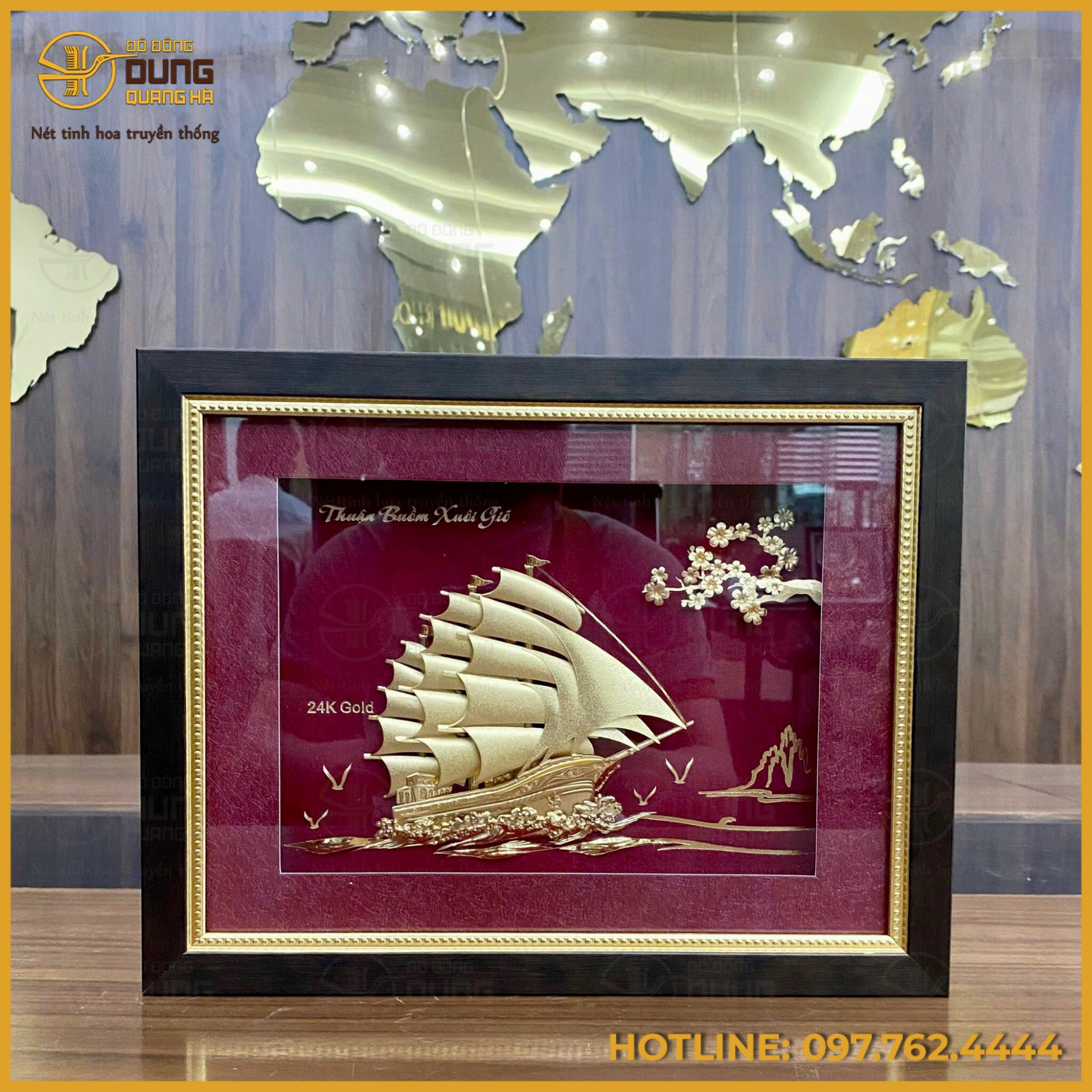 Nền đỏ sẫm của bức tranh đóng vai trò làm nổi bật chủ thể, tượng trưng cho cát khí, tài lộc và may mắn. Trên nền đỏ ấy, hình ảnh thuyền buồm mạ vàng 24K tỏa ánh kim óng ánh, tạo nên sự tương phản thị giác mạnh mẽ nhưng vẫn hài hòa. Ánh vàng kim không chỉ làm nổi bật từng đường nét chạm khắc tinh xảo mà còn mang đến cảm giác quyền quý, bền vững và trường tồn theo thời gian.