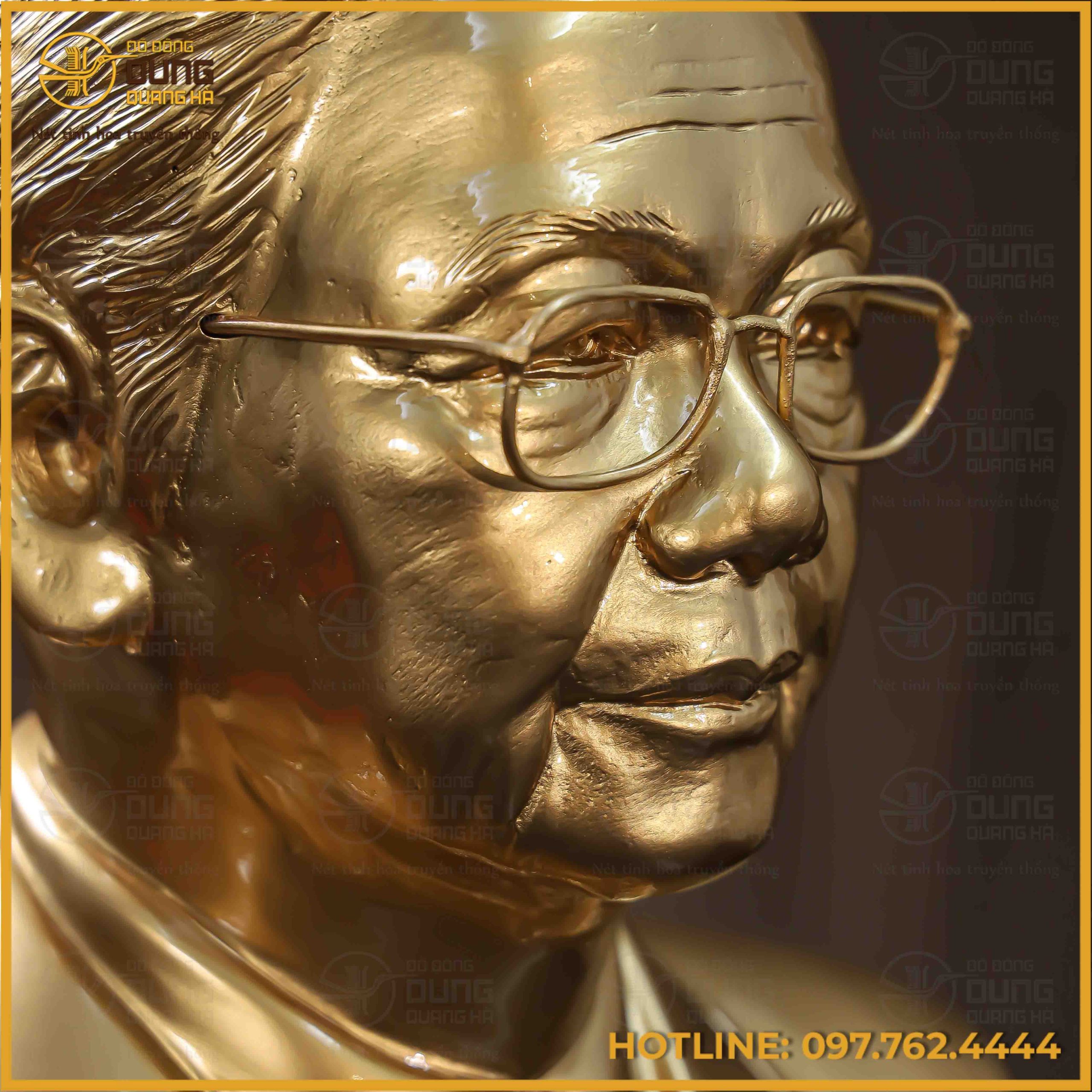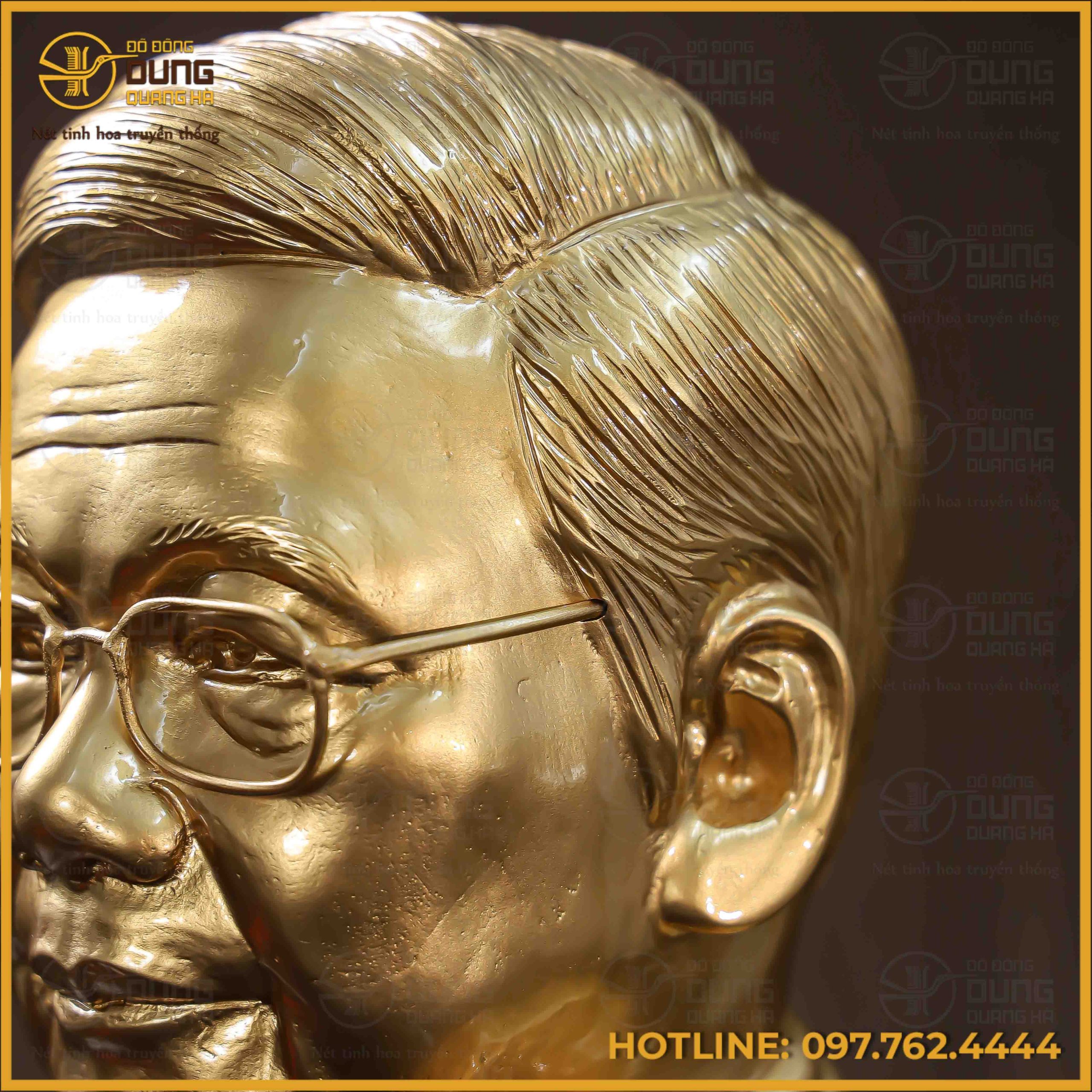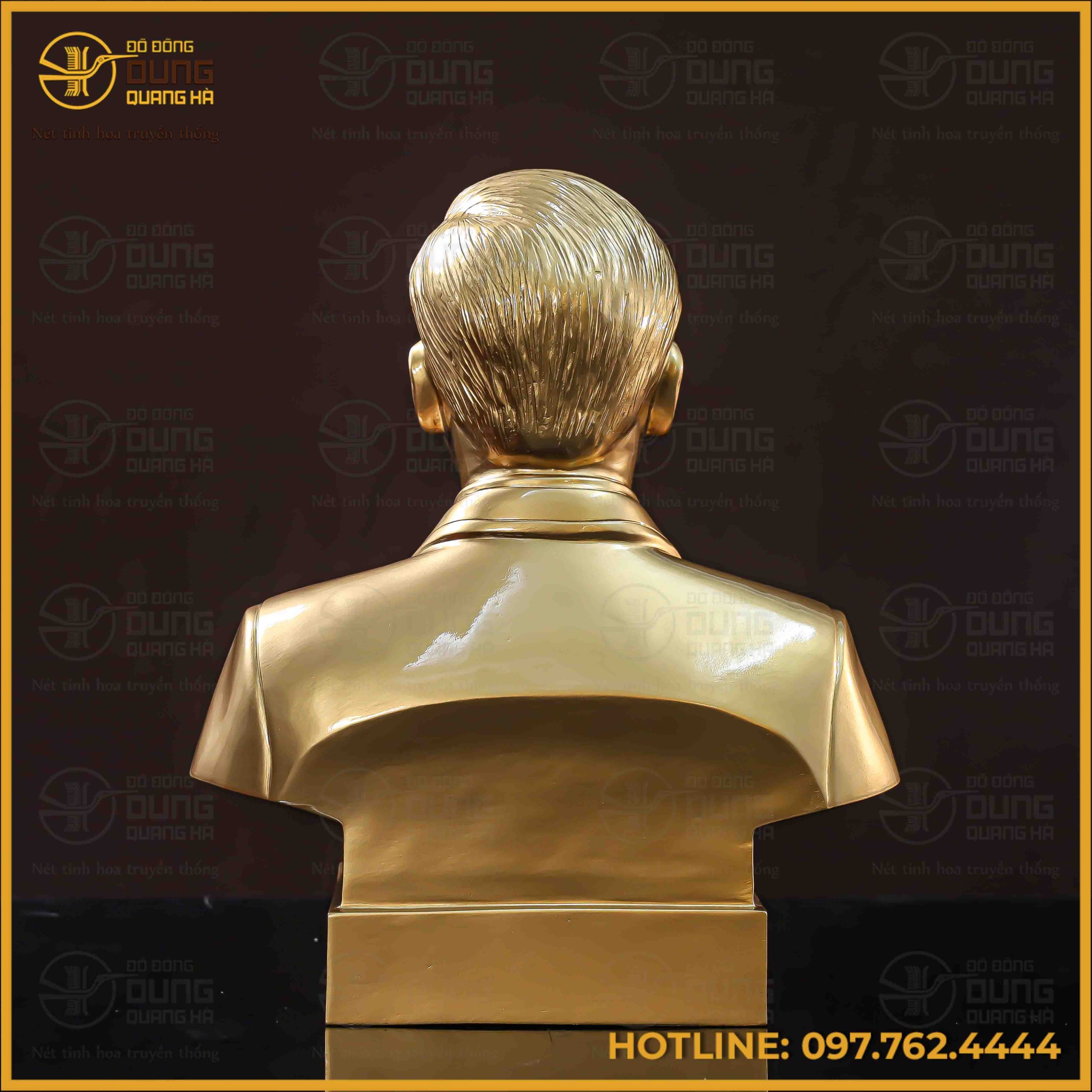 Bức tượng bán thân hiện lên với sắc vàng nhũ rực rỡ và sang trọng, toát lên vẻ trang nghiêm và quyền quý. Ánh kim loại sáng bóng phản chiếu trên bề mặt đồng đỏ, làm nổi bật khuôn mặt hiền hậu và các đường nét chân thực của Bác. Gam màu nhũ vàng đồng nhất này không chỉ tạo nên sự bền bỉ theo thời gian mà còn tôn vinh vẻ đẹp vĩnh cửu của vị lãnh đạo đáng kính.