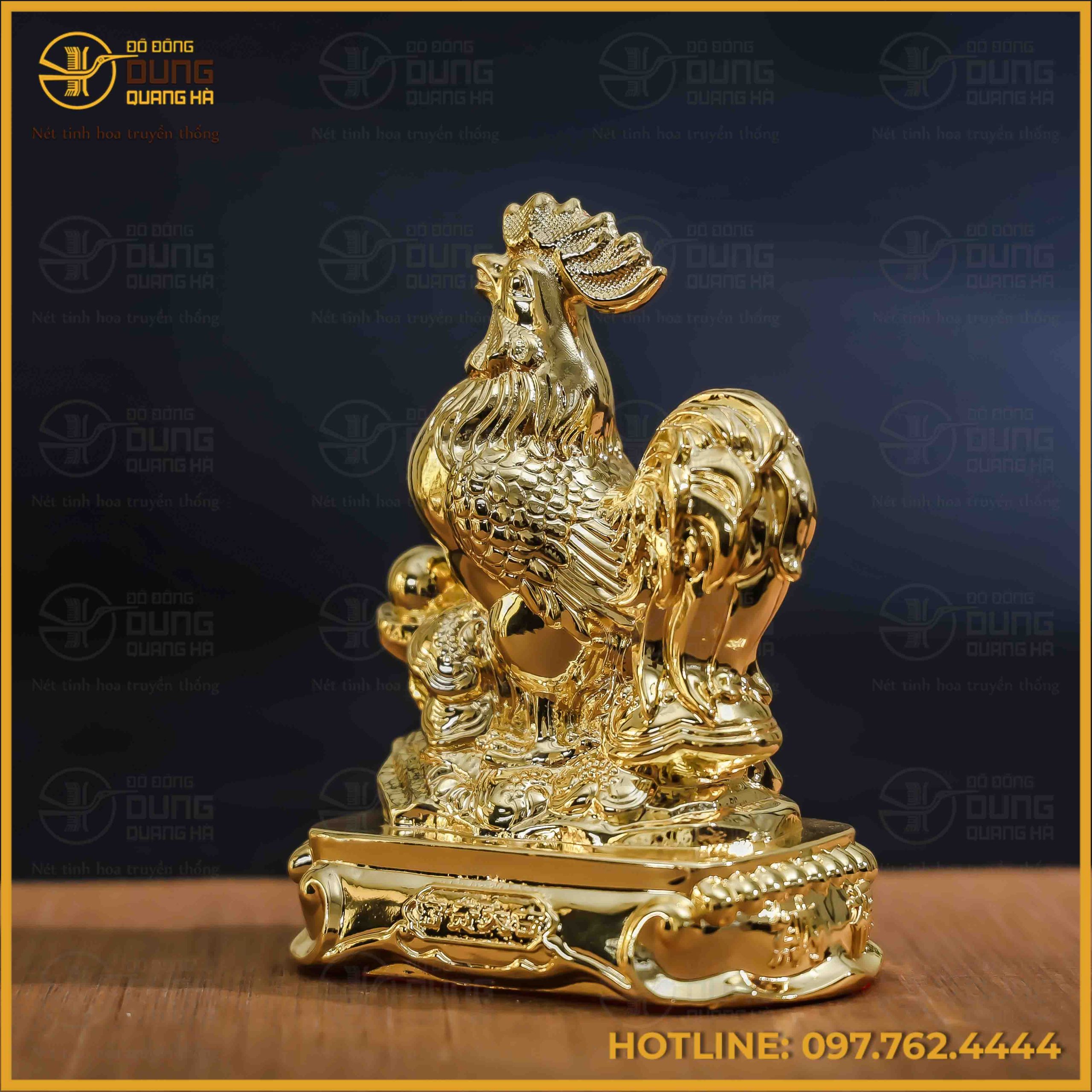 Pho tượng gây ấn tượng mạnh mẽ bởi lớp mạ vàng 24K rực rỡ, bao phủ toàn bộ thân gà và đế tượng một cách đồng nhất và mịn mượt. Sắc vàng kim sáng bóng không chỉ làm nổi bật từng chi tiết lông vũ sắc sảo mà còn mang lại cảm giác quyền quý, sang trọng cho không gian trưng bày. Dưới ánh sáng, sản phẩm phản chiếu ánh kim lấp lánh, tôn vinh trọn vẹn vẻ đẹp cao cấp của chất liệu đồng vàng tinh khiết.