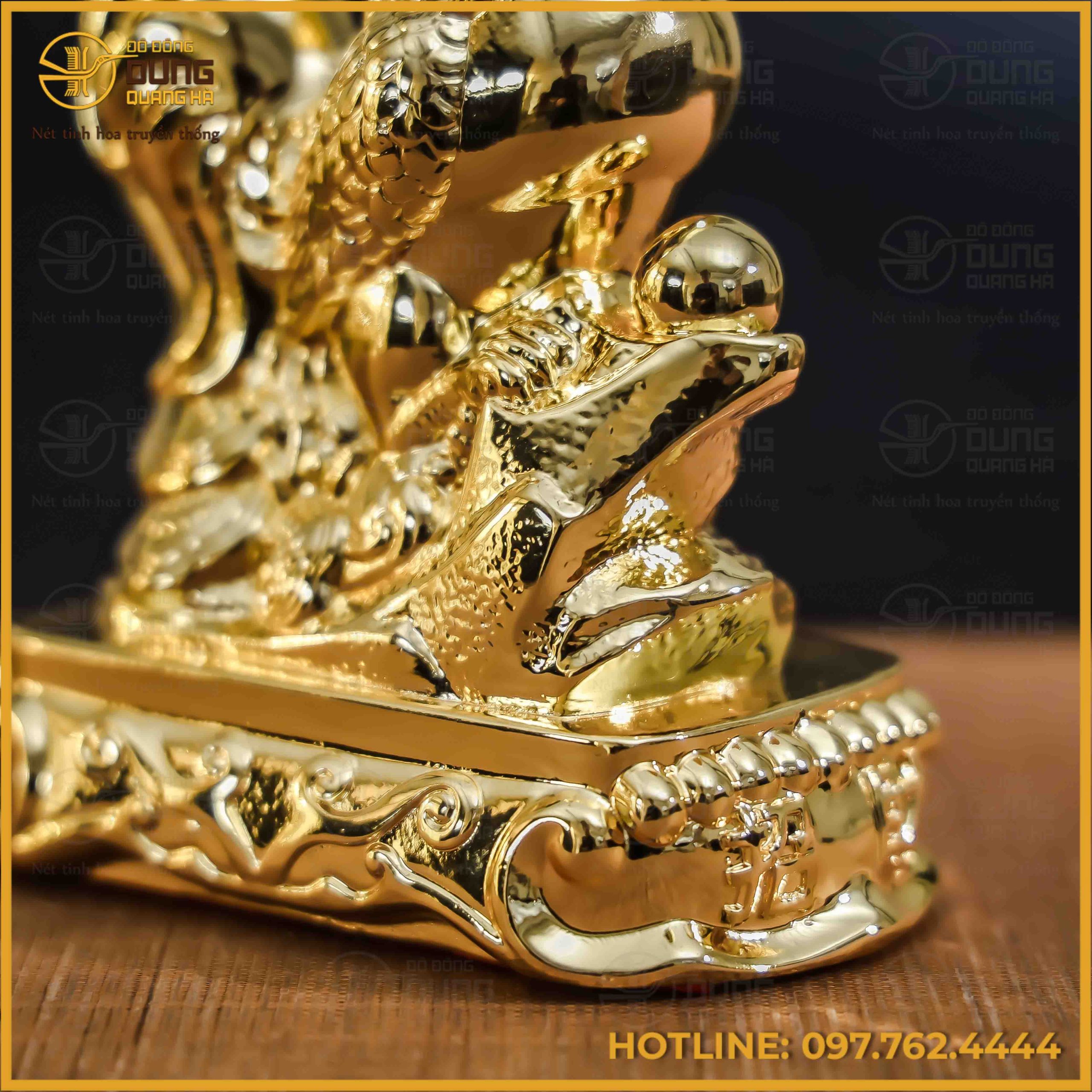 Dưới chân linh vật là một sự kết hợp tạo hình phong phú giữa các biểu tượng của sự đủ đầy. Chú gà đứng vững trên một tảng đá góc cạnh, xung quanh là những thỏi vàng lớn nhỏ và những chồng tiền xu cổ xếp lớp san sát. Đặc biệt, ngay phía trước chân gà là một gậy Như Ý uốn lượn mềm mại, trên đầu gậy nâng đỡ một viên ngọc tròn trịa, trơn nhẵn. Toàn bộ cấu trúc này đặt trên chiếc bệ chân quỳ cách điệu với những đường nét hoa văn xoắn ốc tinh tế ở bốn góc. Mặt chính diện của bệ đỡ có một khung chữ chữ Hán được đúc nổi sắc nét, giúp hoàn thiện vẻ đẹp tinh xảo và sang trọng cho pho tượng.