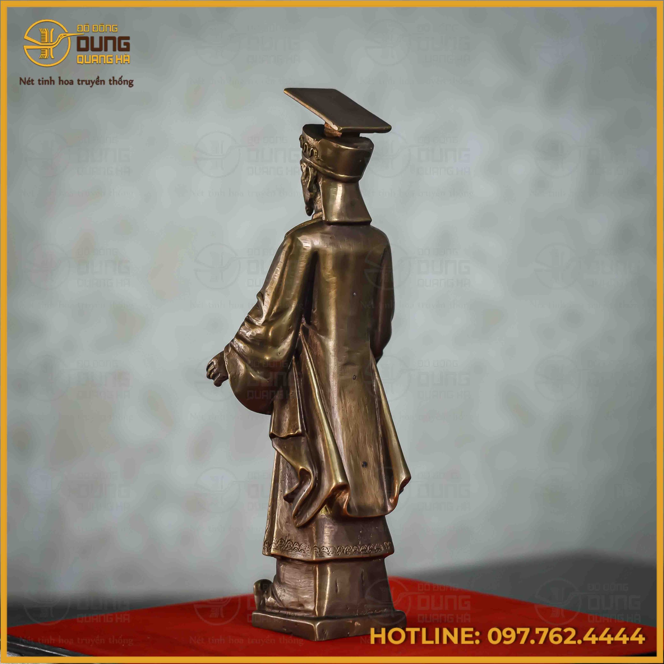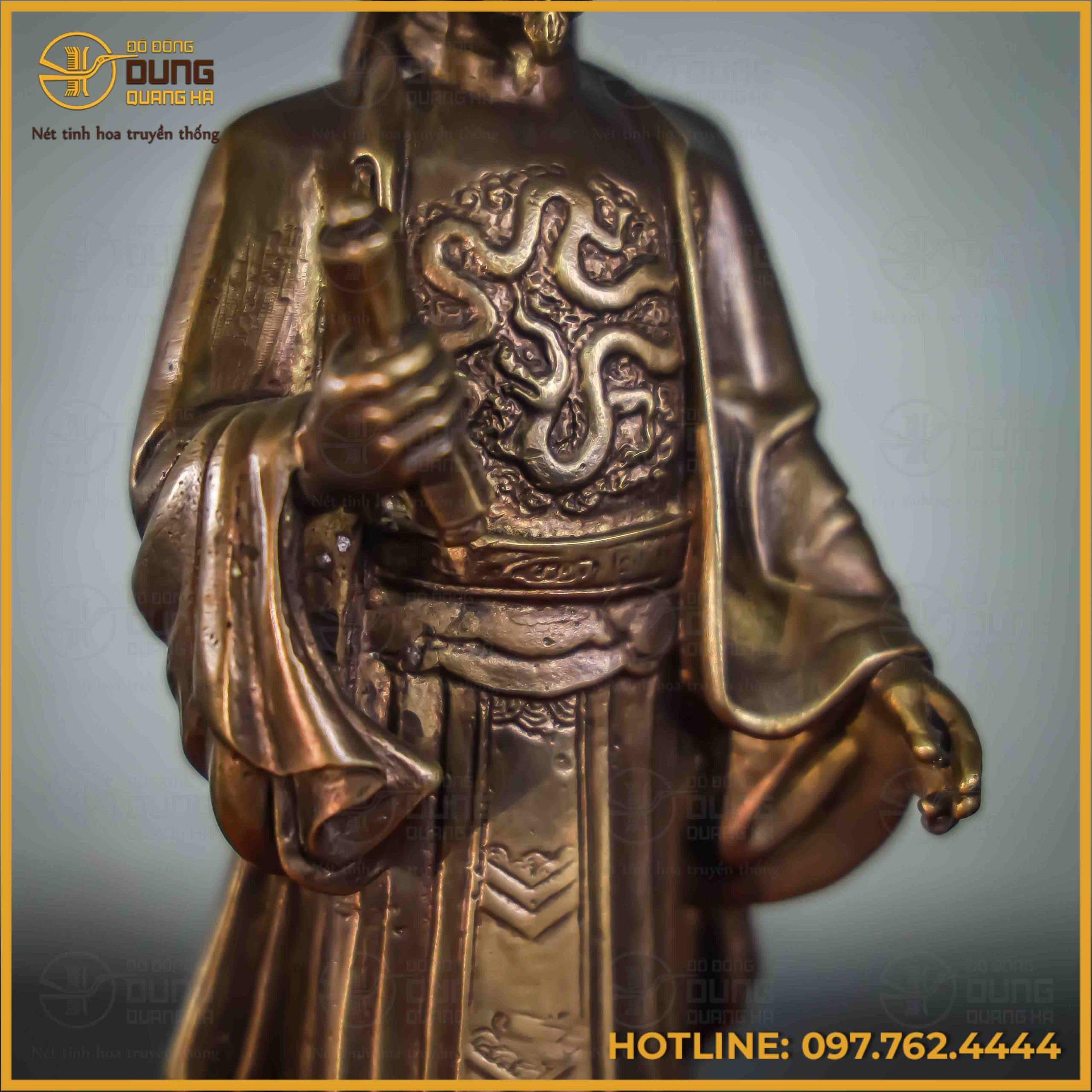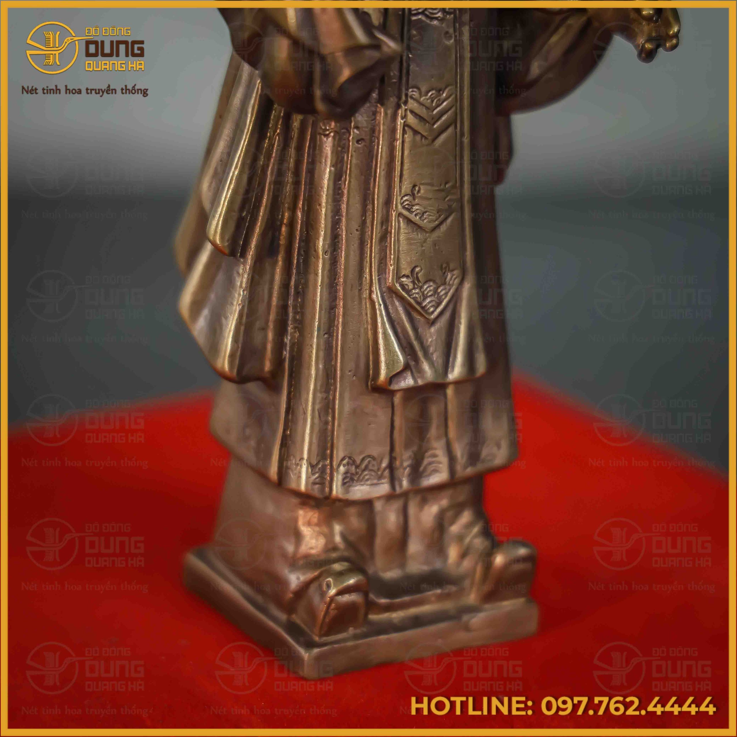 Tượng sử dụng chất liệu đồng vàng với bề mặt xử lý màu tự nhiên, mang sắc ánh kim ấm áp, sang trọng nhưng không phô trương. Lớp hoàn thiện được đánh bóng vừa phải, giữ lại chiều sâu của kim loại, giúp các chi tiết nổi khối rõ ràng hơn dưới ánh sáng. Tổng thể màu sắc tạo cảm giác cổ kính, bền vững, phù hợp với không gian thờ tự, phòng làm việc hoặc trưng bày trang trọng.
