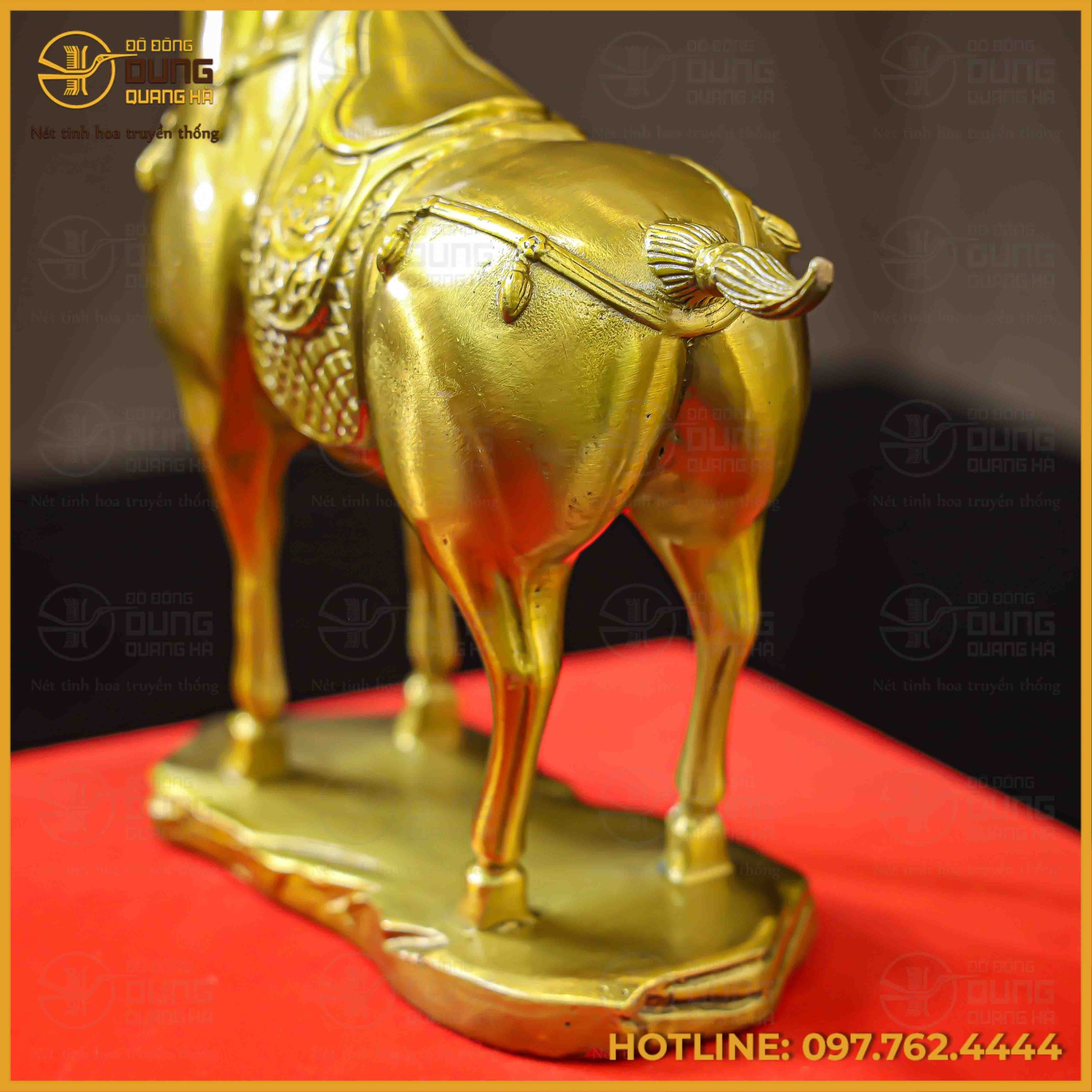 Tượng ngựa được chế tác từ chất liệu đồng vàng, toát lên sắc vàng kim rực rỡ và vô cùng sang trọng. Bề mặt sản phẩm được xử lý bóng mịn, phản chiếu ánh sáng tự nhiên tạo nên vẻ đẹp long lanh, cuốn hút mọi ánh nhìn. Gam màu vàng kim kinh điển này không chỉ tượng trưng cho sự giàu sang, phú quý mà còn mang lại cảm giác ấm cộn và trang nghiêm cho không gian trưng bày.