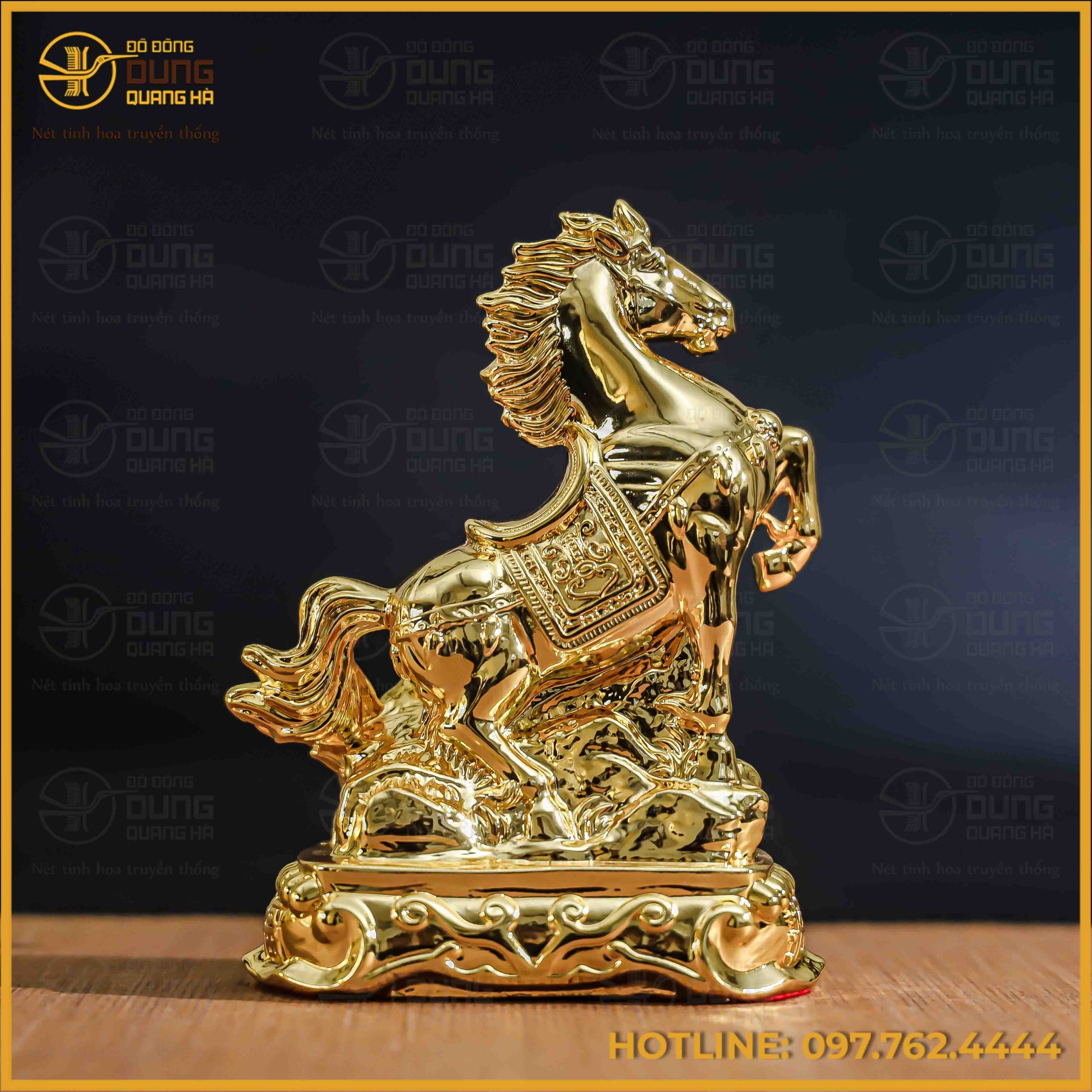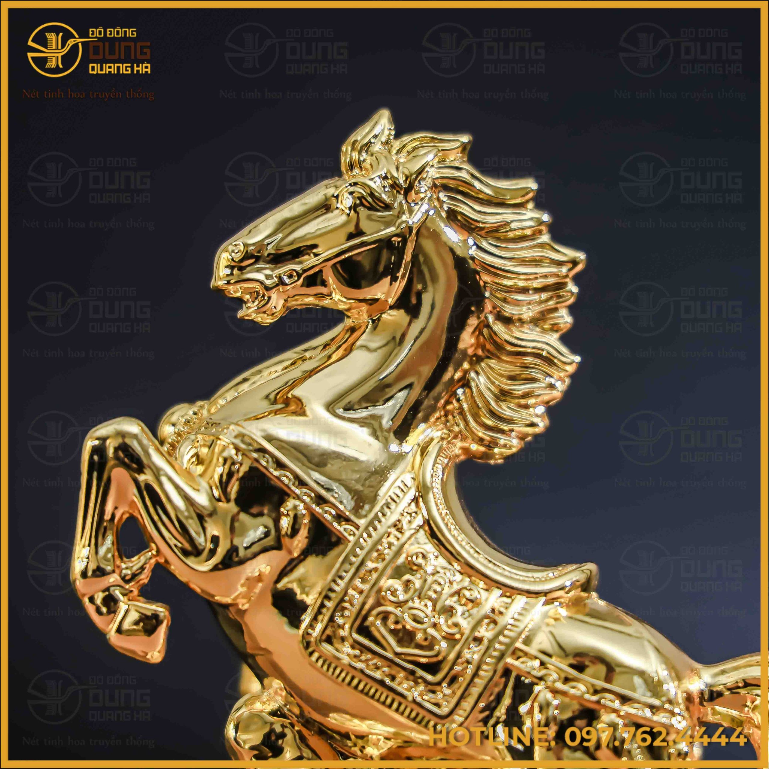 Sản phẩm toát lên vẻ đẹp sang trọng với lớp mạ vàng 24K sáng bóng, phản chiếu ánh sáng rực rỡ trên từng đường nét cơ bắp và bờm ngựa. Tone màu vàng kim nguyên bản bao phủ toàn bộ bề mặt, tạo cảm giác quý phái và bền bỉ đặc trưng của chất liệu đồng cao cấp. Sự đồng nhất về màu sắc từ phần thân ngựa đến đế tượng giúp tôn vinh trọn vẹn sự uy nghi và giá trị phong thủy của món đồ mỹ nghệ này.