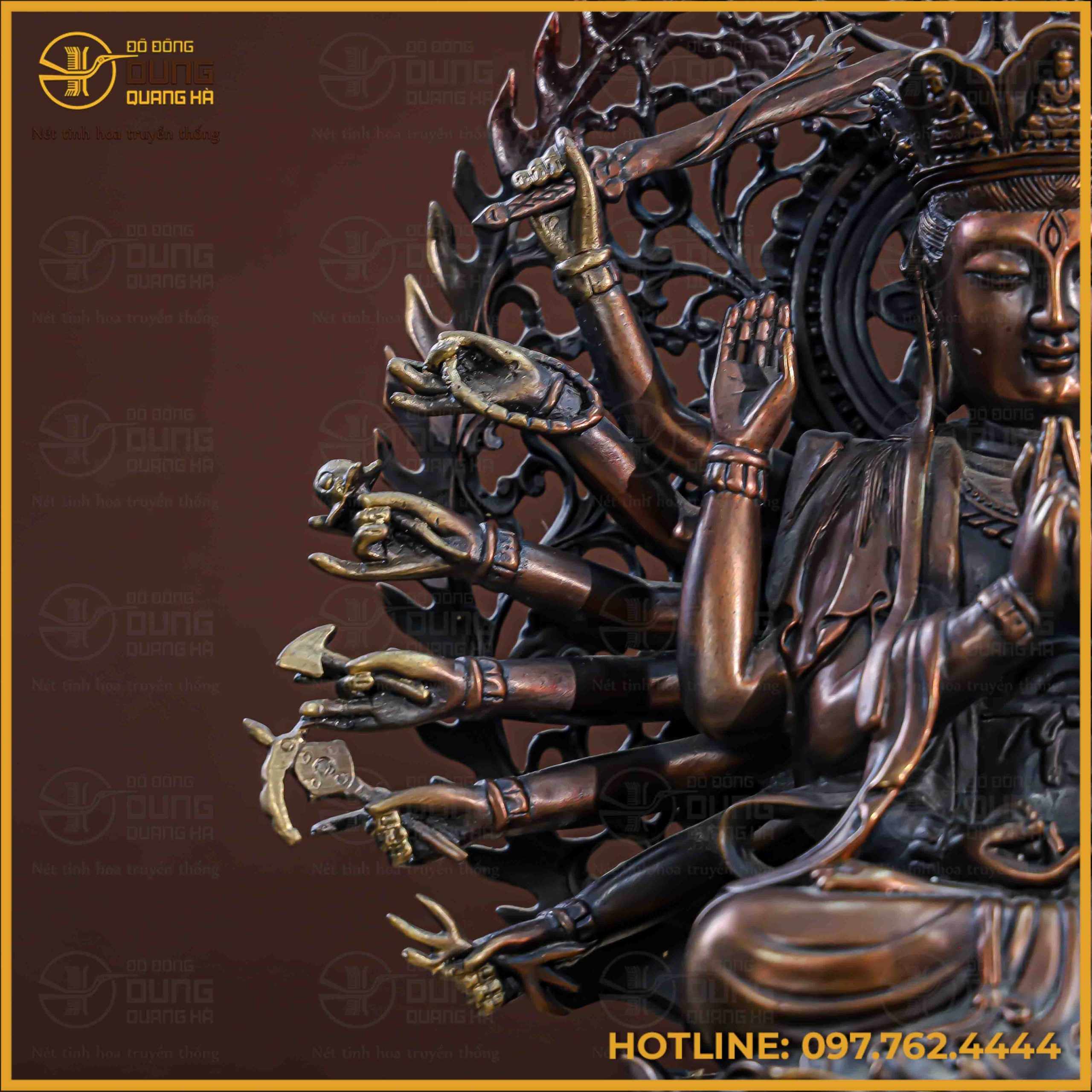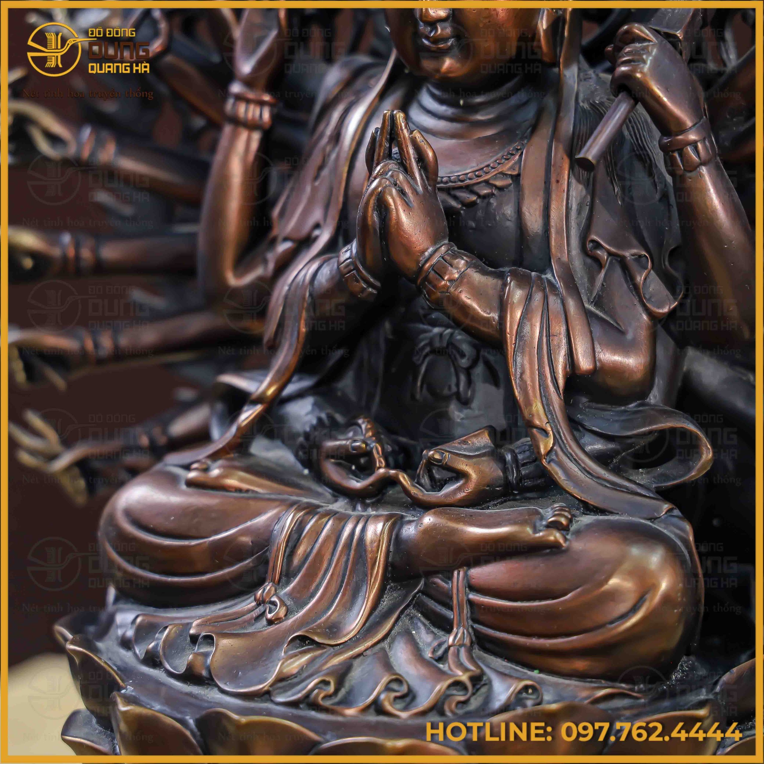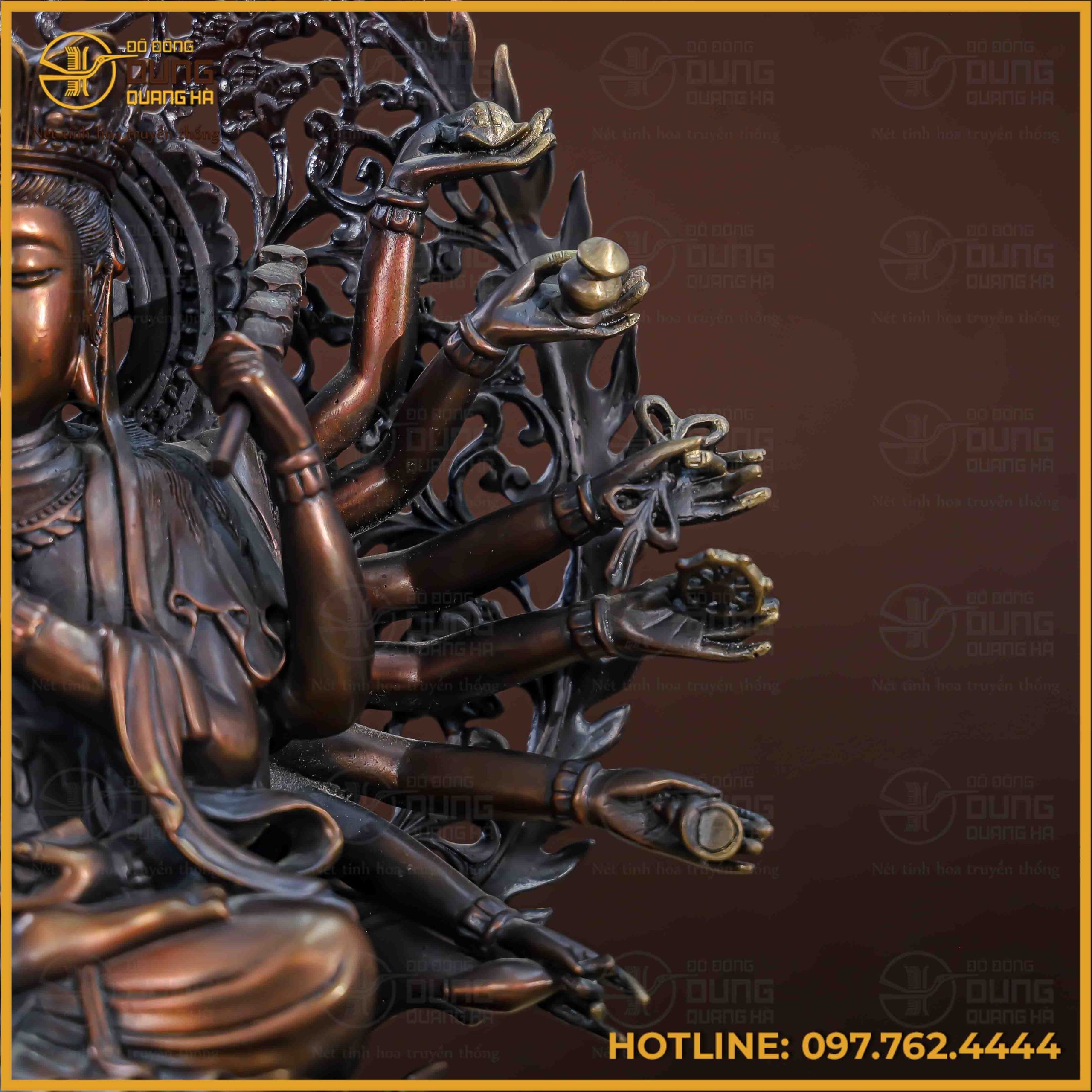 Pho tượng Phật Chuẩn Đề hiện lên với sắc đồng hun giả cổ trầm mặc, mang lại vẻ đẹp uy nghiêm, huyền bí và vô cùng thoát tục. Sự kết hợp tinh tế giữa các mảng màu sáng tối giúp làm nổi bật hệ thống cánh tay cùng các pháp khí được chạm khắc tỉ mỉ, sắc nét. Gam màu bền bỉ này không chỉ tôn vinh nét cổ kính của tác phẩm mà còn tạo nên sự tĩnh lặng, trang trọng cho không gian thờ tự.