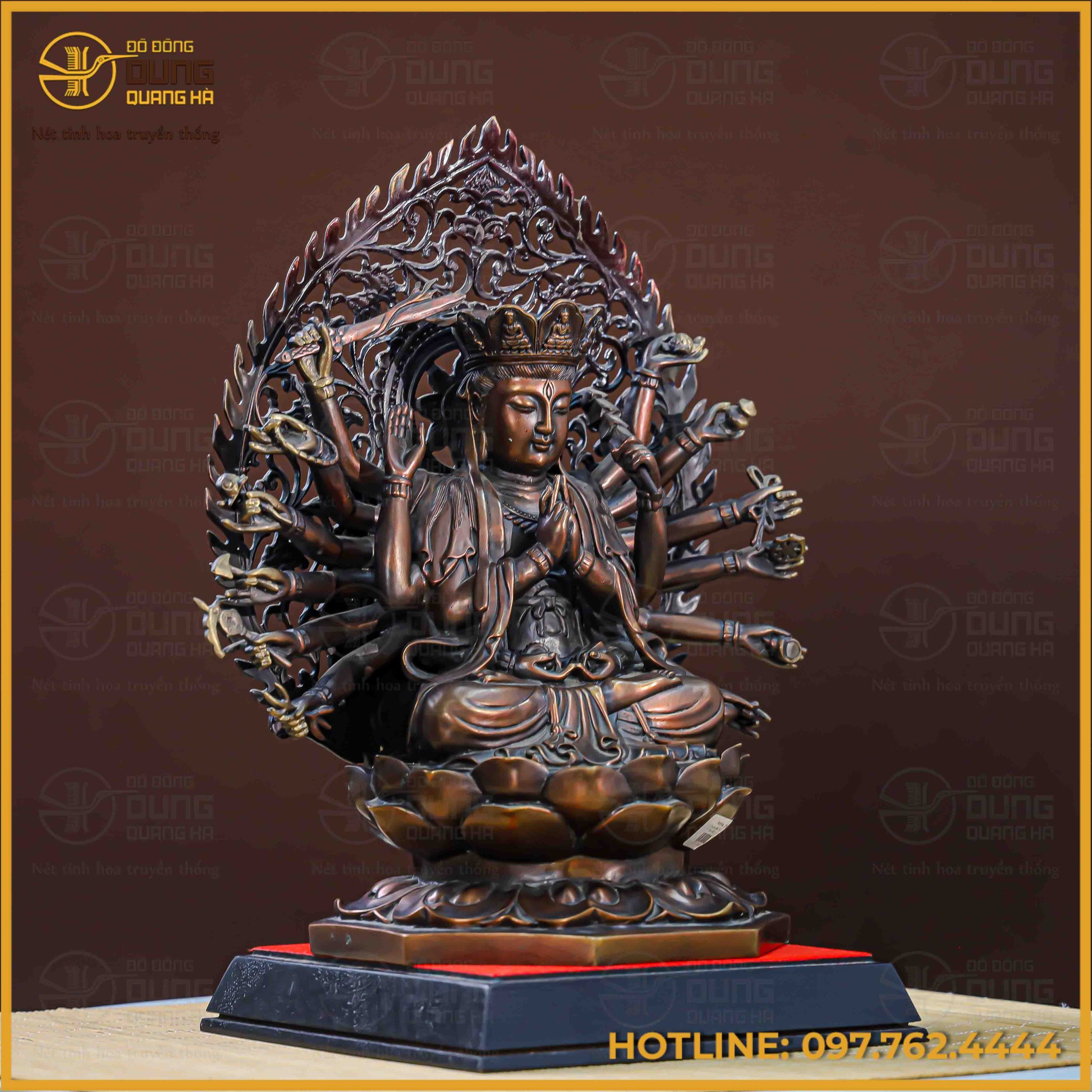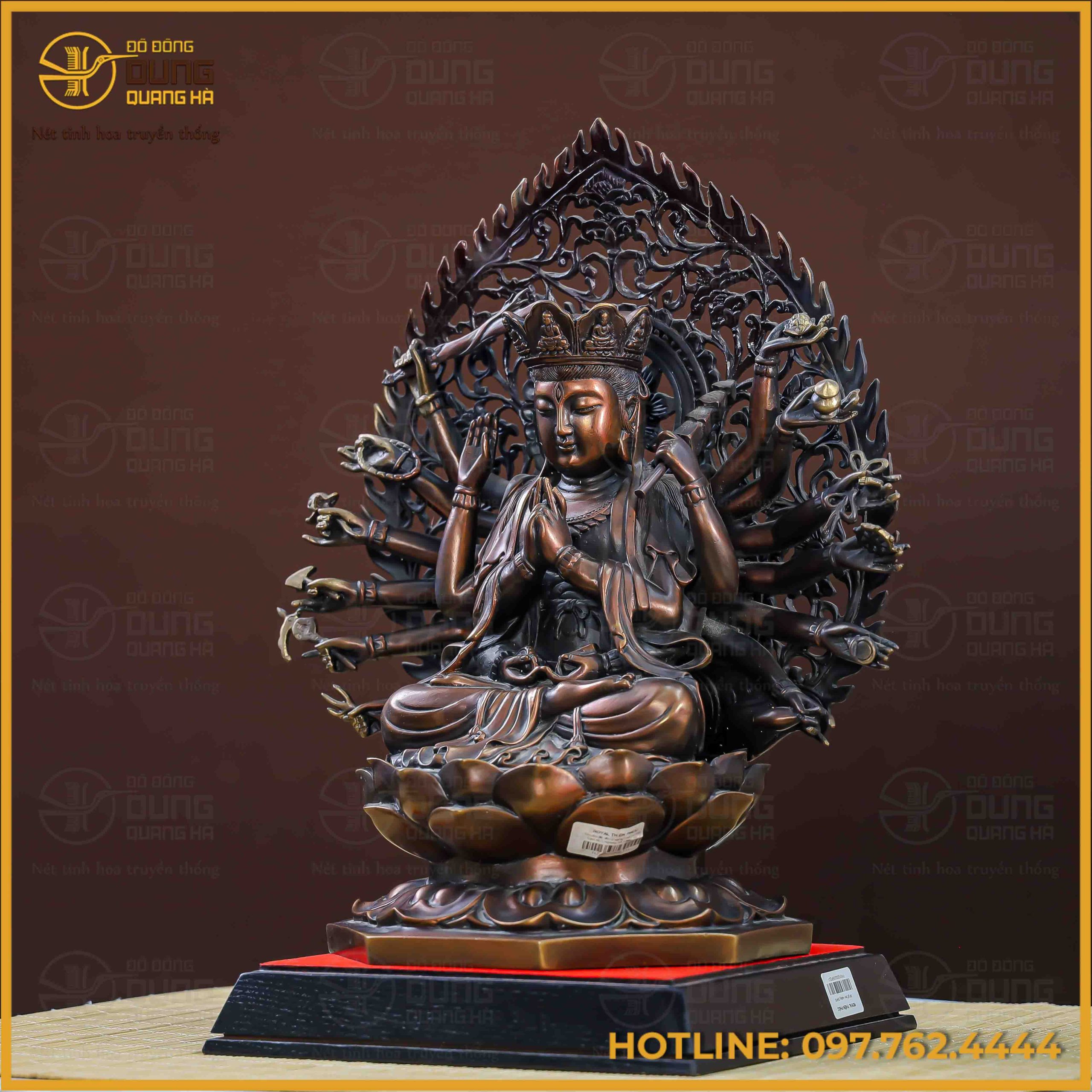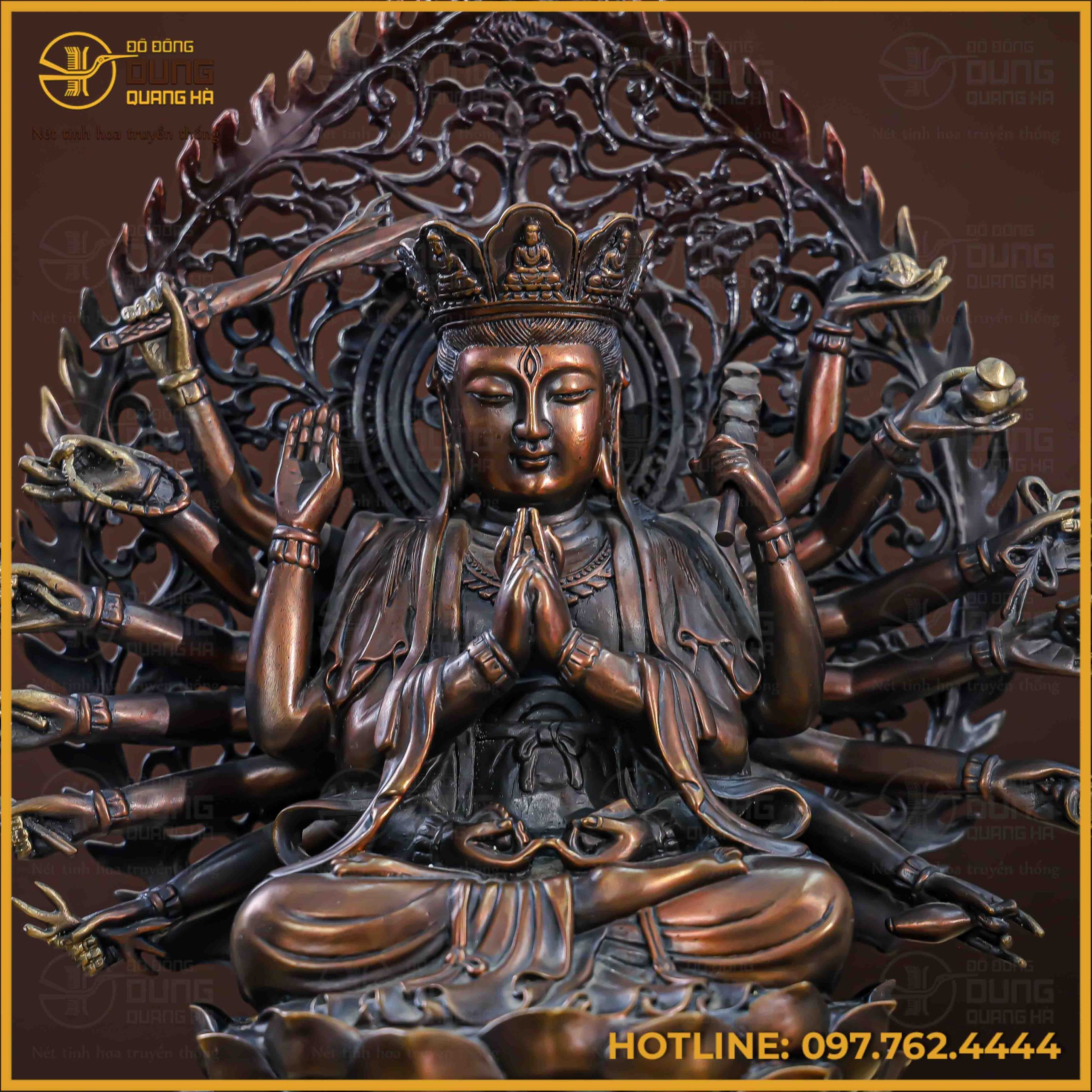 Pho tượng Phật Chuẩn Đề hiện lên với sắc đồng hun giả cổ trầm mặc, mang lại vẻ đẹp uy nghiêm, huyền bí và vô cùng thoát tục. Sự kết hợp tinh tế giữa các mảng màu sáng tối giúp làm nổi bật hệ thống cánh tay cùng các pháp khí được chạm khắc tỉ mỉ, sắc nét. Gam màu bền bỉ này không chỉ tôn vinh nét cổ kính của tác phẩm mà còn tạo nên sự tĩnh lặng, trang trọng cho không gian thờ tự.