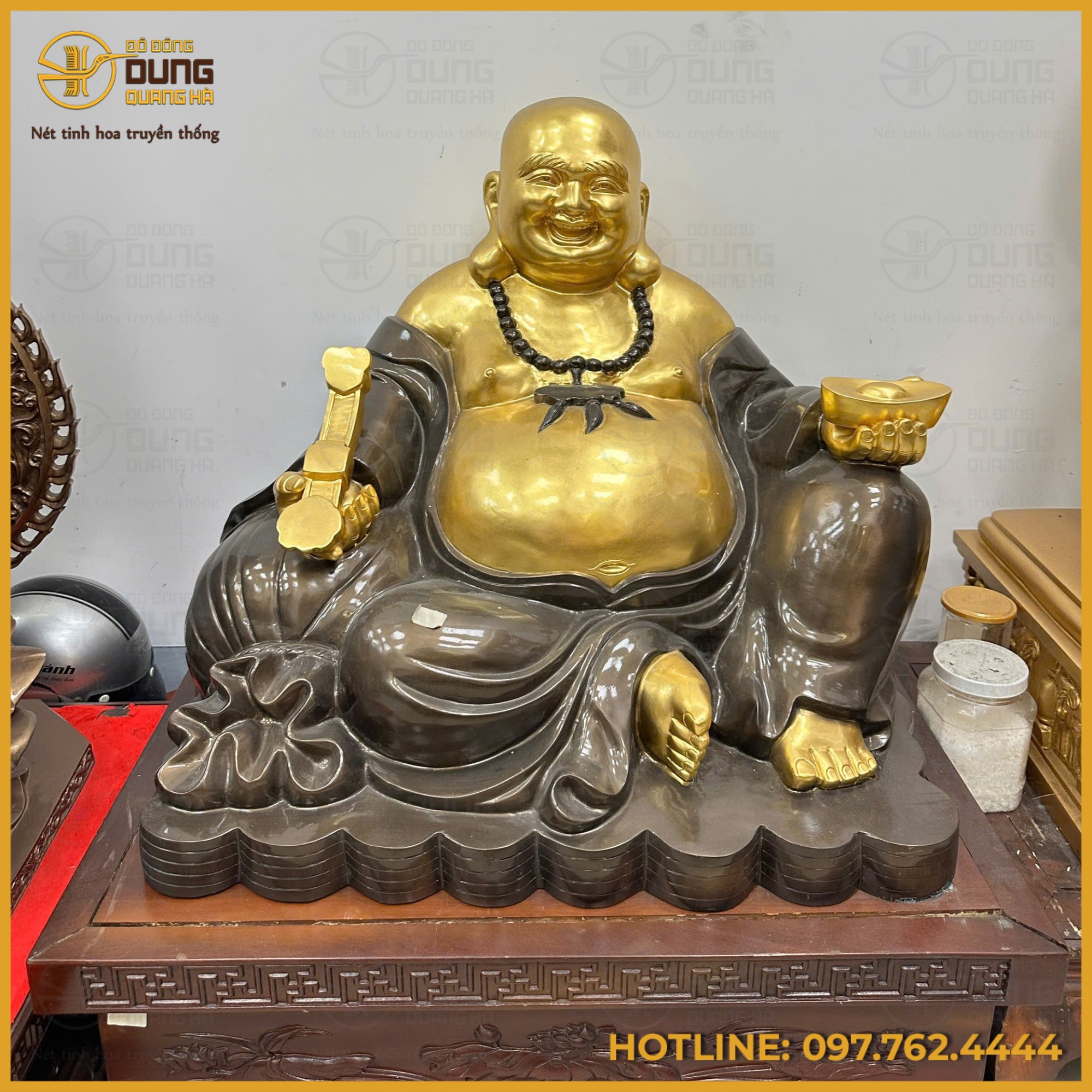Sản phẩm toát lên vẻ đẹp vương giả nhờ sự kết hợp tài tình giữa lớp màu vàng rực rỡ và kỹ thuật làm màu giả cổ tinh tế. Sắc vàng quý tộc bao phủ trọn vẹn những điểm nhấn quan trọng như diện mặt, ngực, bụng Phật và các bảo vật Ngài cầm trên tay, mang lại hiệu ứng lộng lẫy bền bỉ. Màu nâu đồng trầm mặc của lớp áo và chiếc bị tạo nên sự tương phản hoàn hảo, giúp tôn vinh những phần mạ vàng và làm cho tổng thể pho tượng trở nên sâu sắc, sang trọng hơn trong không gian trưng bày.