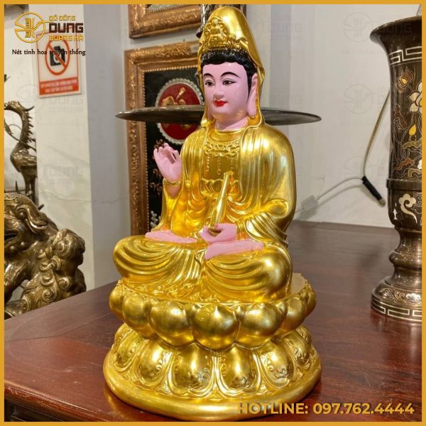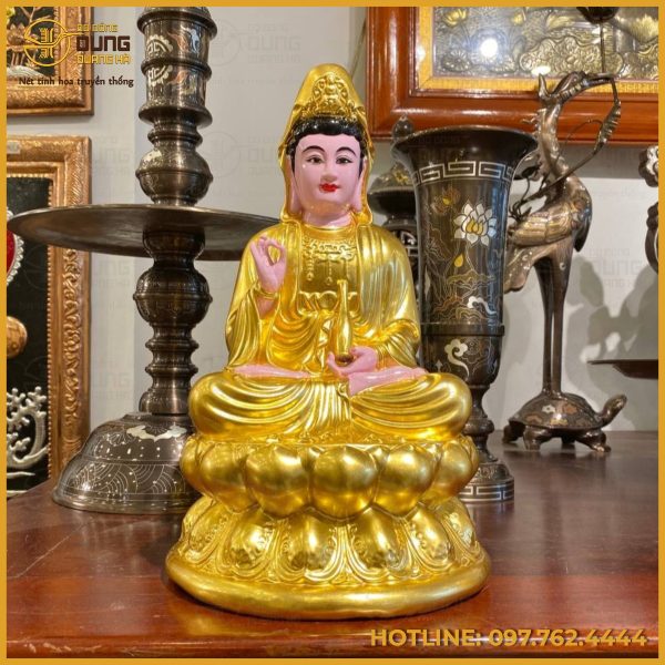 Màu sắc của tượng mang vẻ rực rỡ và tôn nghiêm. Toàn bộ áo choàng và đế sen được sơn màu vàng óng ánh, ánh vàng lan tỏa trên từng đường nét tạo nên cảm giác thiêng liêng, sang trọng và ấm áp. Khuôn mặt, bàn tay và bàn chân được sơn màu hồng nhạt tạo nét hiền hòa, gần gũi. Chính sự kết hợp giữa vàng lấp lánh và hồng dịu nhẹ làm cho tượng vừa uy nghi vừa nhân hậu, tỏa sáng lung linh trong không gian thờ tự.