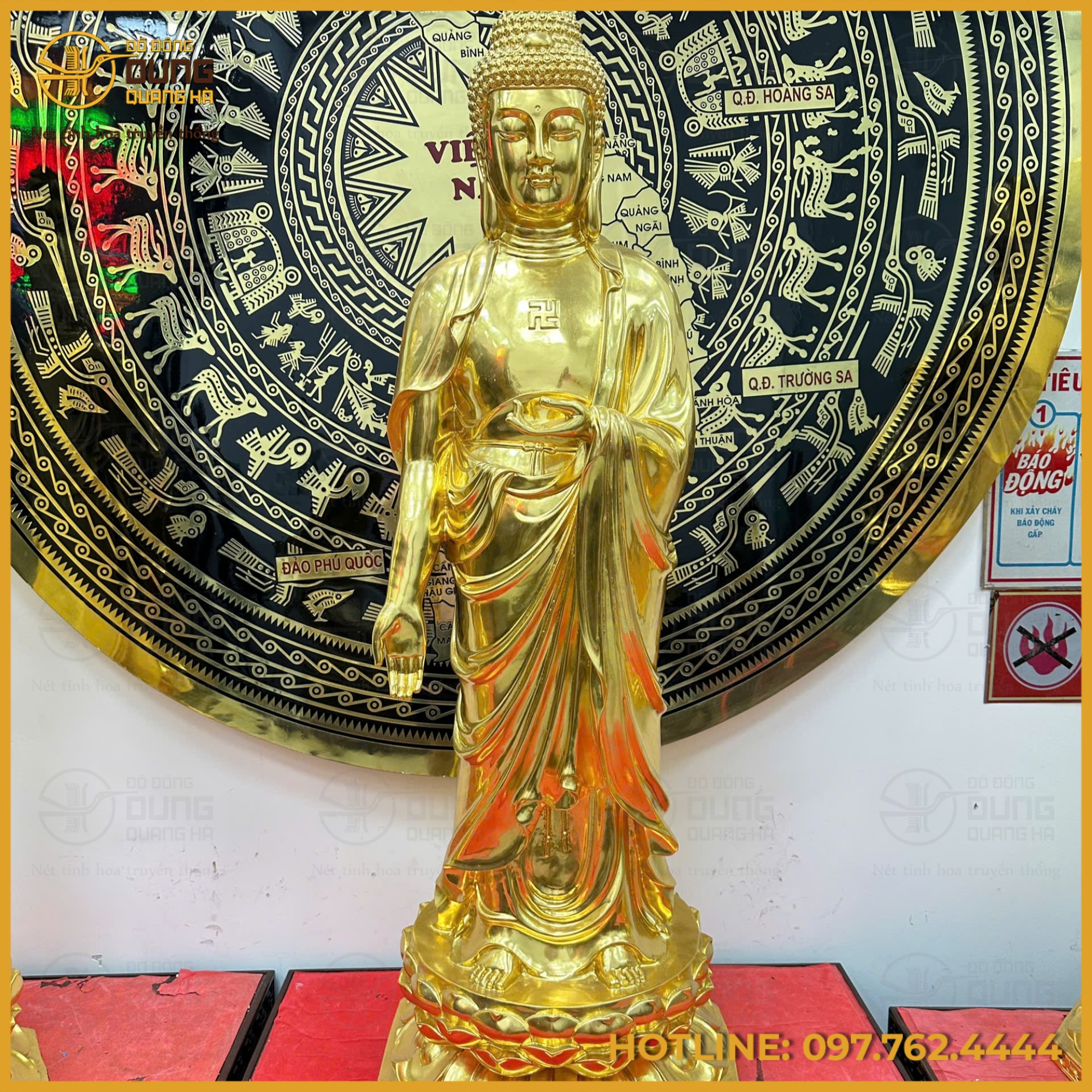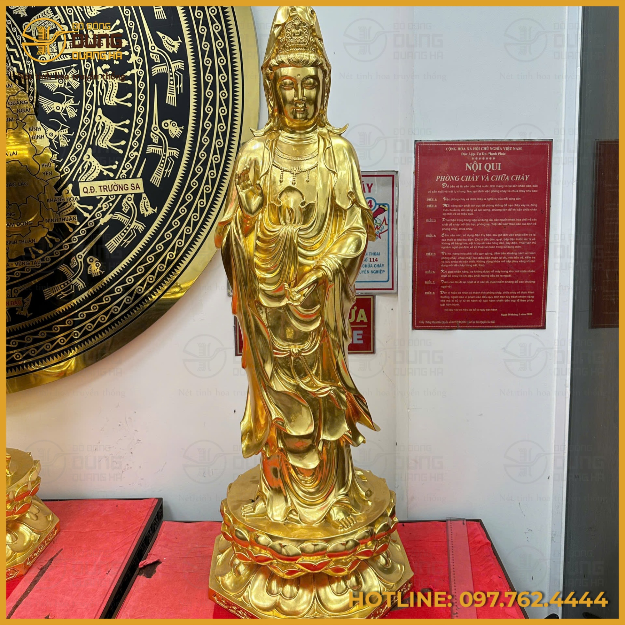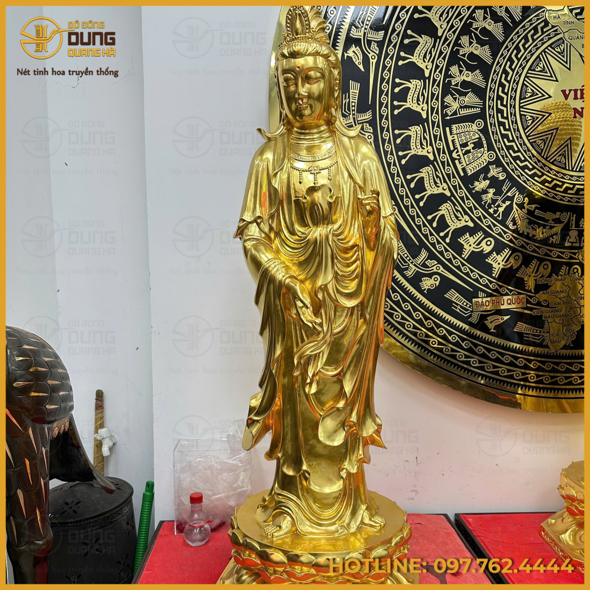 Sau khi đúc hoàn chỉnh, tượng được xử lý bề mặt và đánh bóng kỹ lưỡng để tạo nên sắc vàng sang trọng và bền đẹp theo thời gian. Những chi tiết nhỏ như gương mặt, nếp áo hay cánh sen đều được chăm chút tỉ mỉ, giúp bức tượng trở nên sống động và đầy thần thái.