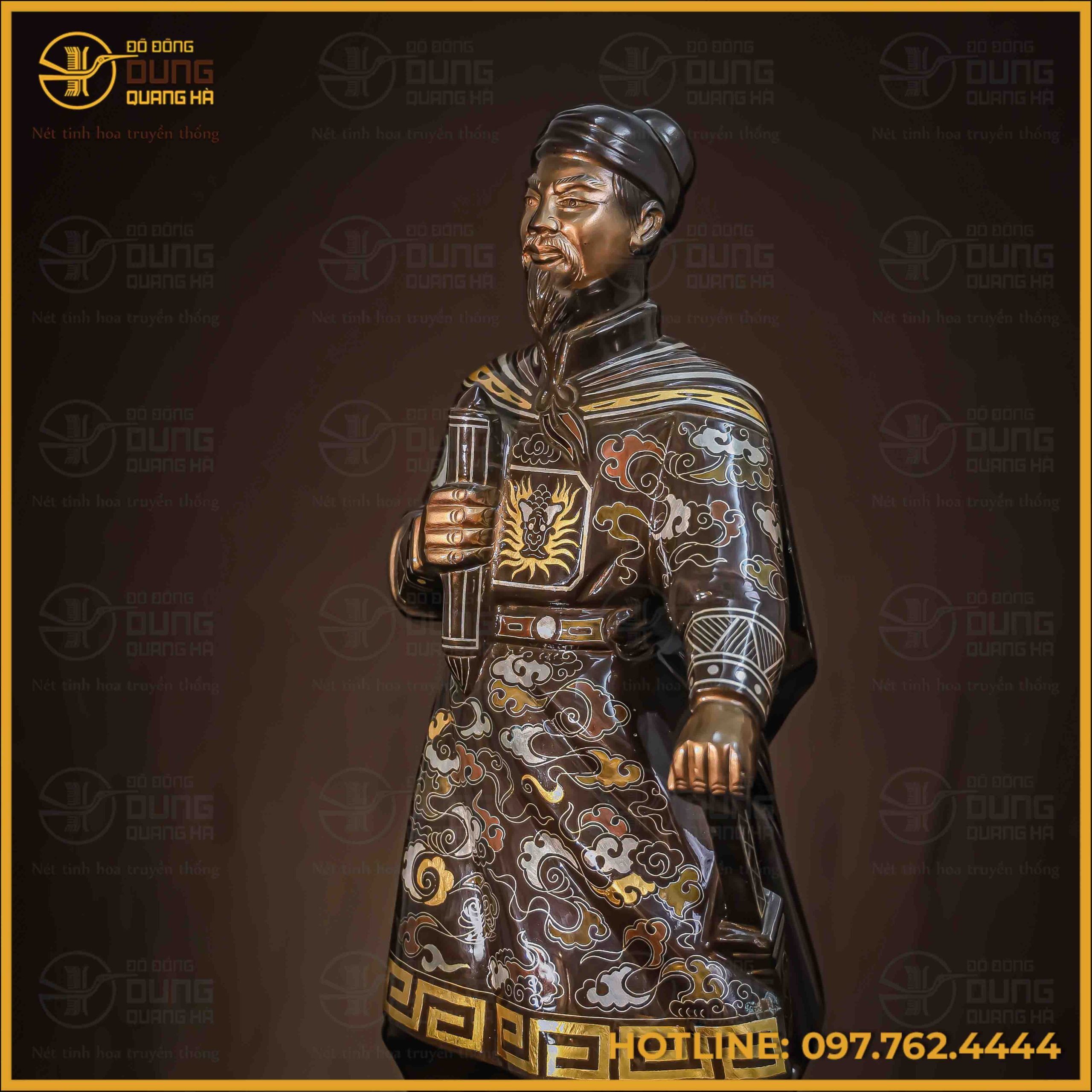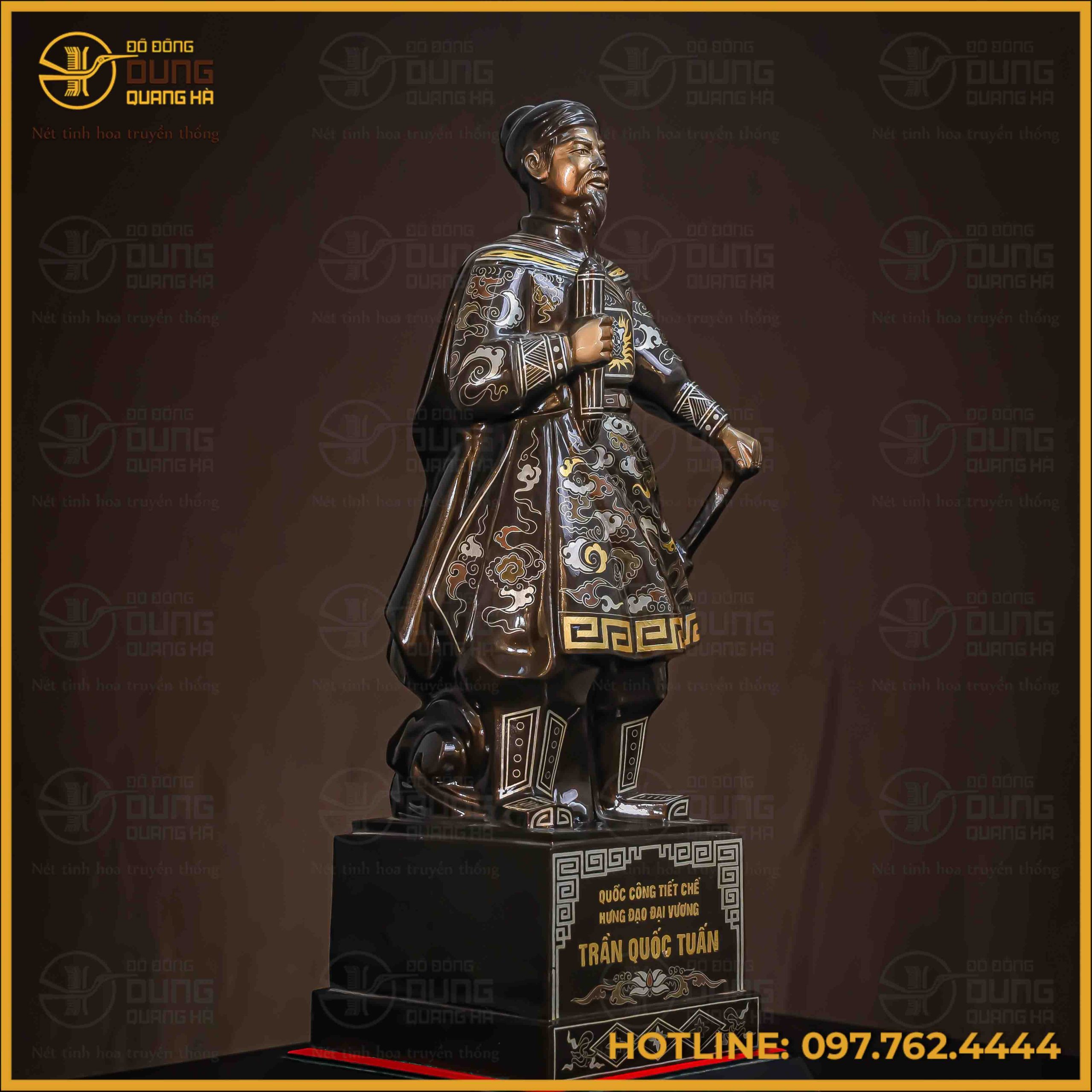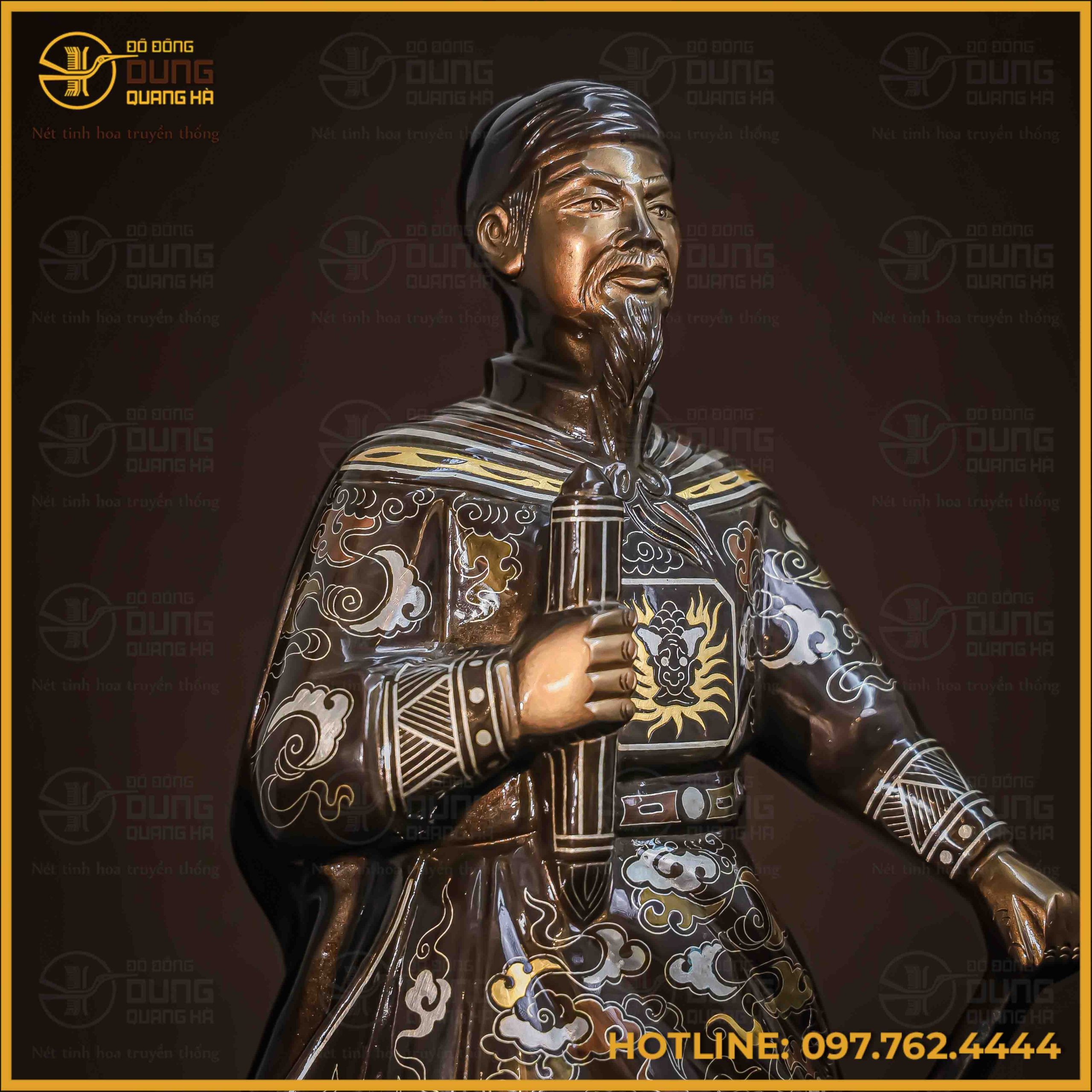 Tượng Trần Hưng Đạo đồng đỏ khảm ngũ sắc cao 38cm là sự kết tinh giữa tinh thần dân tộc và nghệ thuật chế tác kim loại đỉnh cao. Tác phẩm không chỉ tái hiện hình tượng vị anh hùng dân tộc lẫy lừng mà còn mang trong mình khí chất uy nghi, hào sảng – biểu trưng cho ý chí kiên cường và trí tuệ vượt thời đại.