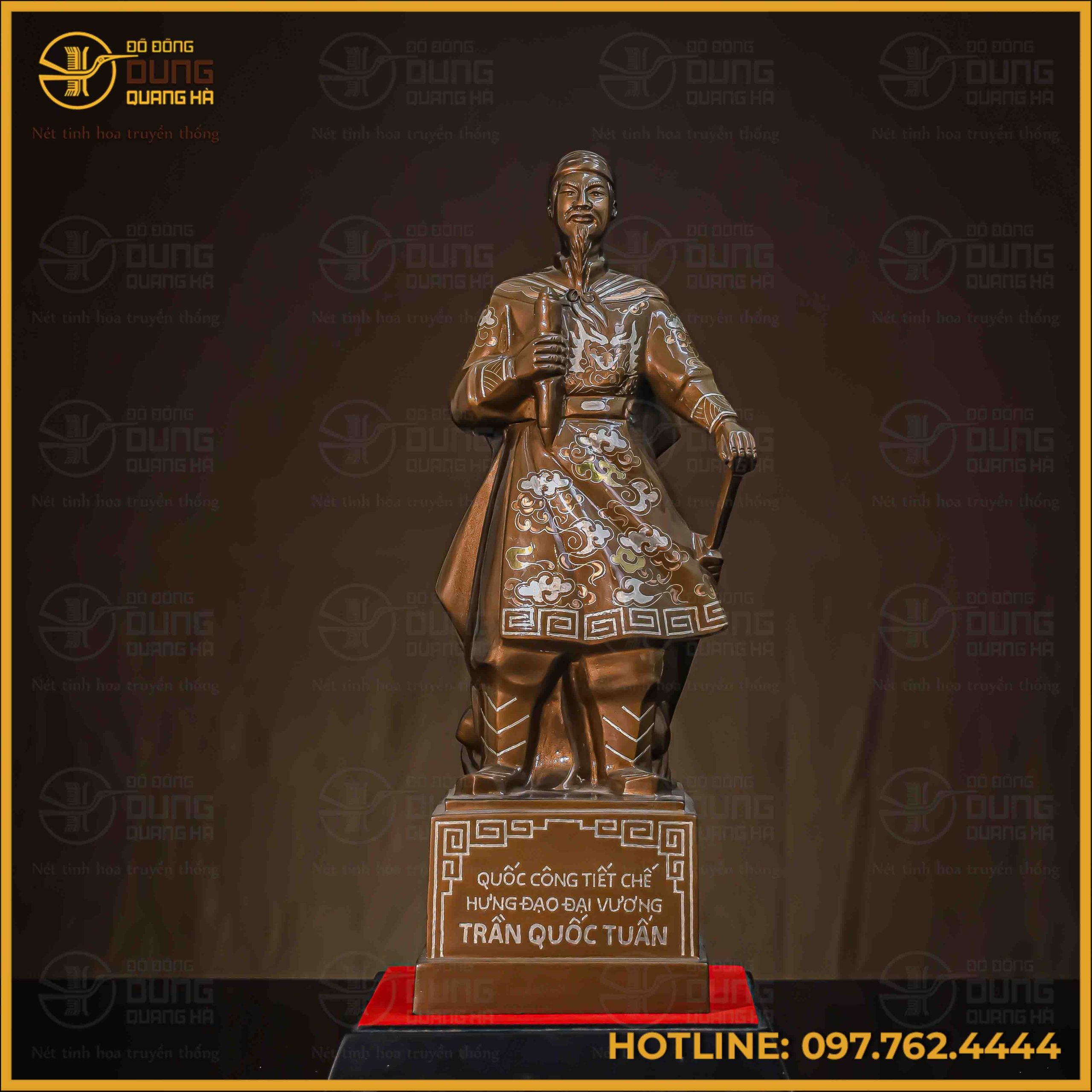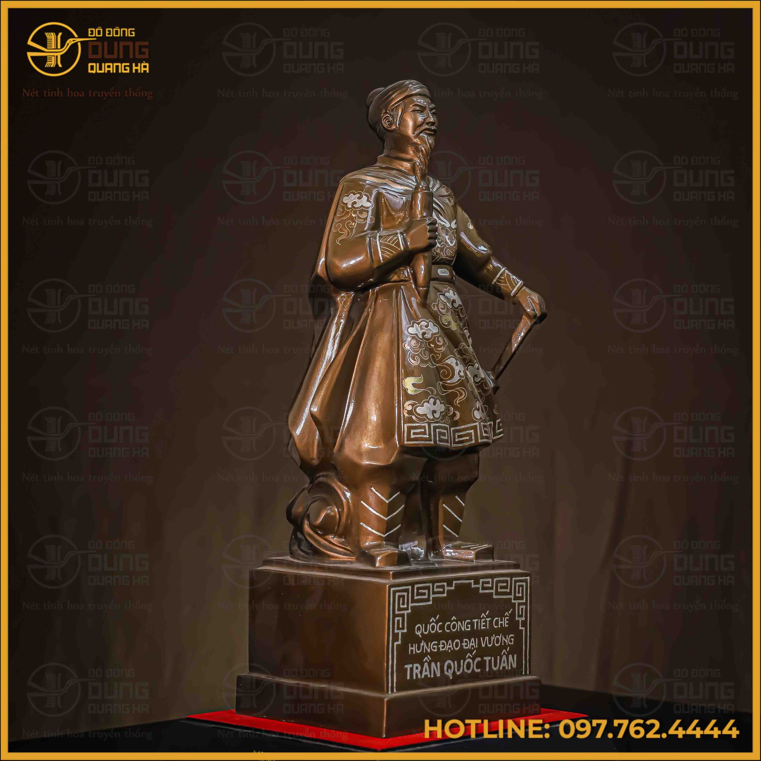 Đế tượng được thiết kế chắc chắn, thường khắc họa hình sóng nước hoặc hoa văn cổ điển, tượng trưng cho những chiến công lẫy lừng trên sông Bạch Đằng. Tổng thể bố cục hài hòa, cân đối, tạo nên một khối thống nhất vừa mạnh mẽ vừa trang nghiêm.