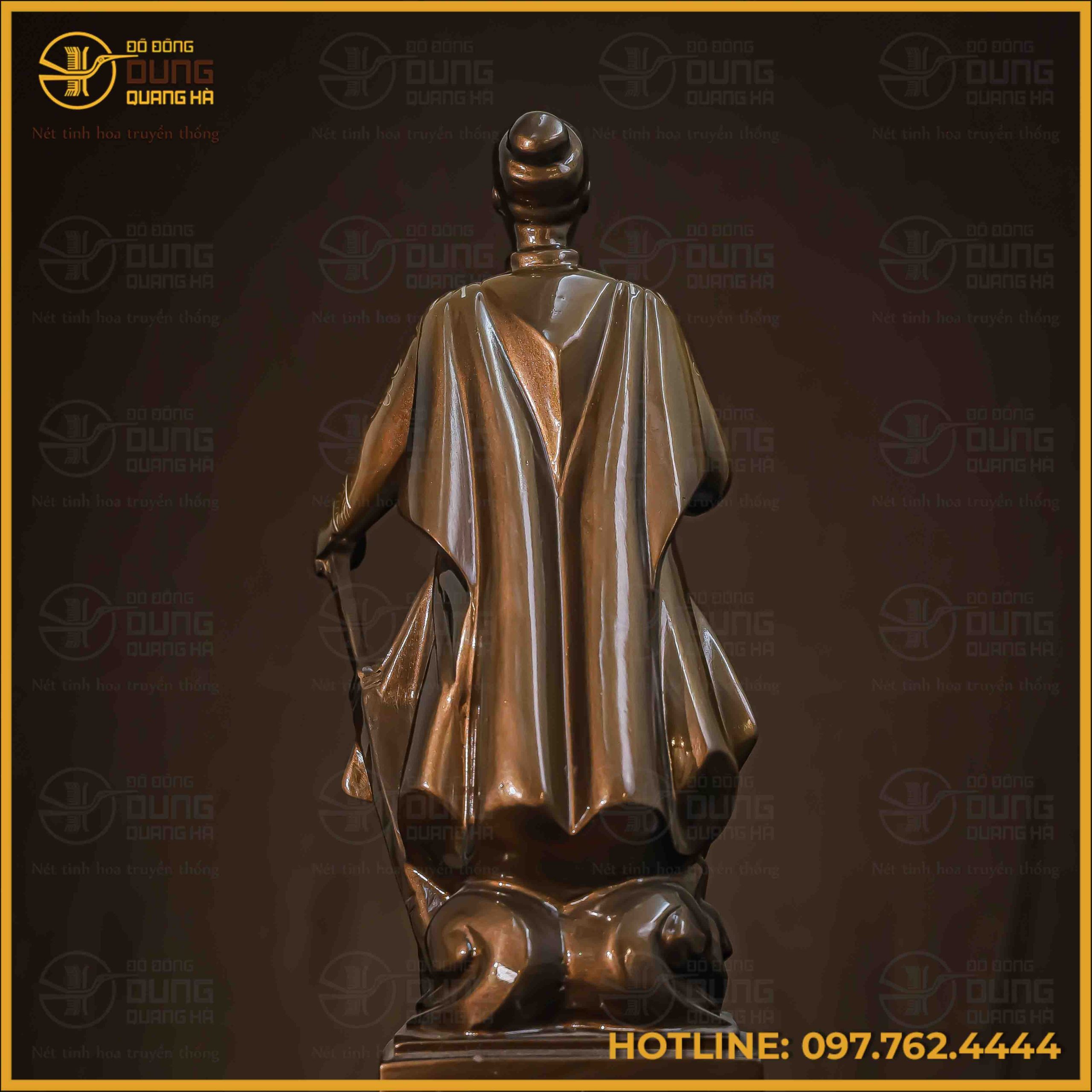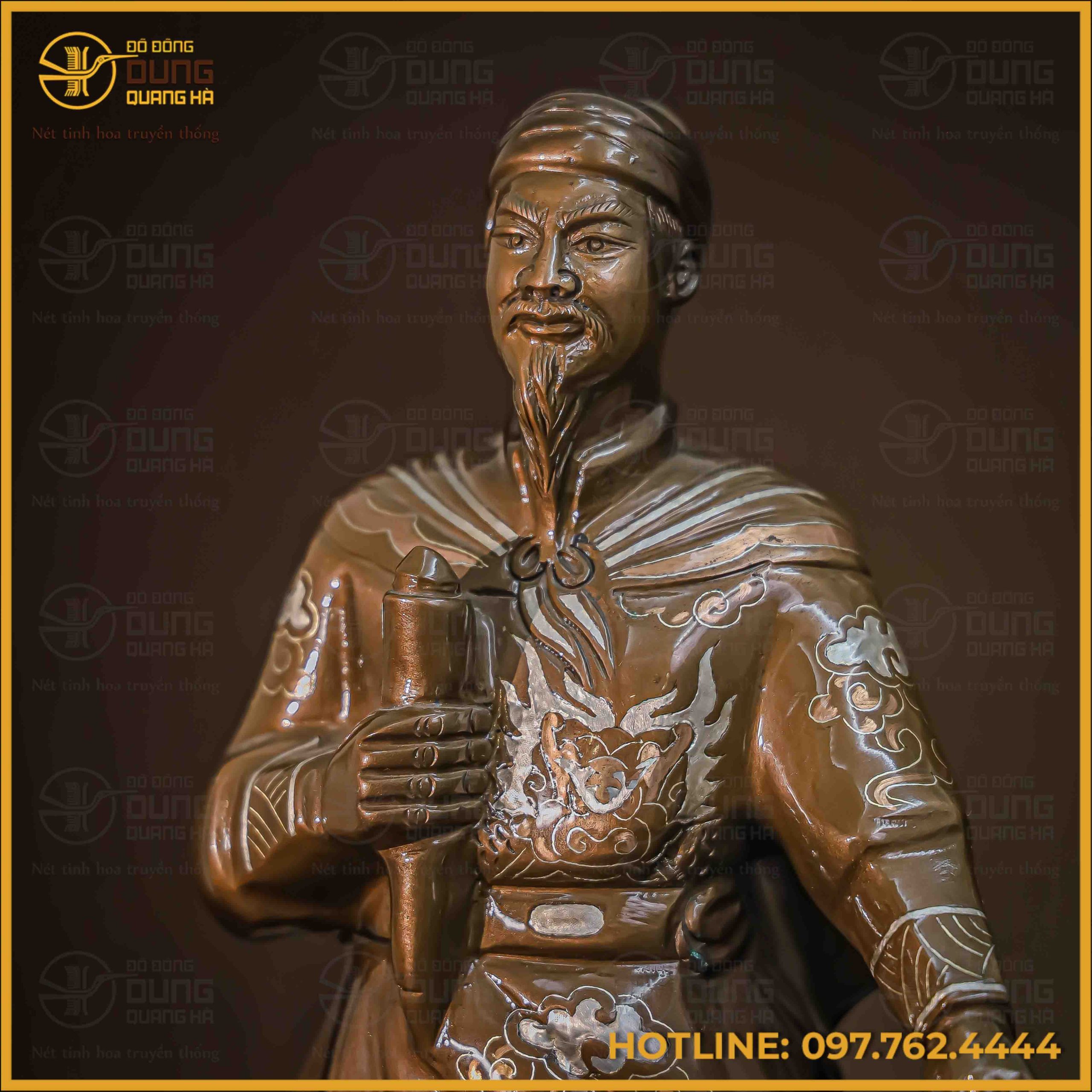 Áo giáp được chạm khắc cầu kỳ với từng lớp vảy giáp xếp chồng đều đặn, sắc nét, tạo chiều sâu sống động. Phần áo choàng phía sau buông nhẹ, tạo cảm giác chuyển động uyển chuyển mà vẫn giữ được sự bề thế. Khuôn mặt được thể hiện tỉ mỉ với râu dài, nét mặt trầm tĩnh nhưng đầy nội lực, làm nổi bật thần thái của một vị anh hùng dân tộc.
