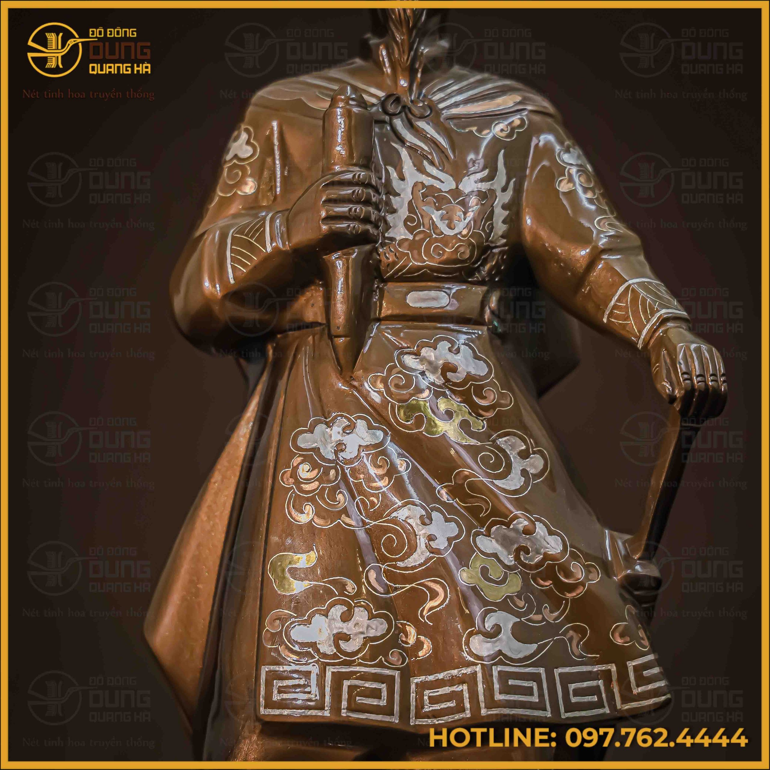 Sản phẩm nổi bật với nền đồng đỏ trầm ấm, kết hợp kỹ thuật khảm tam khí tinh xảo gồm vàng, bạc và đồng. Những chi tiết khảm được bố trí có chọn lọc trên áo giáp, đai lưng và hoa văn, tạo điểm nhấn nổi bật, ánh lên sắc kim khí sang trọng mà không phô trương.
