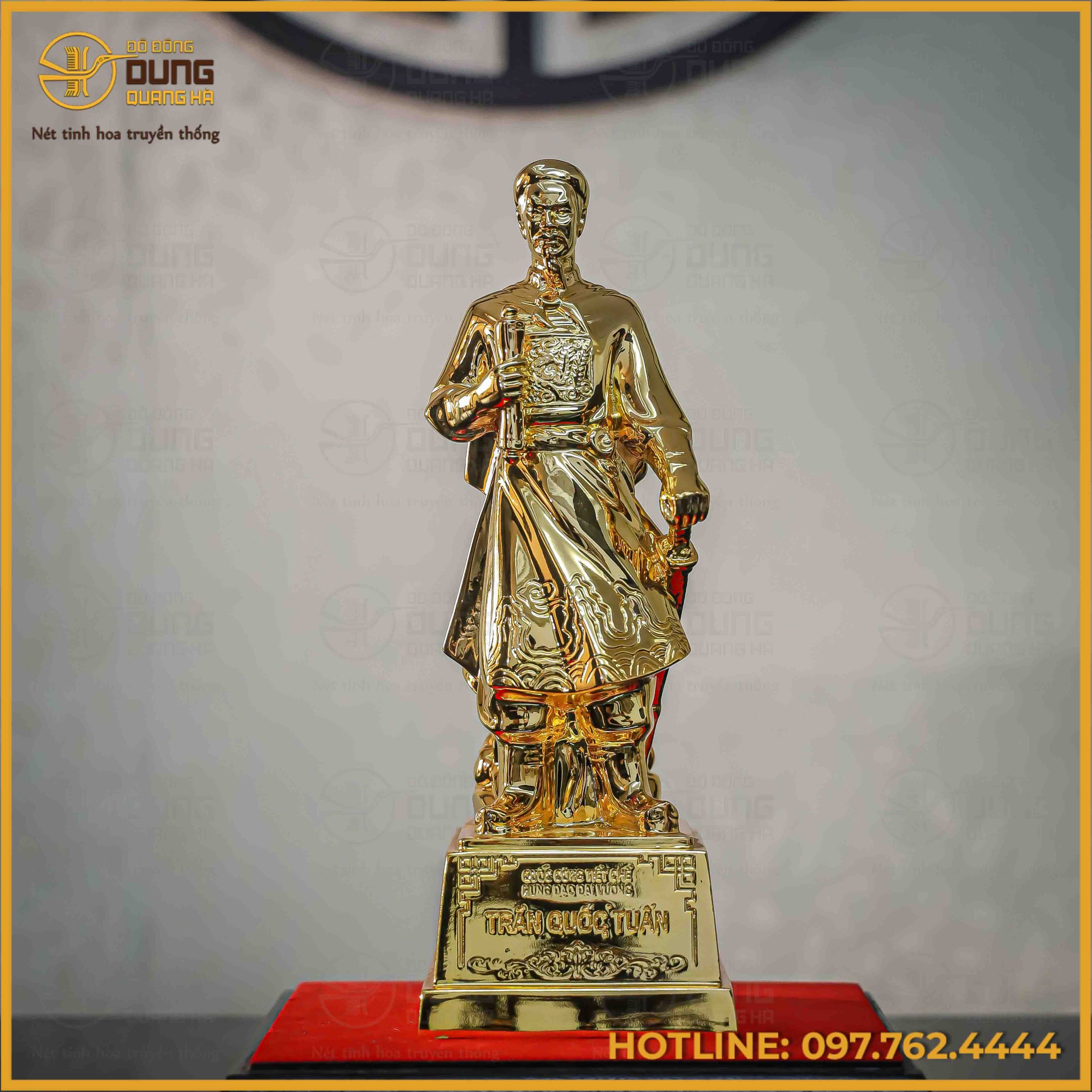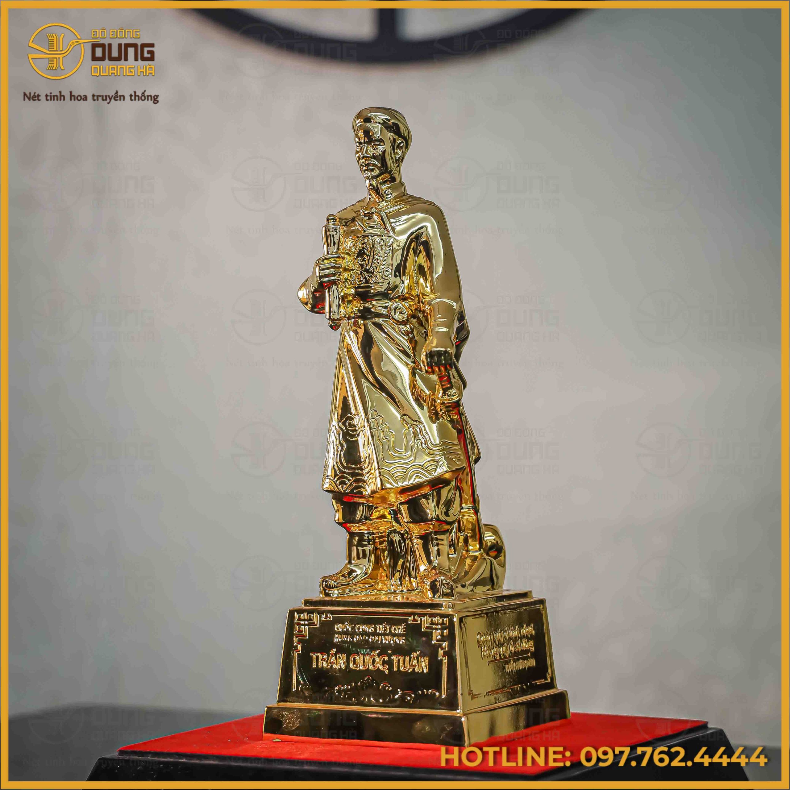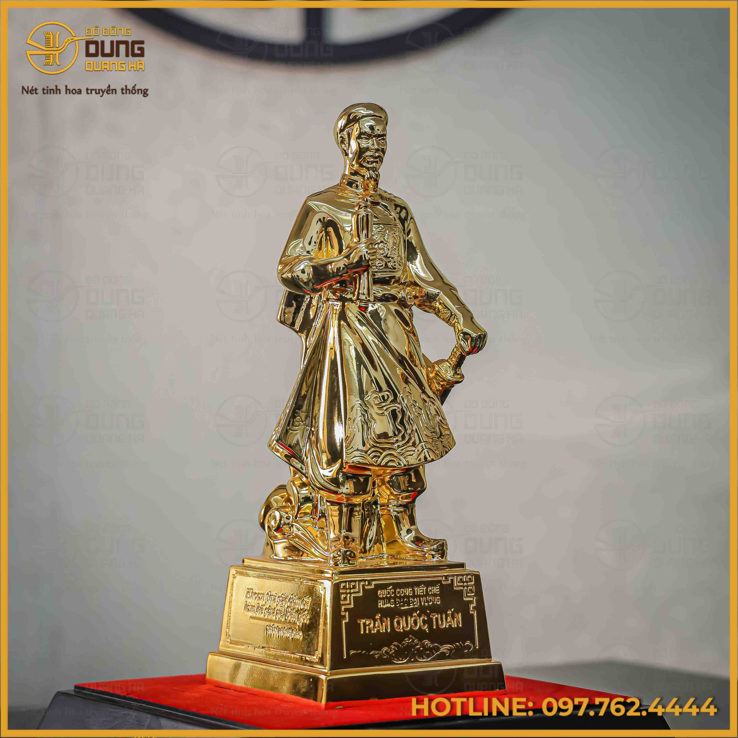 Tượng Trần Hưng Đạo đồng vàng mạ vàng là sự kết tinh giữa tinh thần dân tộc bất khuất và nghệ thuật chế tác thủ công tinh xảo. Từng đường nét không chỉ tái hiện chân dung vị anh hùng kiệt xuất mà còn truyền tải khí chất uy nghi, chính trực – biểu tượng cho trí tuệ và bản lĩnh của bậc vĩ nhân trong lịch sử.