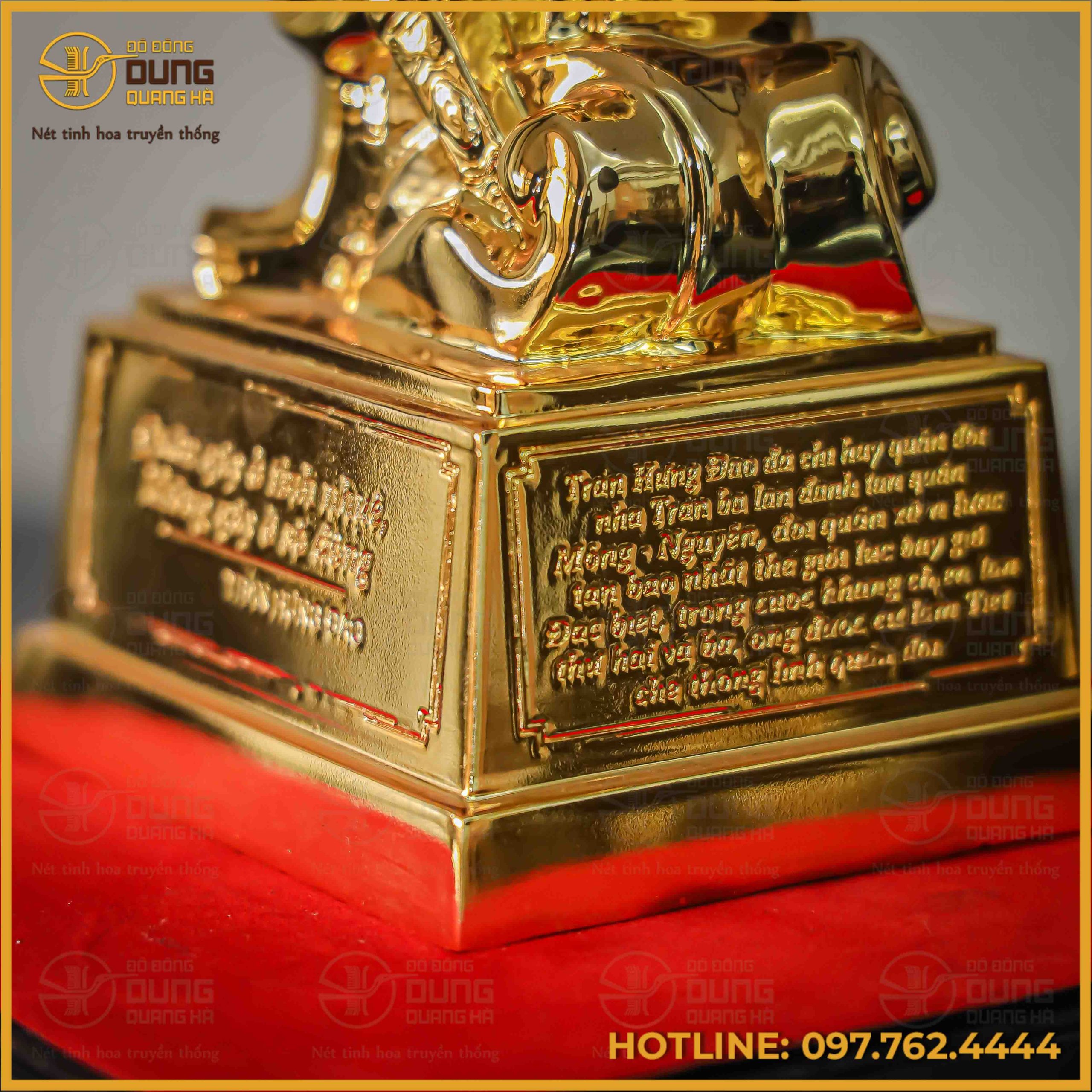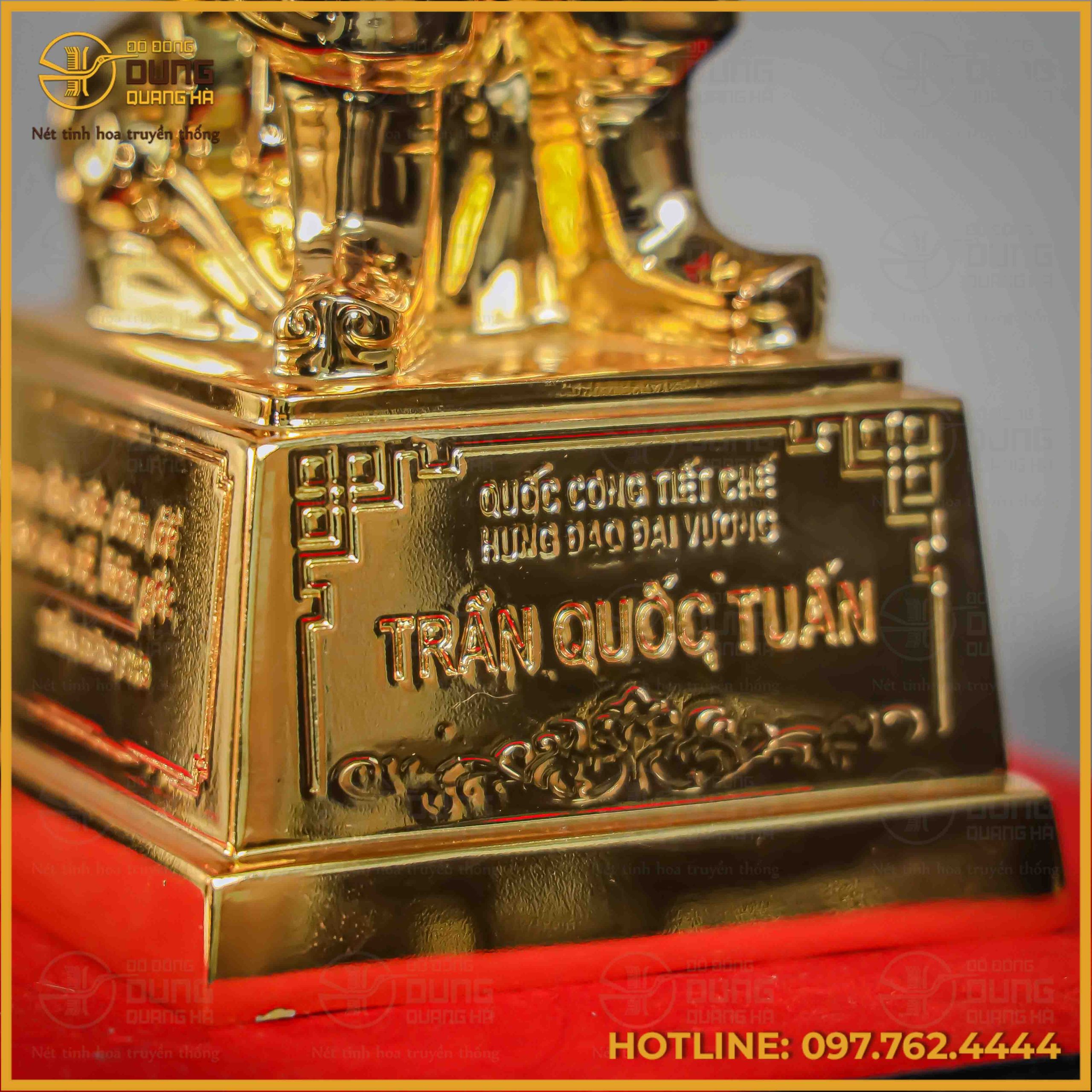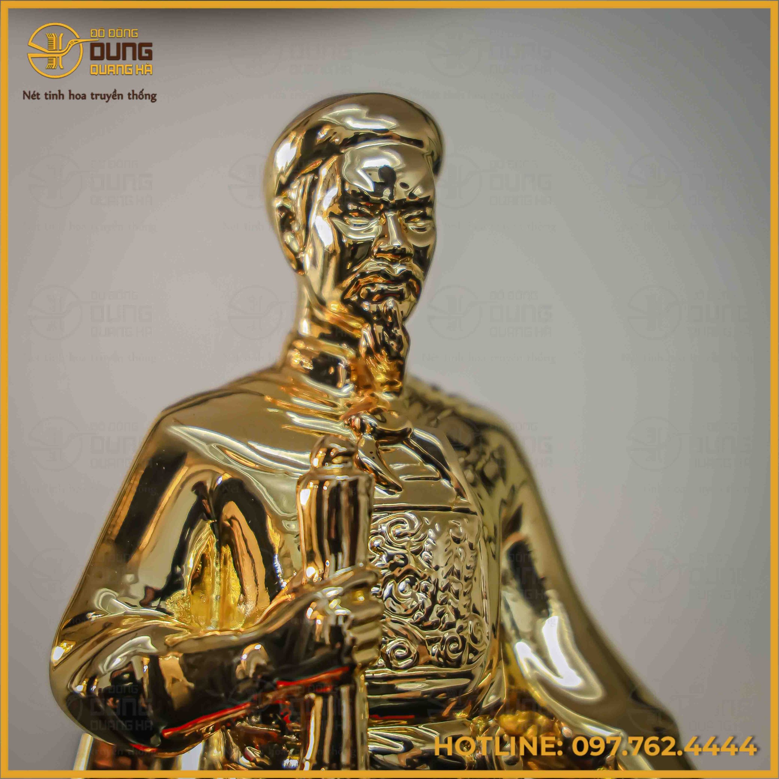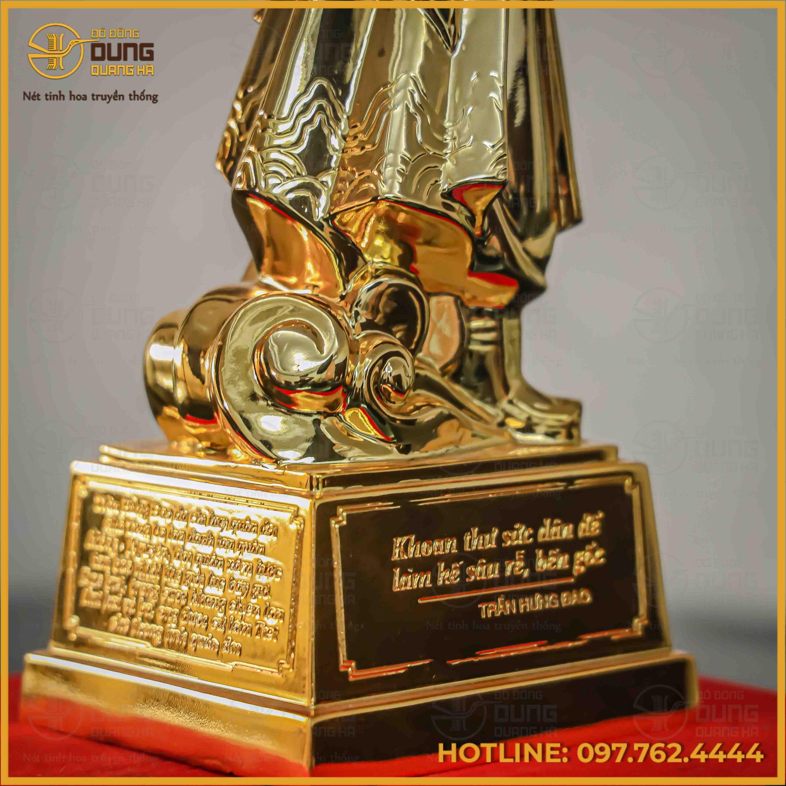 Tượng Trần Hưng Đạo đồng vàng mạ vàng là sự kết tinh giữa tinh thần dân tộc bất khuất và nghệ thuật chế tác thủ công tinh xảo. Từng đường nét không chỉ tái hiện chân dung vị anh hùng kiệt xuất mà còn truyền tải khí chất uy nghi, chính trực – biểu tượng cho trí tuệ và bản lĩnh của bậc vĩ nhân trong lịch sử.