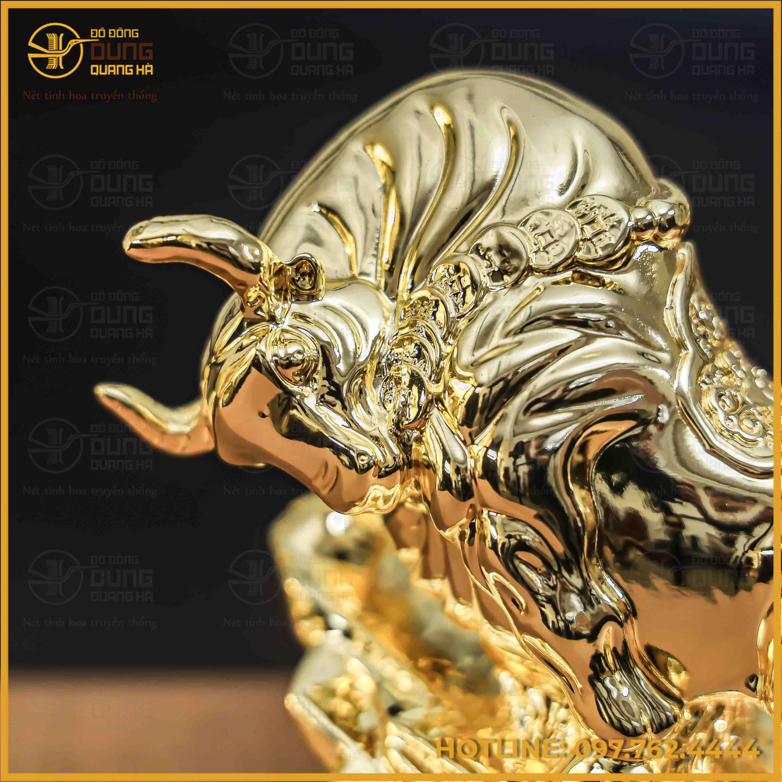 Tượng trâu gây ấn tượng mạnh bởi sắc vàng kim rực rỡ, được tạo nên từ lớp mạ vàng cao cấp phủ đều lên toàn bộ bề mặt đồng. Độ bóng gương của sản phẩm giúp phản chiếu ánh sáng đa chiều, làm nổi bật những khối cơ bắp cuồn cuộn và đường nét chạm trổ uy nghi. Gam màu vàng sáng lộng lẫy này không chỉ mang đến vẻ đẹp vương giả mà còn tượng trưng cho sự thịnh vượng và bền vững theo thời gian.