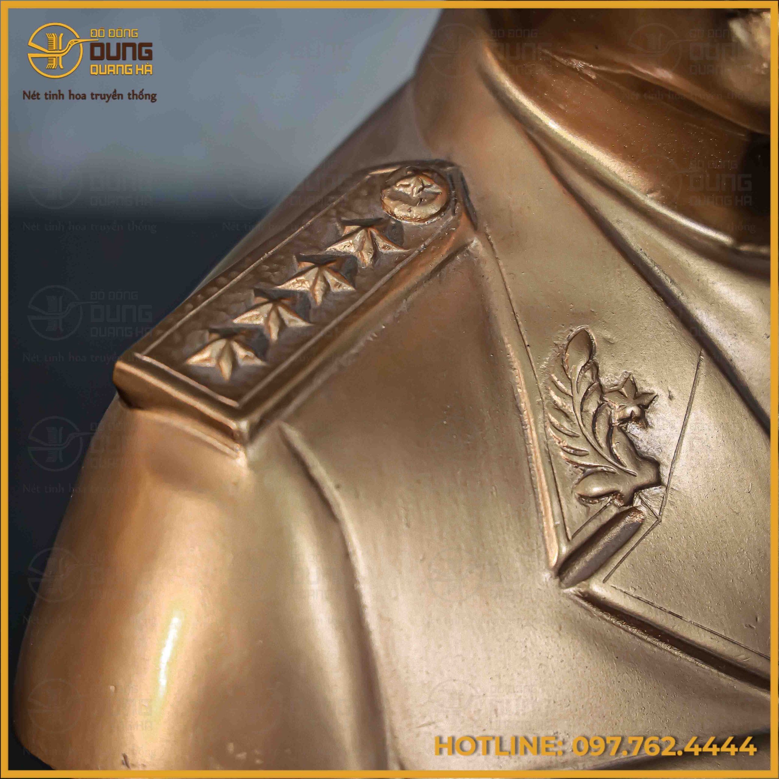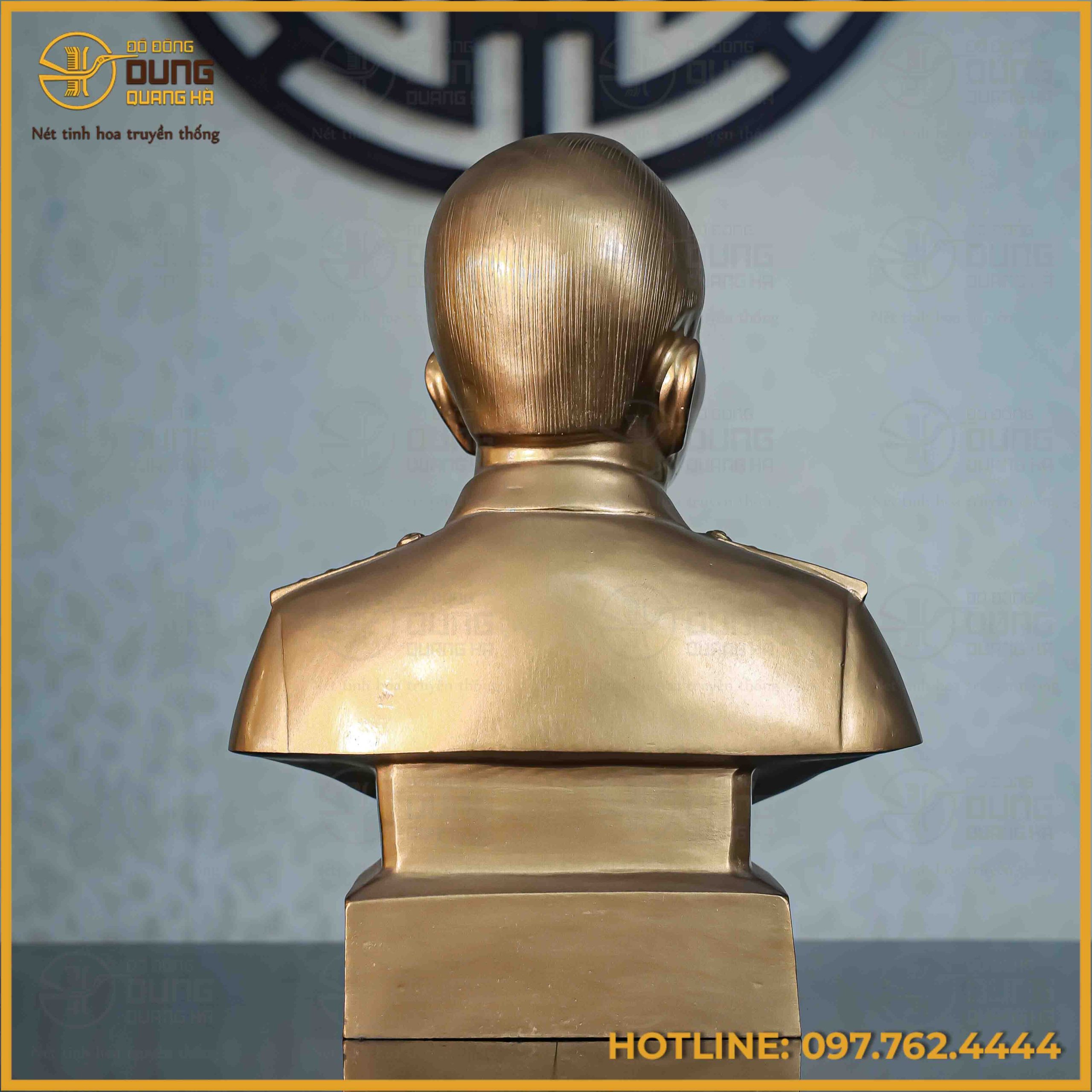 Phần thân tượng tái hiện hình ảnh Bác trong bộ quân phục chỉnh tề, từng chi tiết như ve áo, cầu vai, hàng cúc áo hay nếp gấp vải đều được xử lý tinh tế, tạo cảm giác mềm mại như thật. Tư thế bán thân vững chãi, dáng đứng hiên ngang mang lại cảm giác uy nghi nhưng vẫn rất gần gũi, giản dị – đúng với phong thái của một vị tướng của nhân dân.